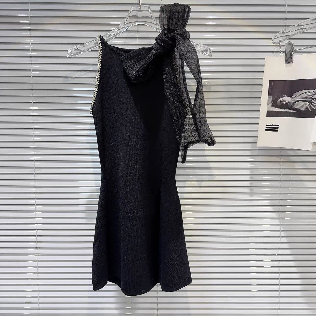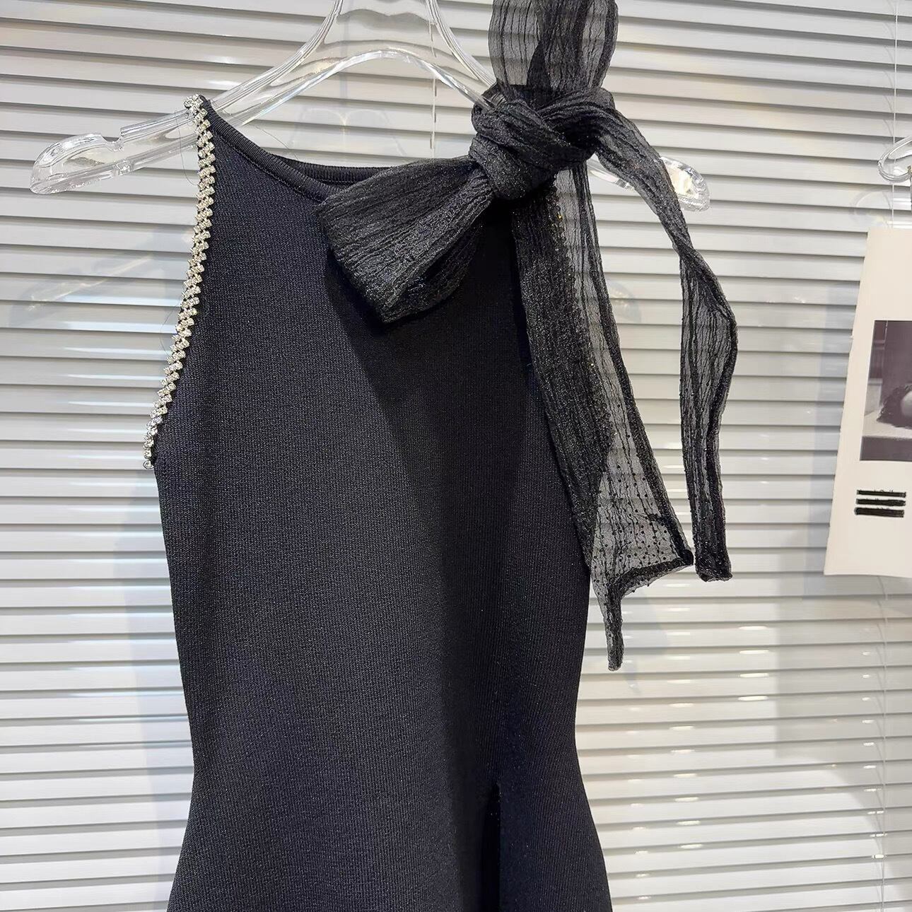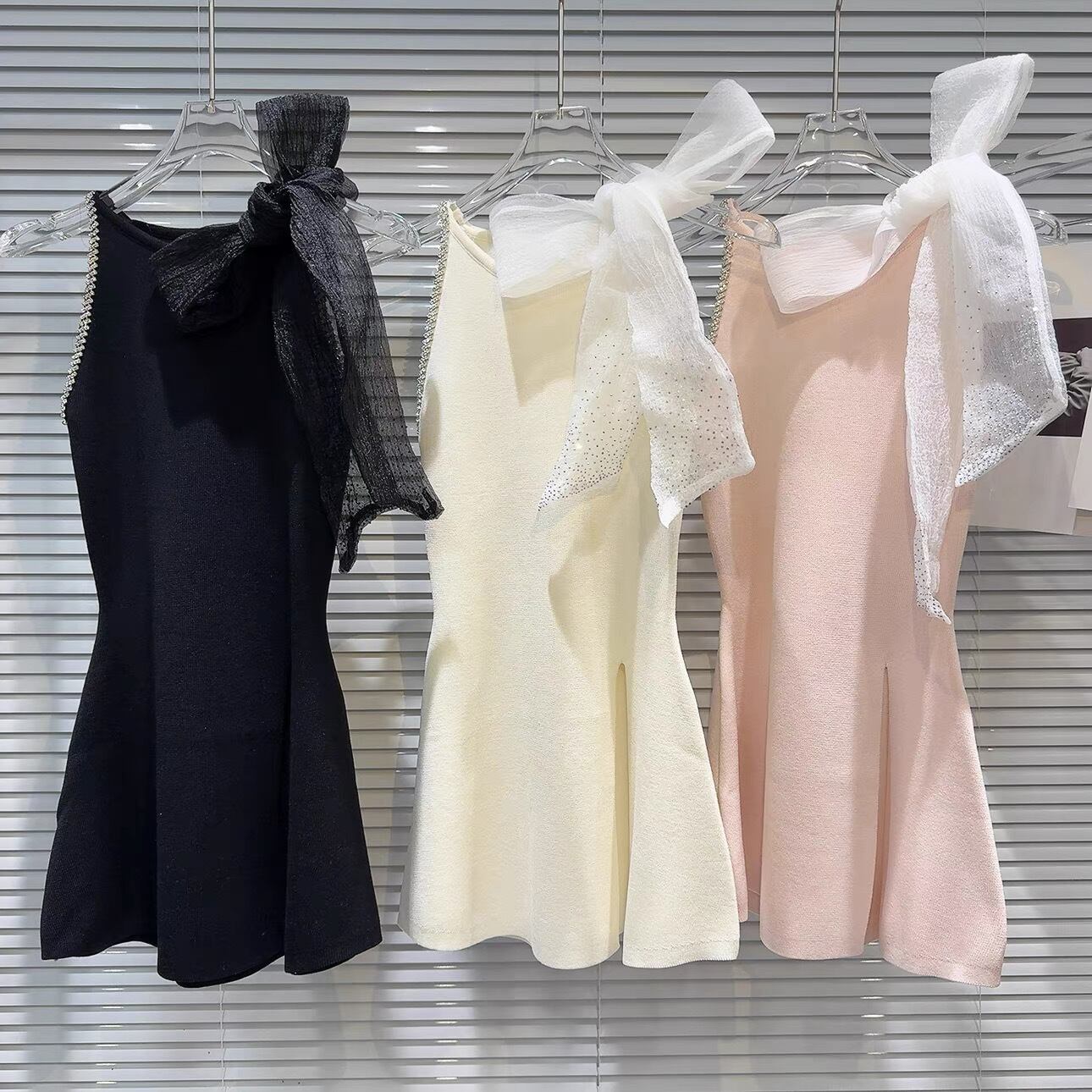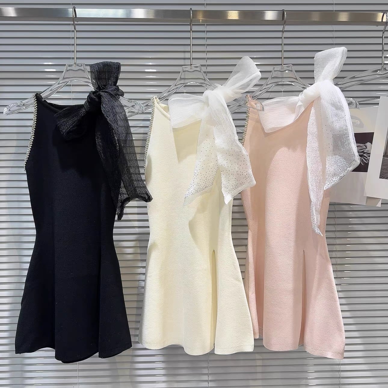 【tops】スリット入りリボンビジューニットトップス3色 OR0166