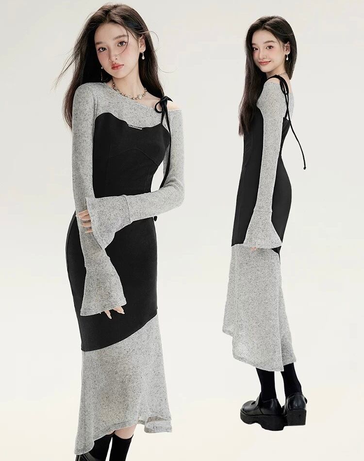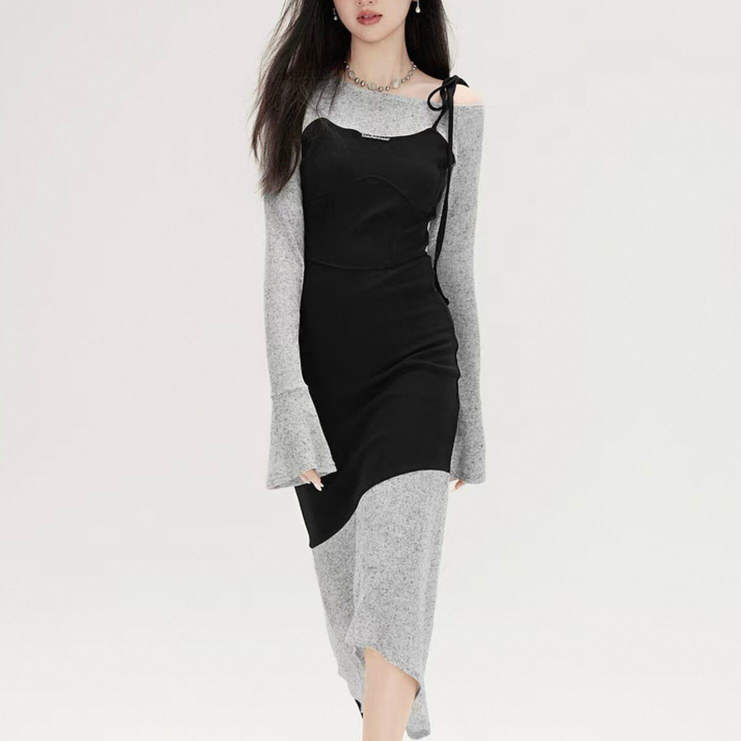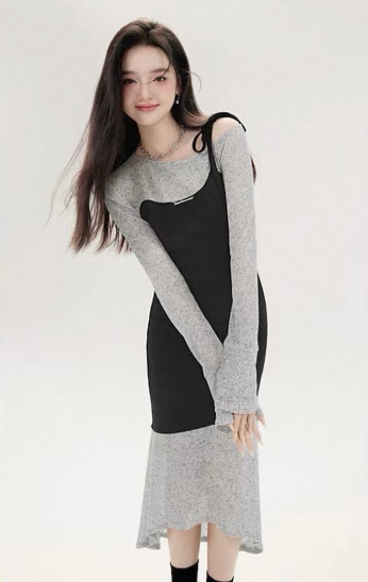 【dress】レイヤード重ね着風長袖タイトロングワンピース KQ0370