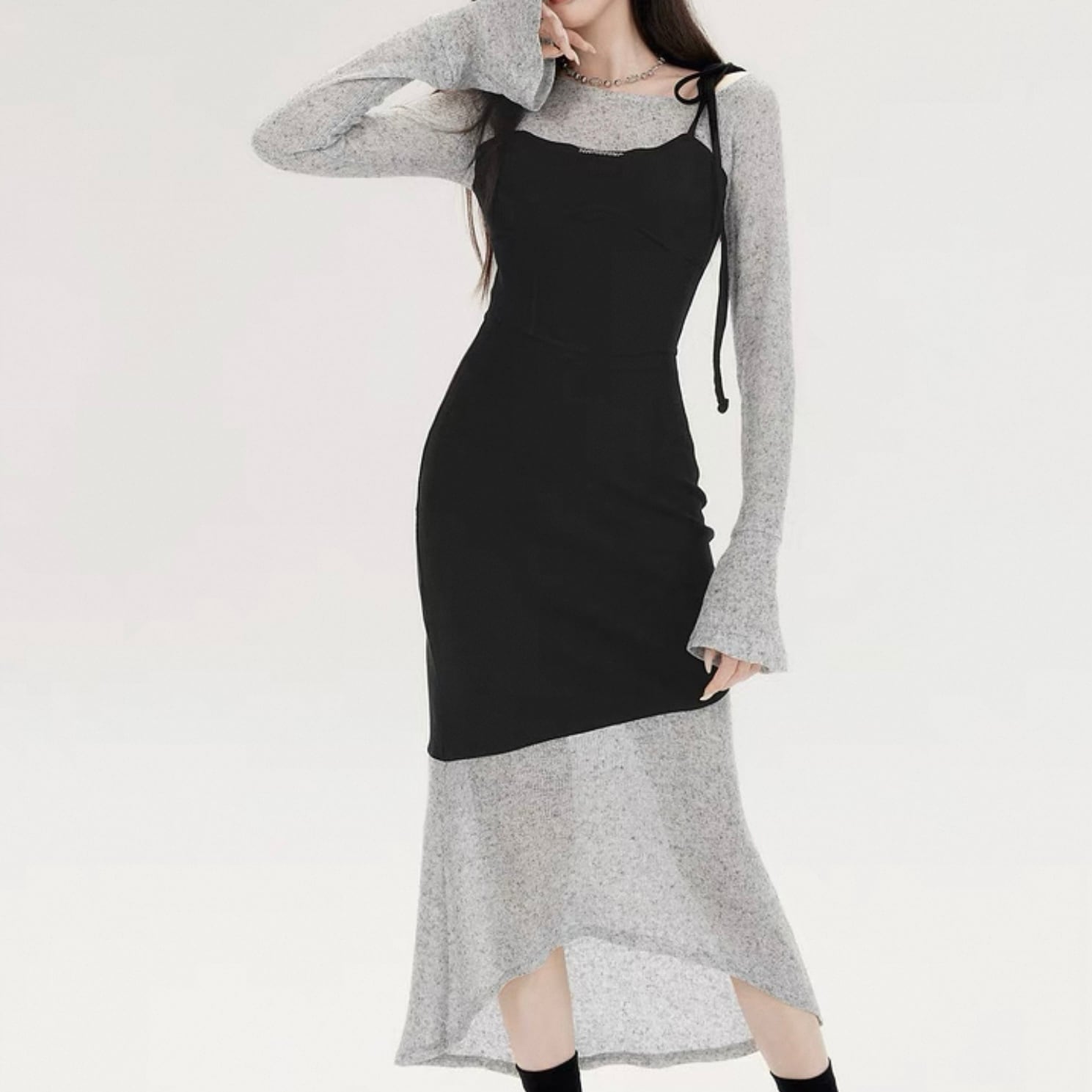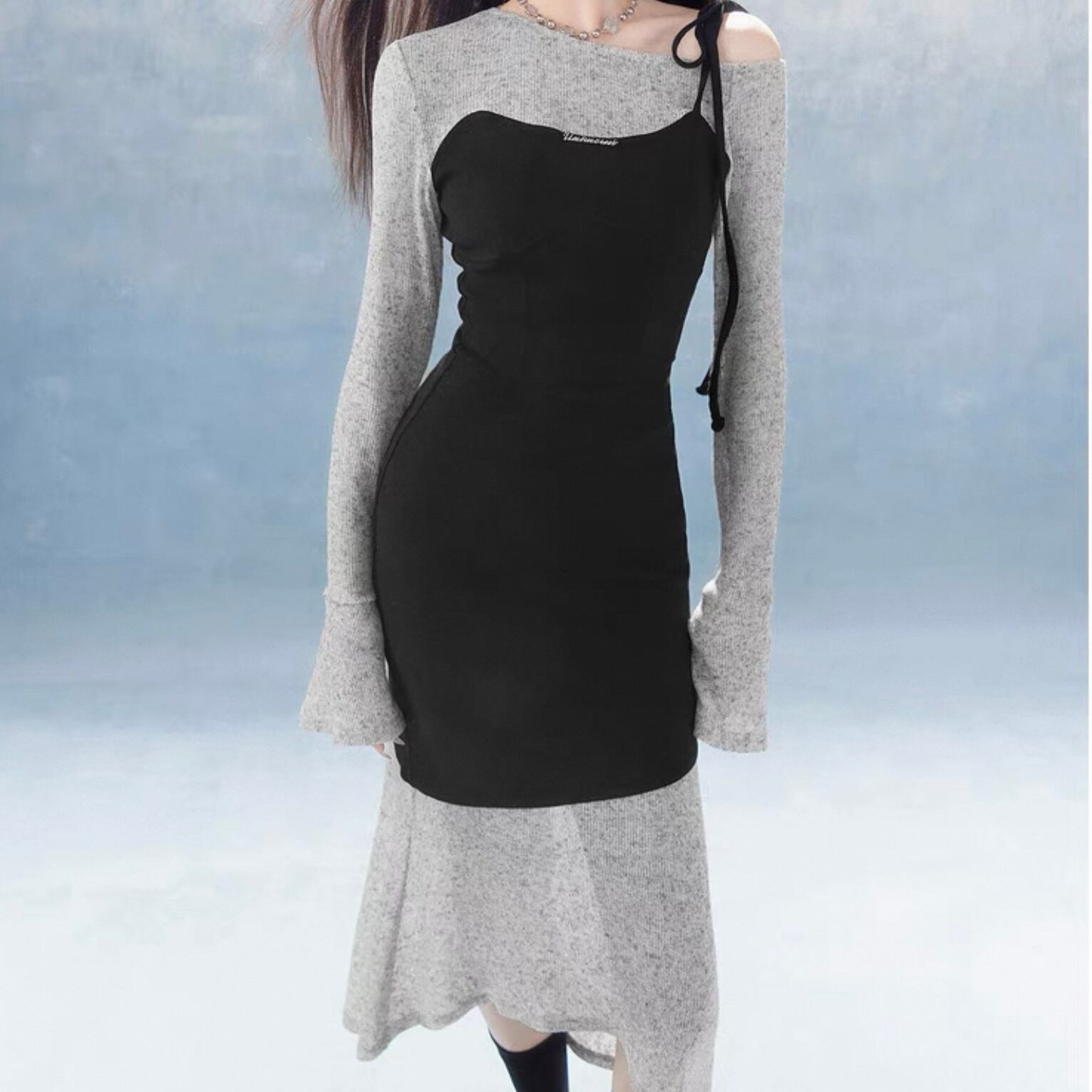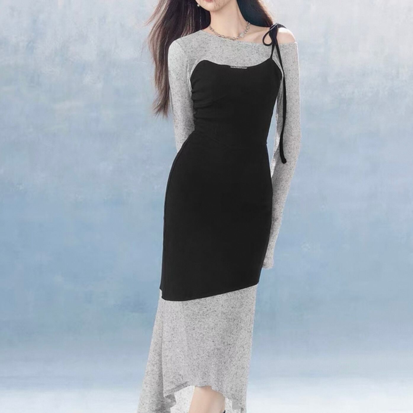 【dress】レイヤード重ね着風長袖タイトロングワンピース KQ0370