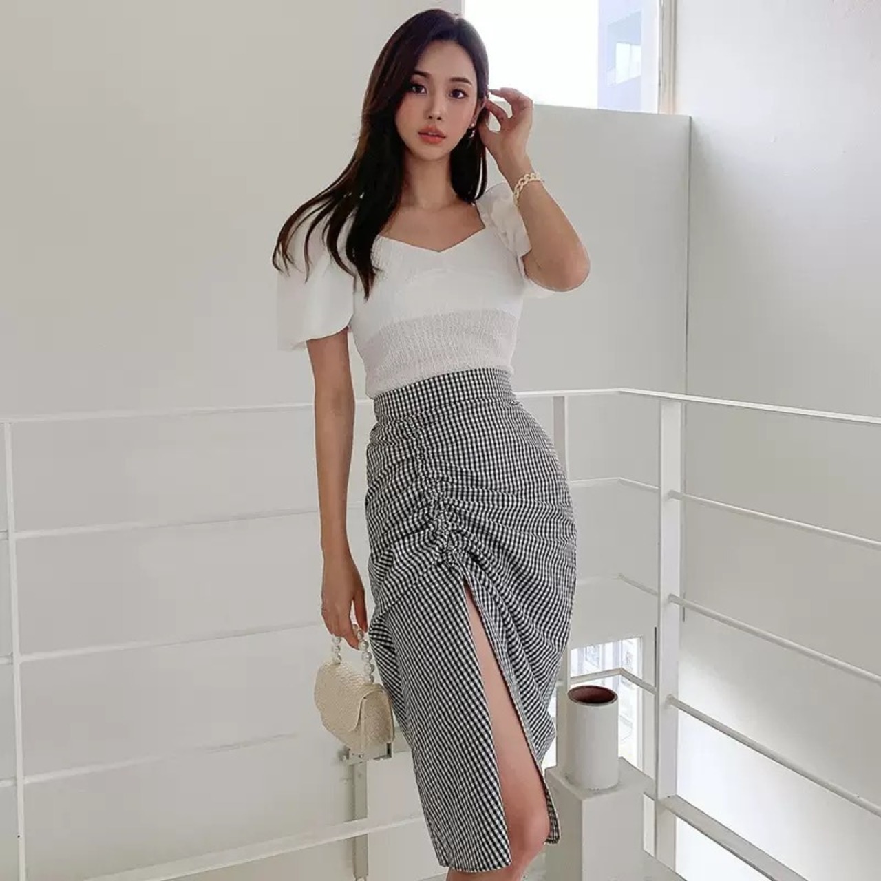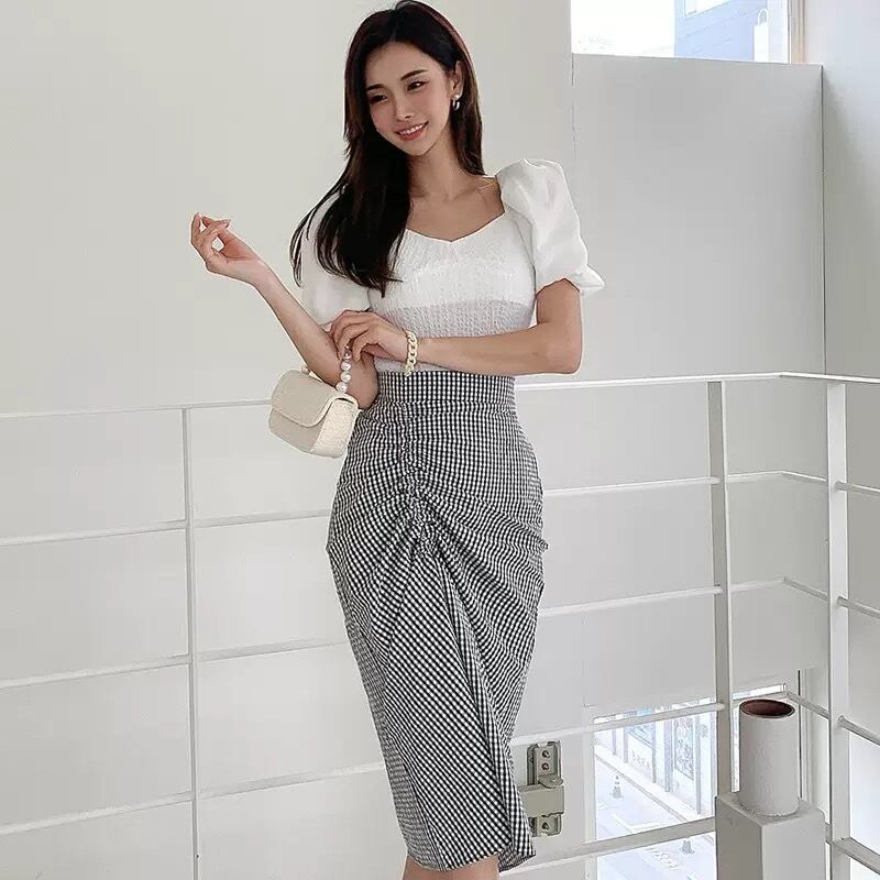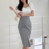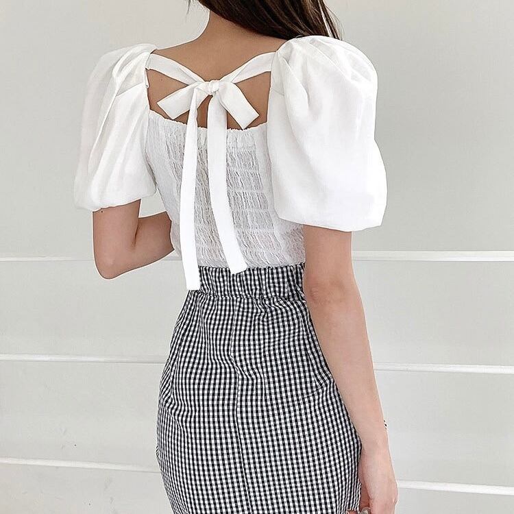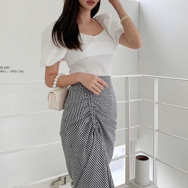 【set】バックリボントップスx不規則ギンガムチェックスカート MA0007