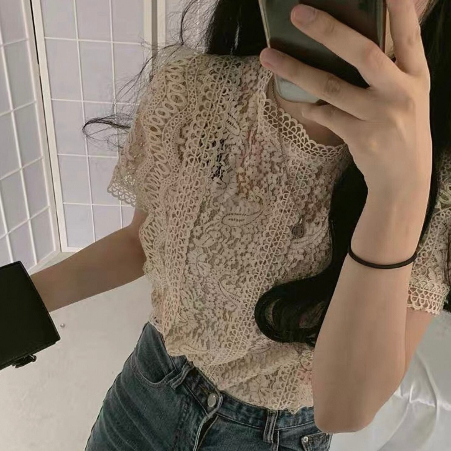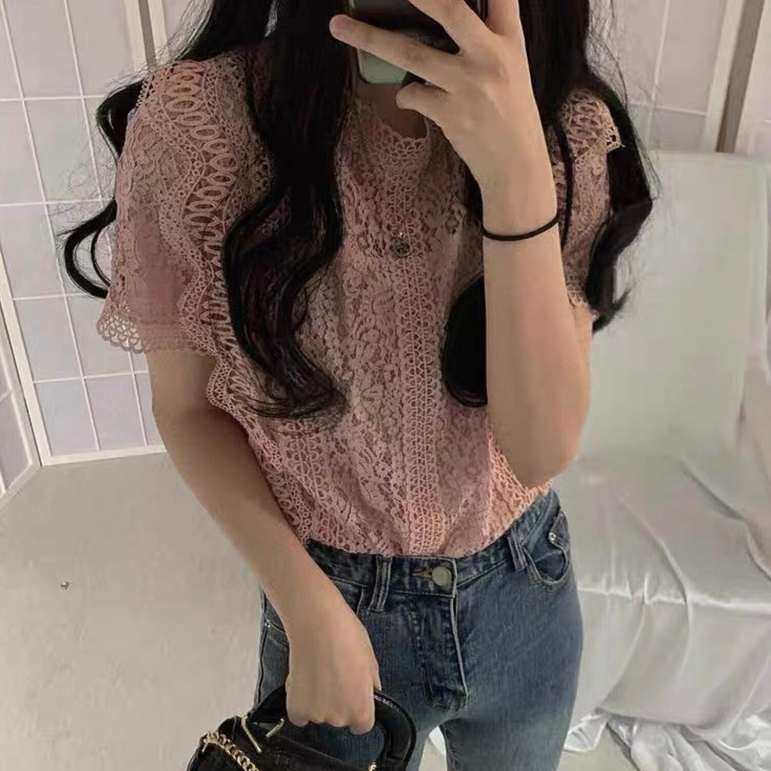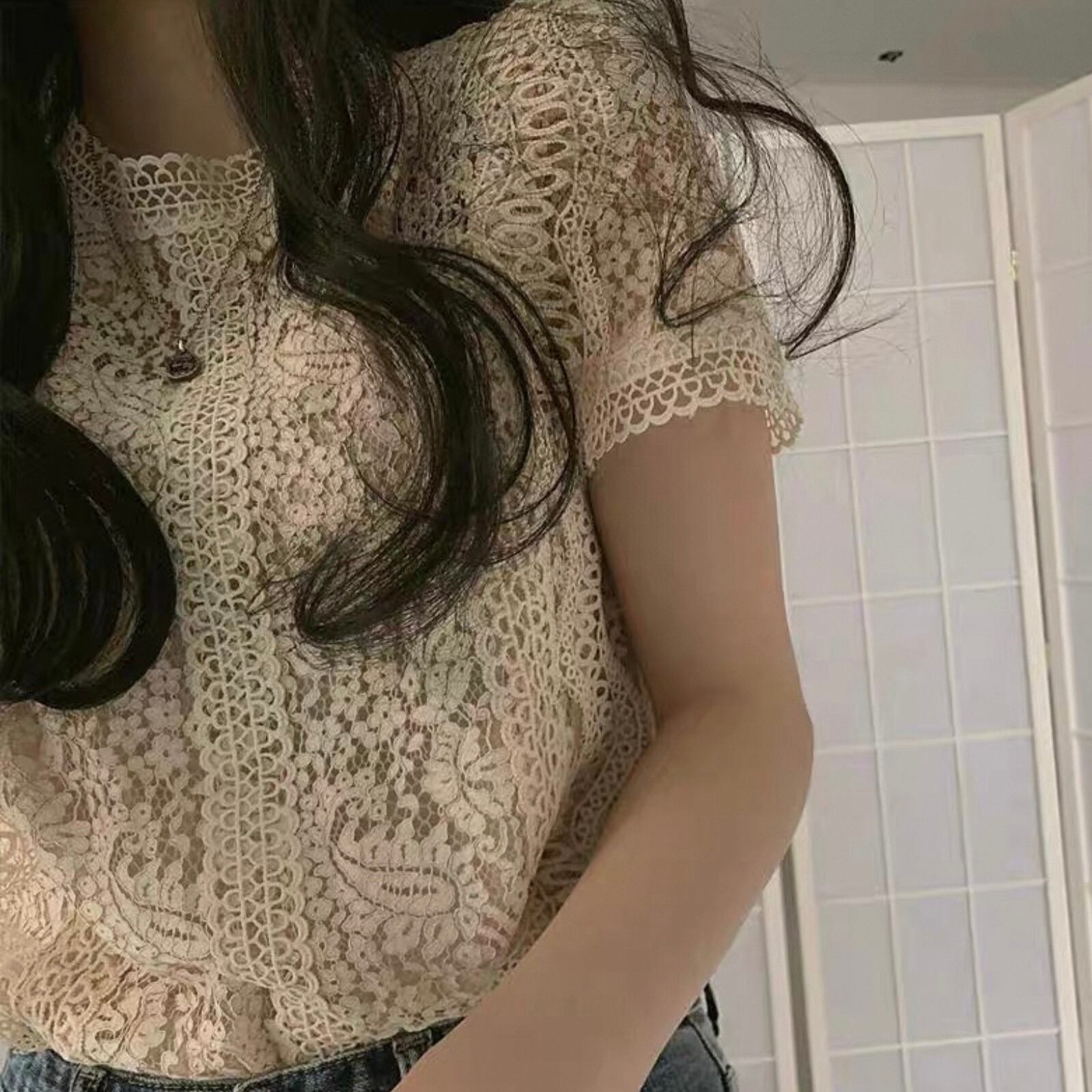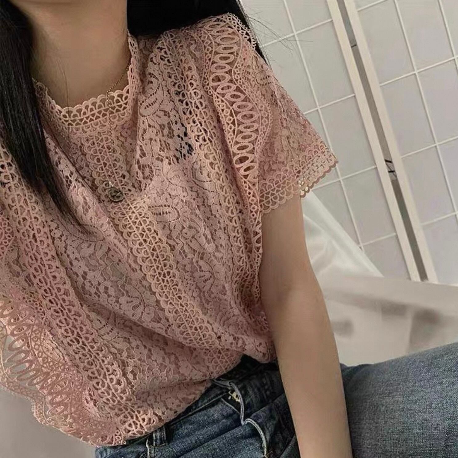 【tops】半袖シースルー刺繍トップス4色 HK0098