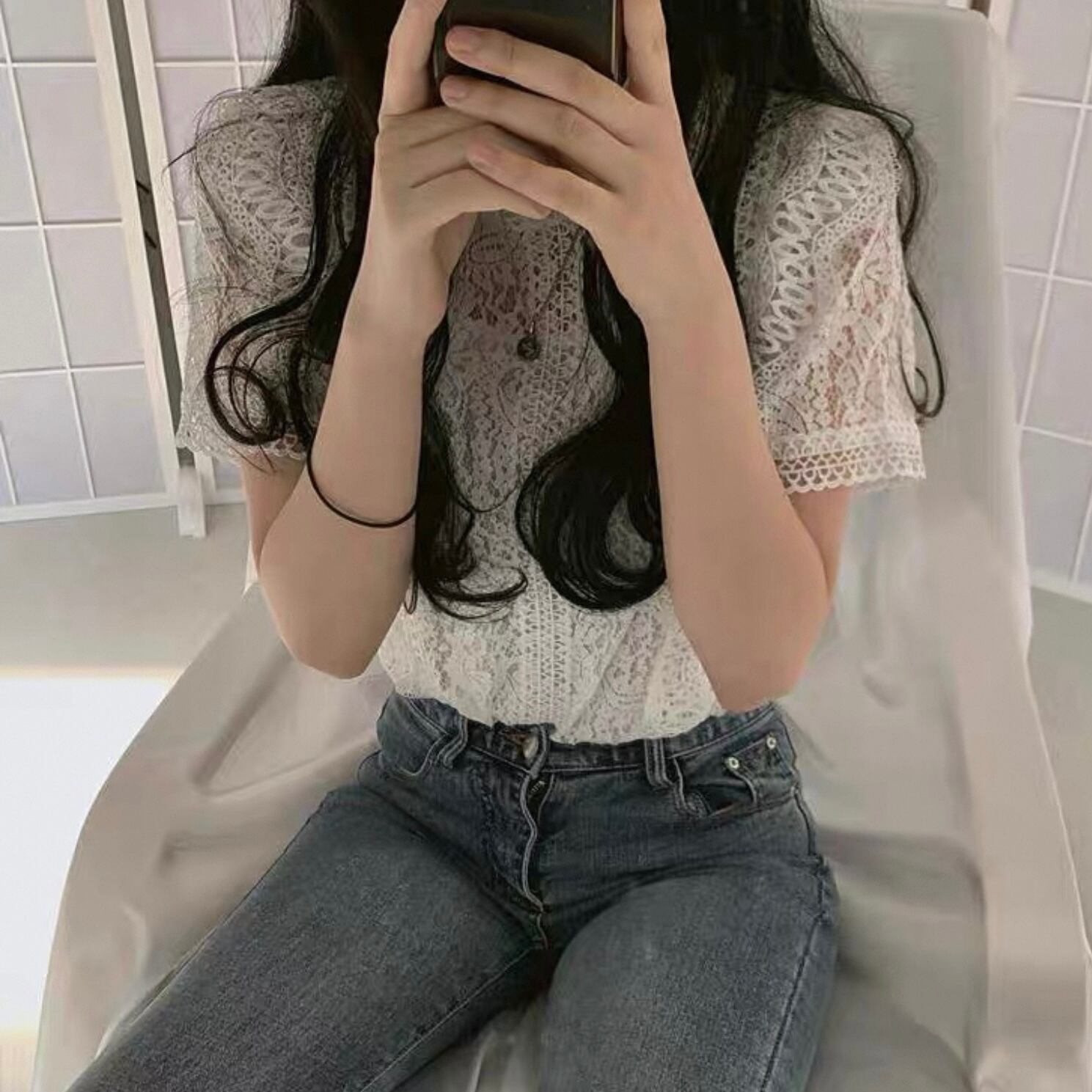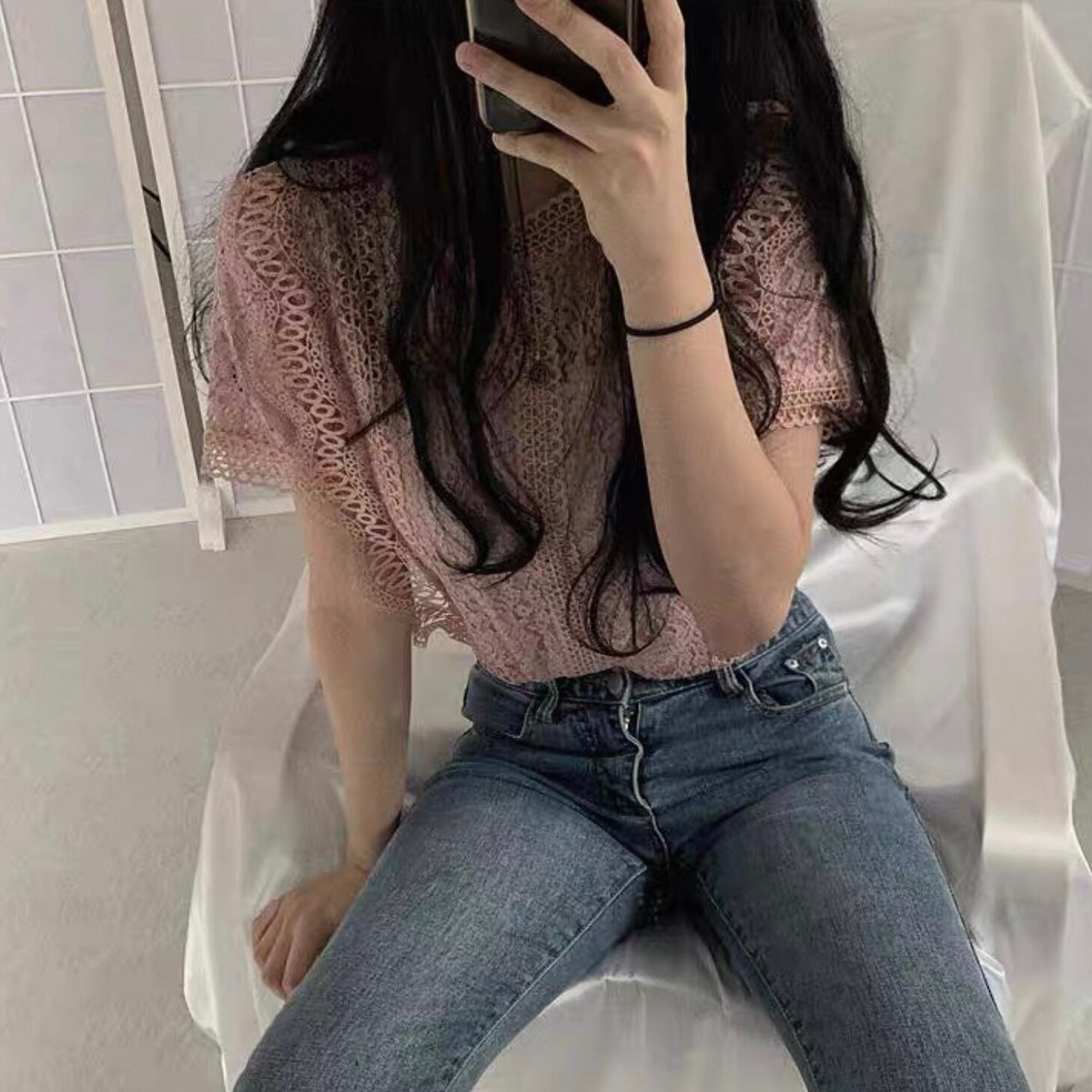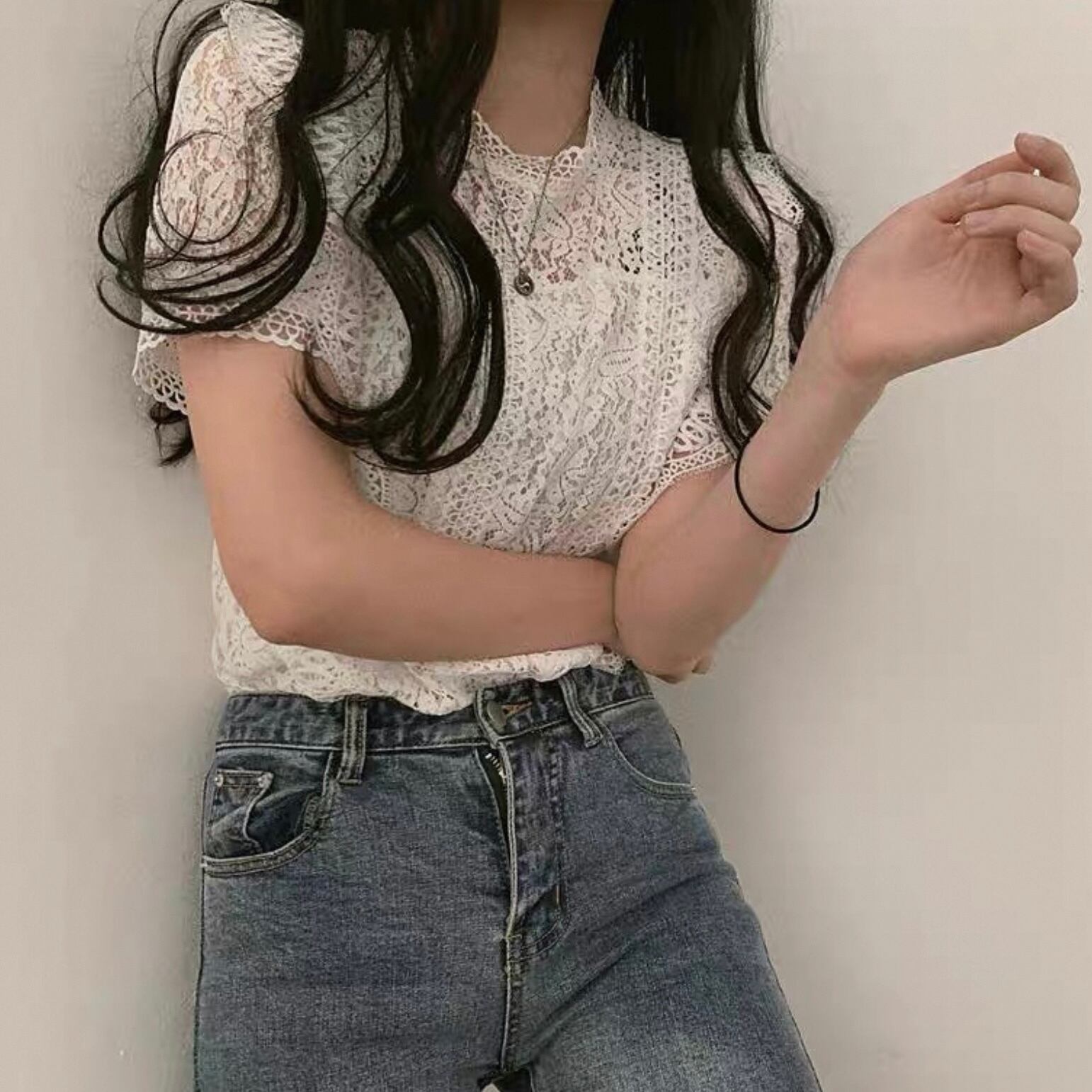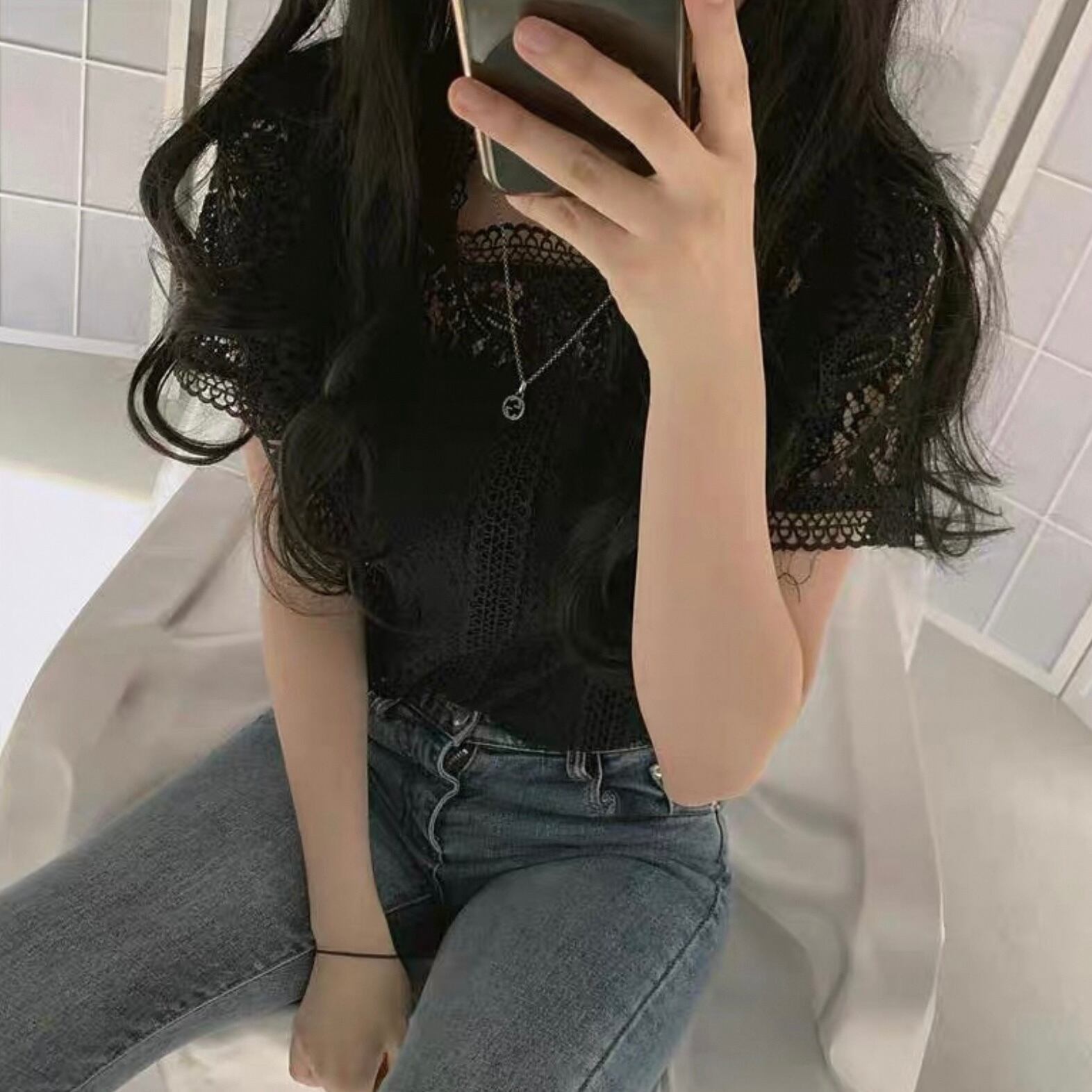 【tops】半袖シースルー刺繍トップス4色 HK0098