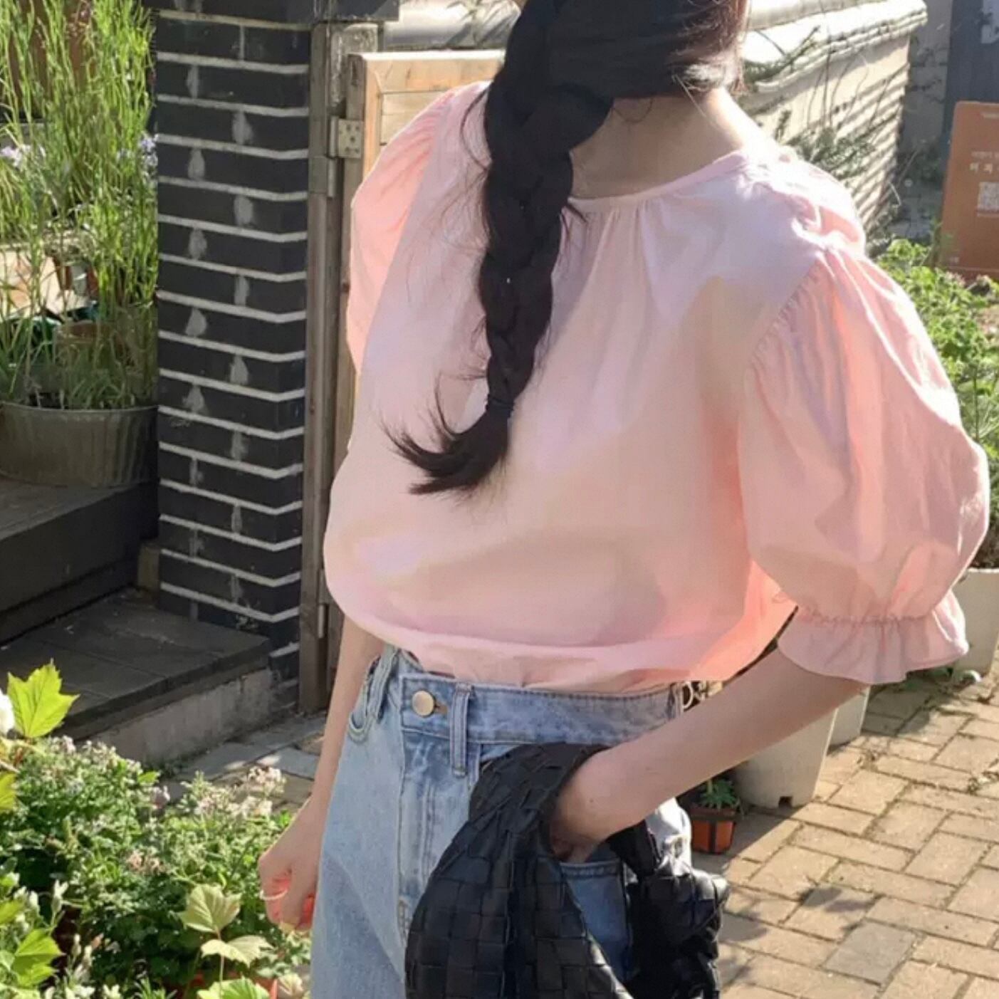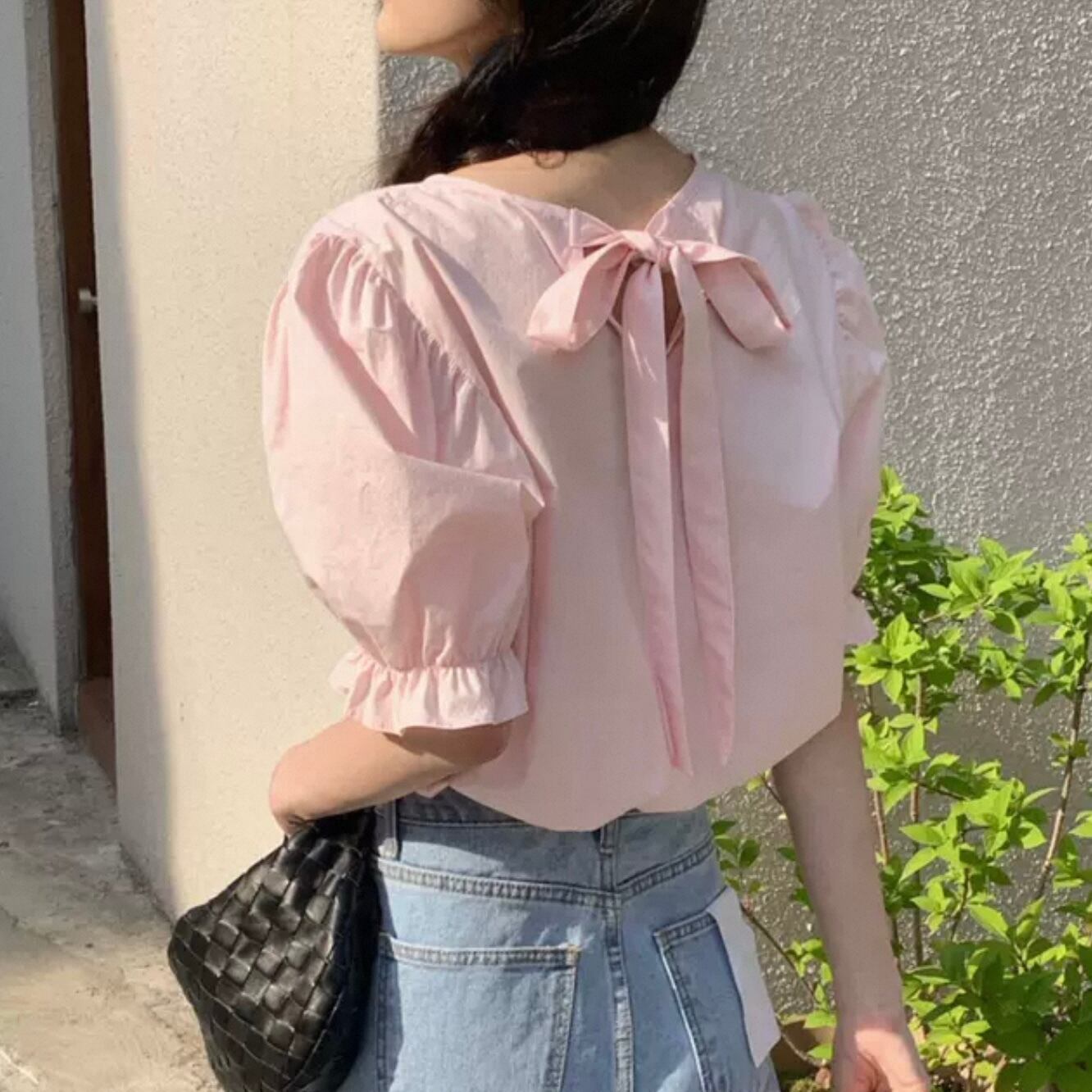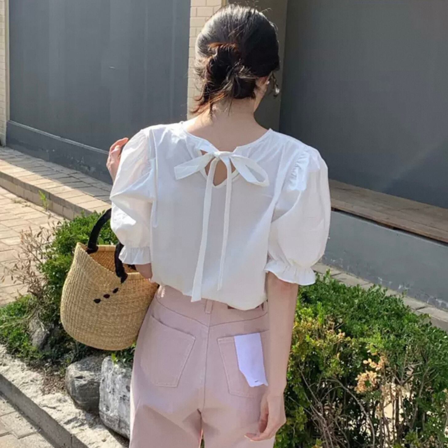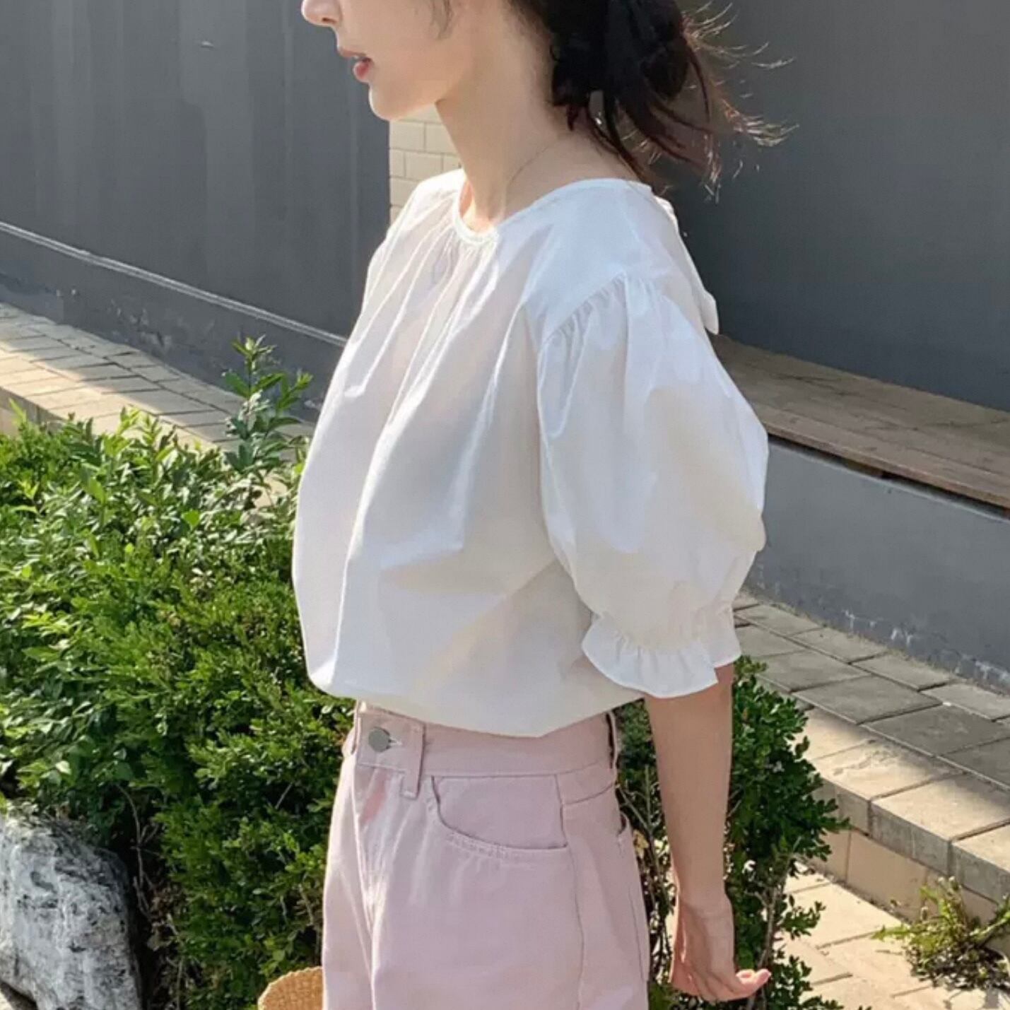 【tops】バックリボン半袖パフスリーブトップス2色 HK0120
