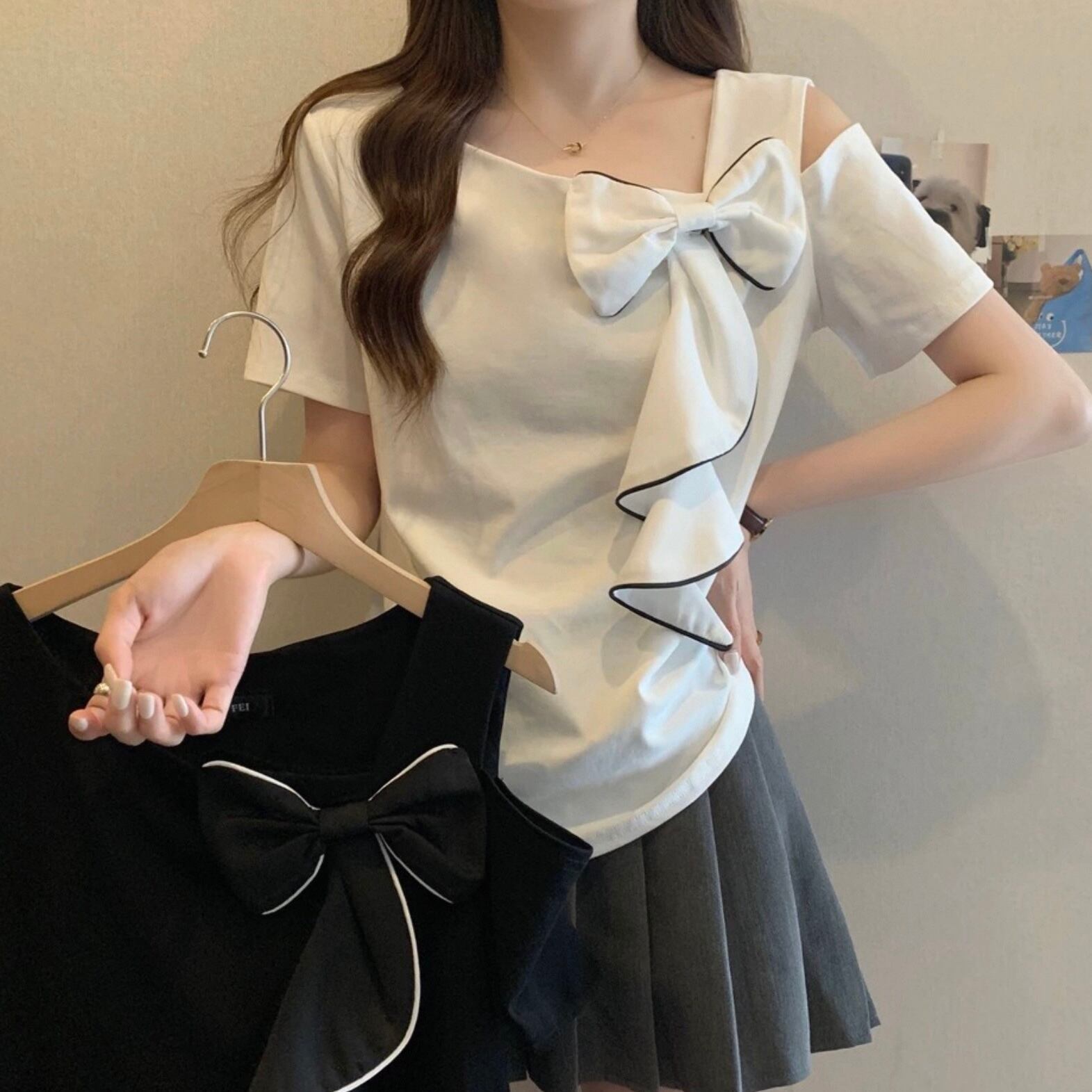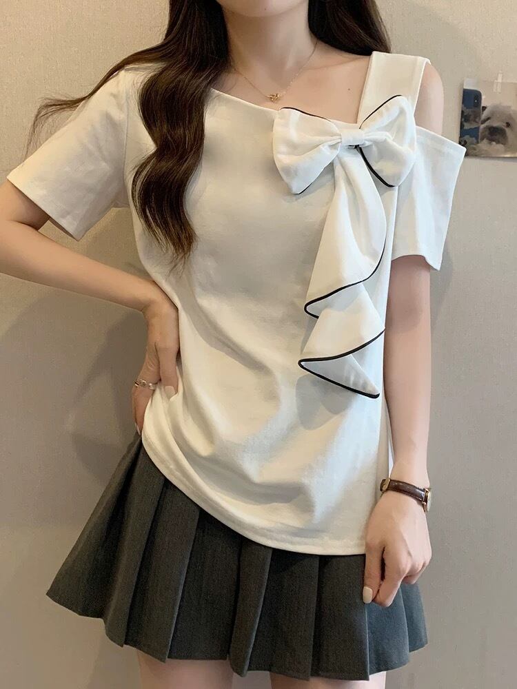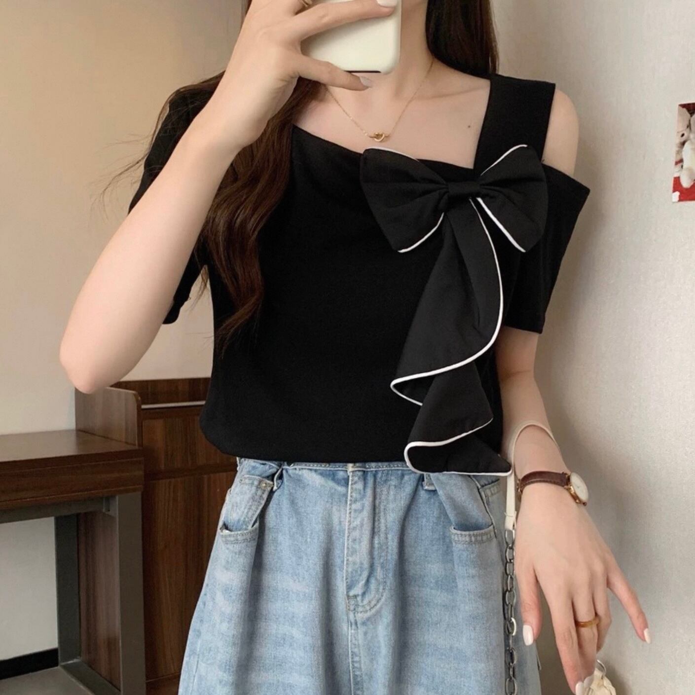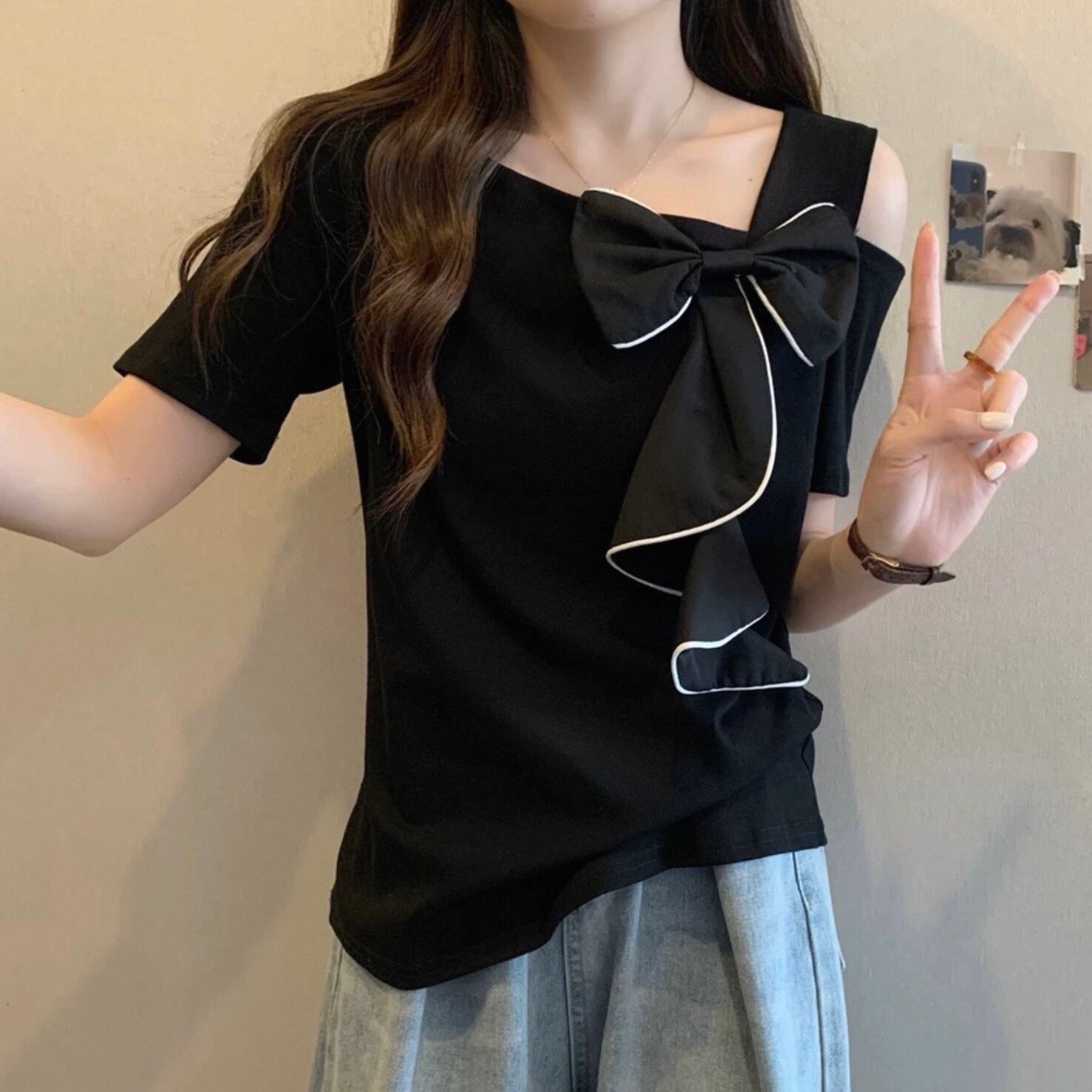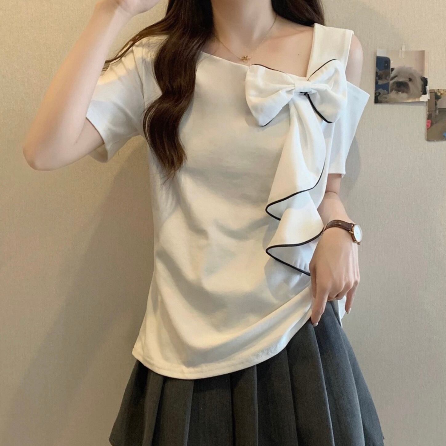 【tops】M〜4XLアシンメトリー袖リボントップス2色 HK0121