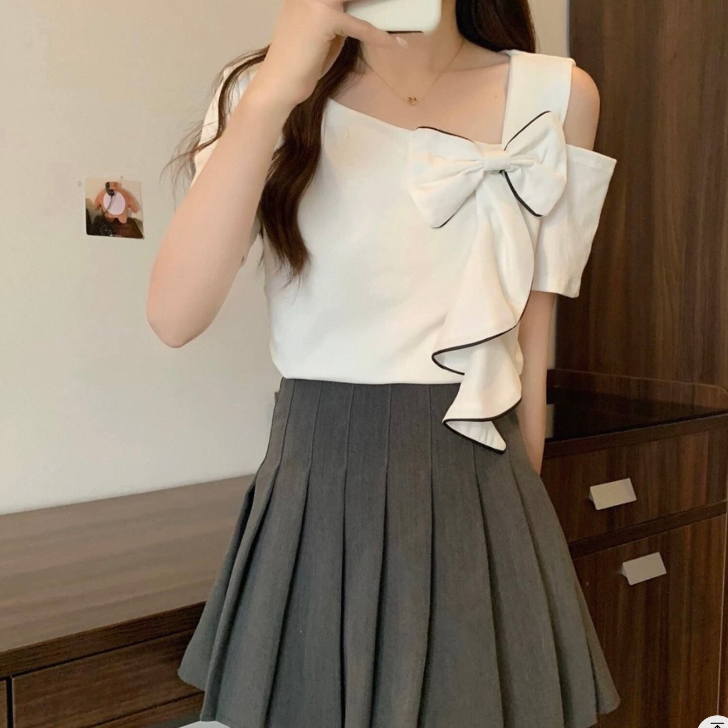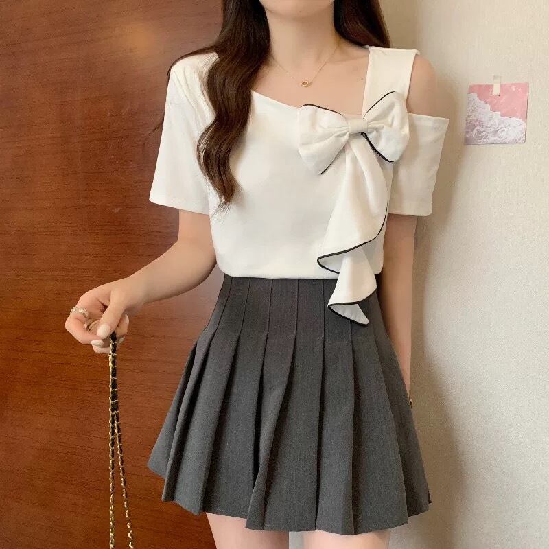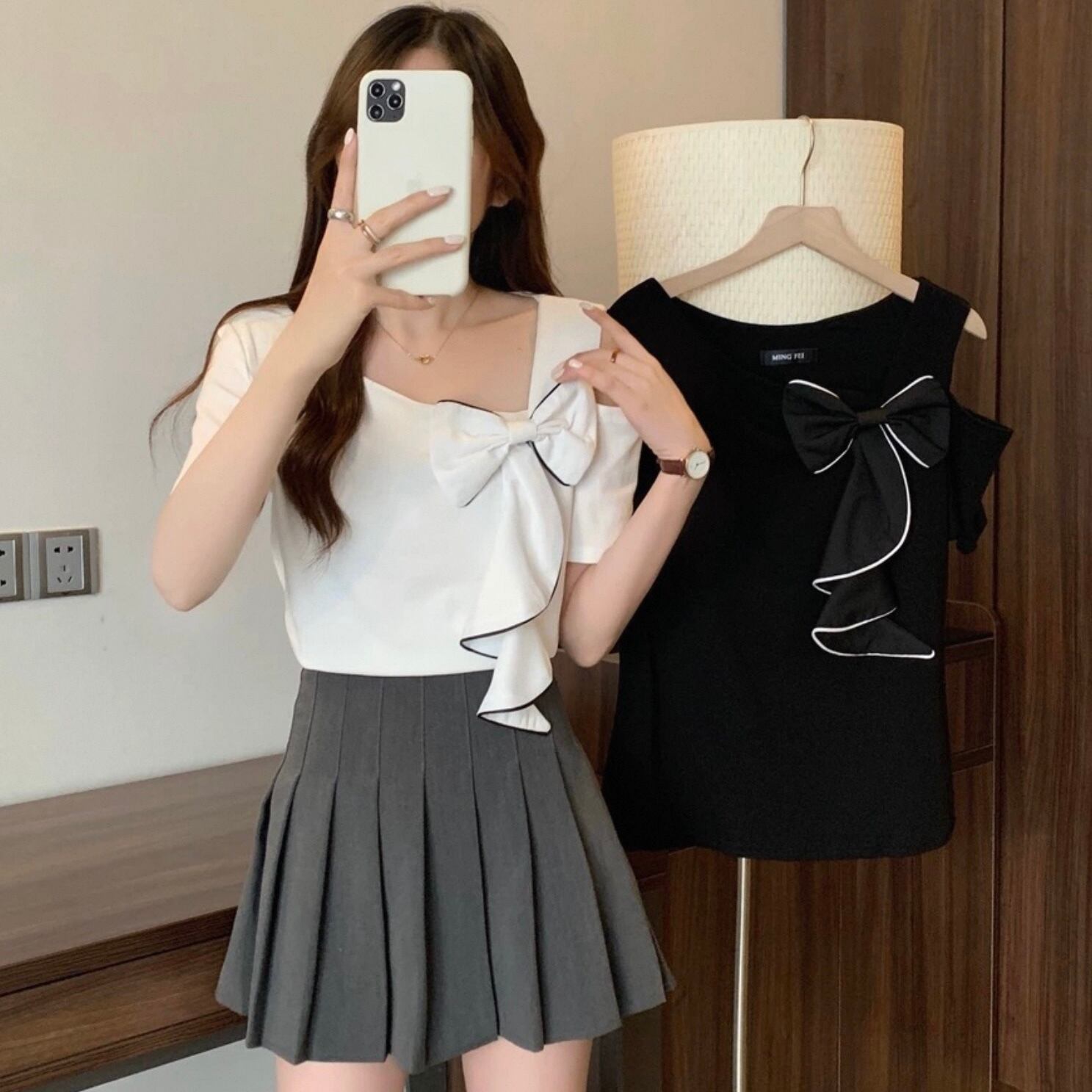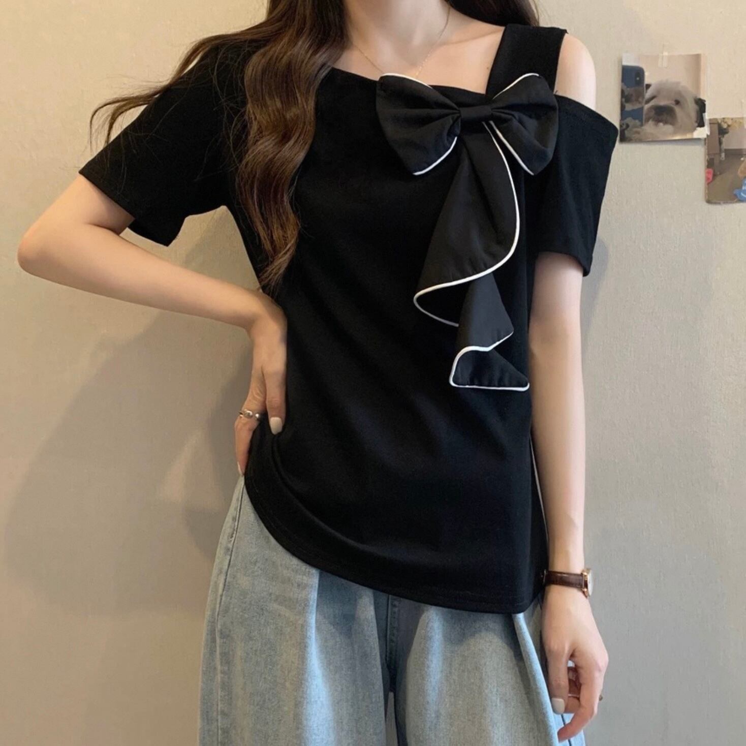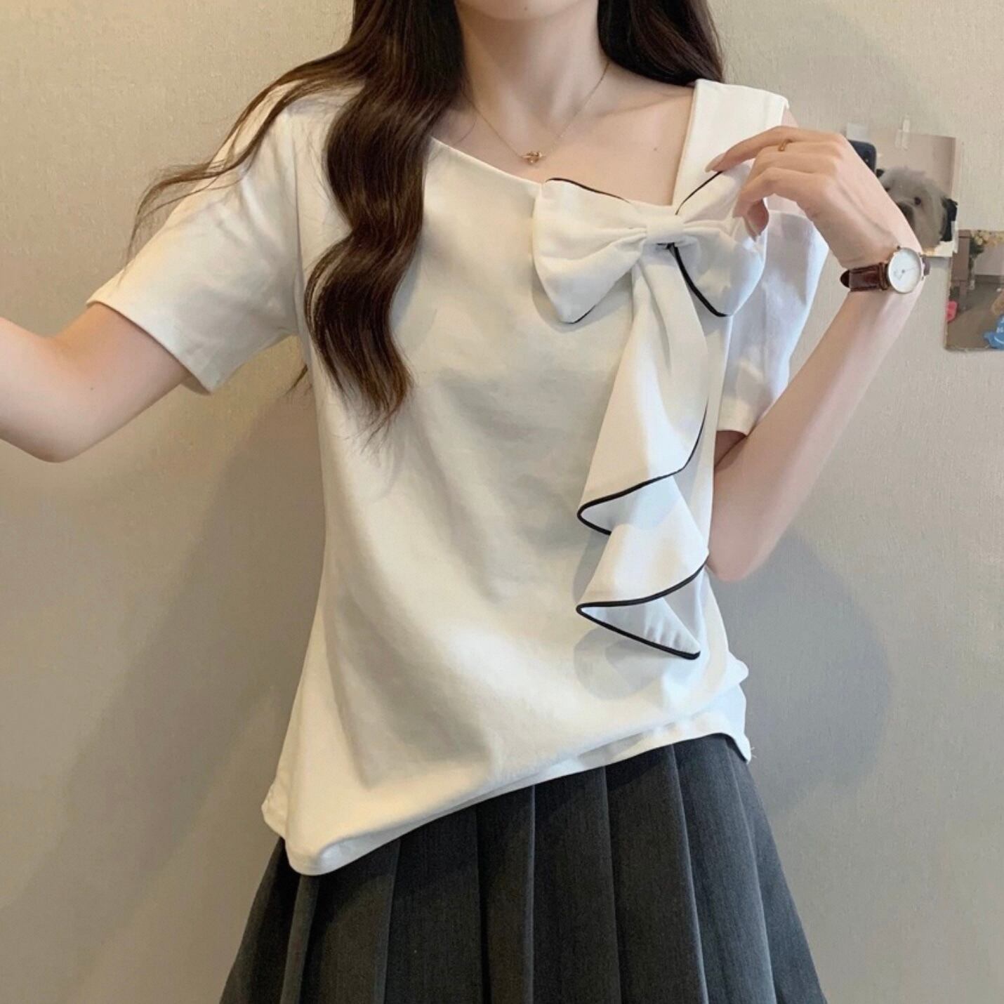 【tops】M〜4XLアシンメトリー袖リボントップス2色 HK0121