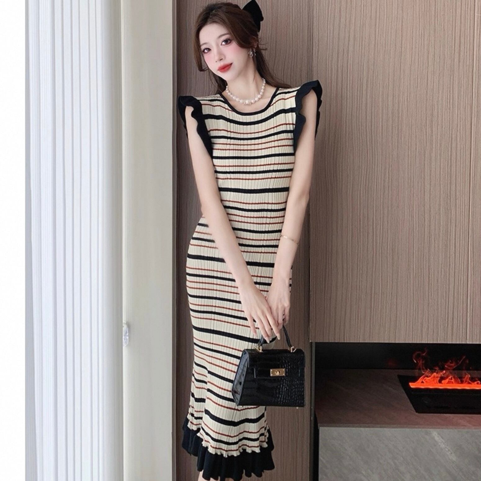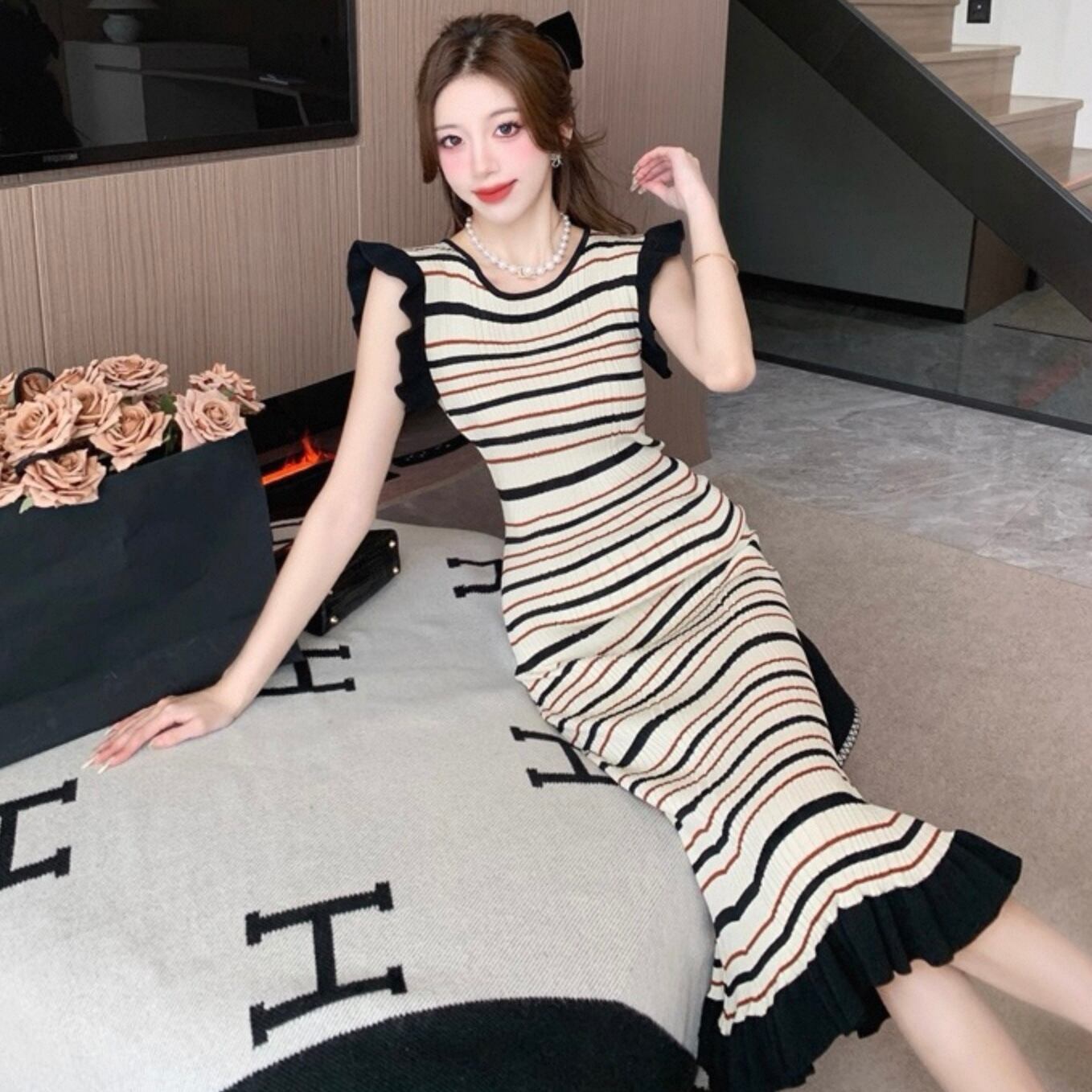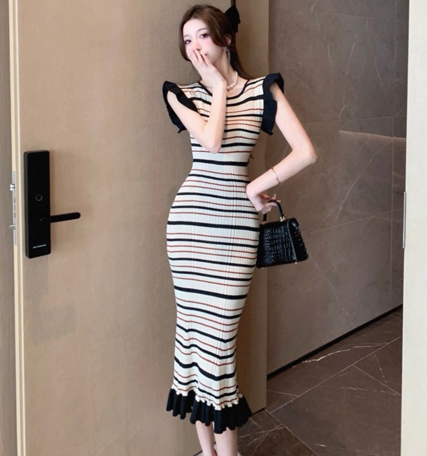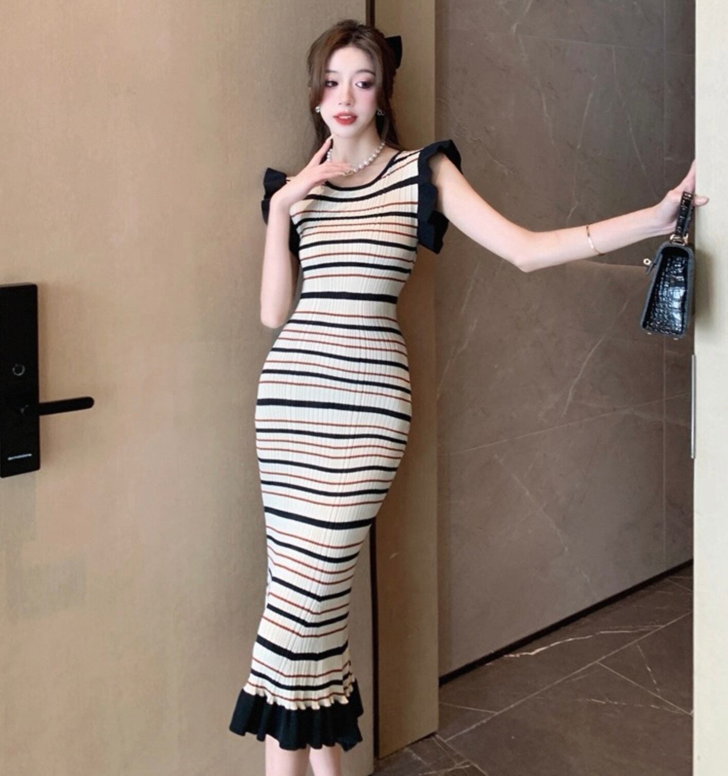 【dress】ボーダー柄フリル袖ワンピース HK0192