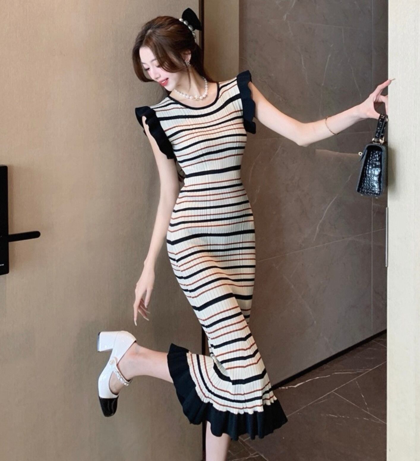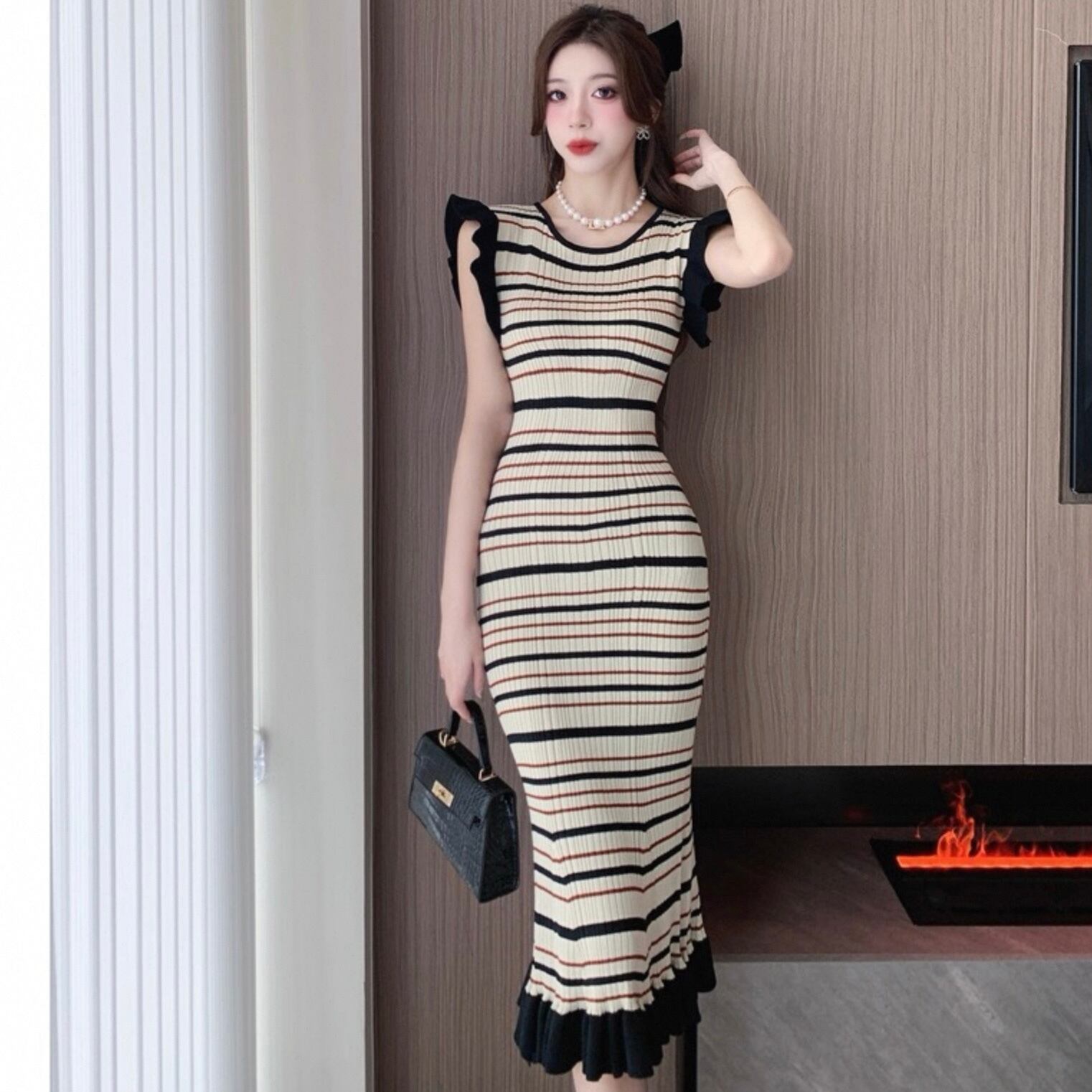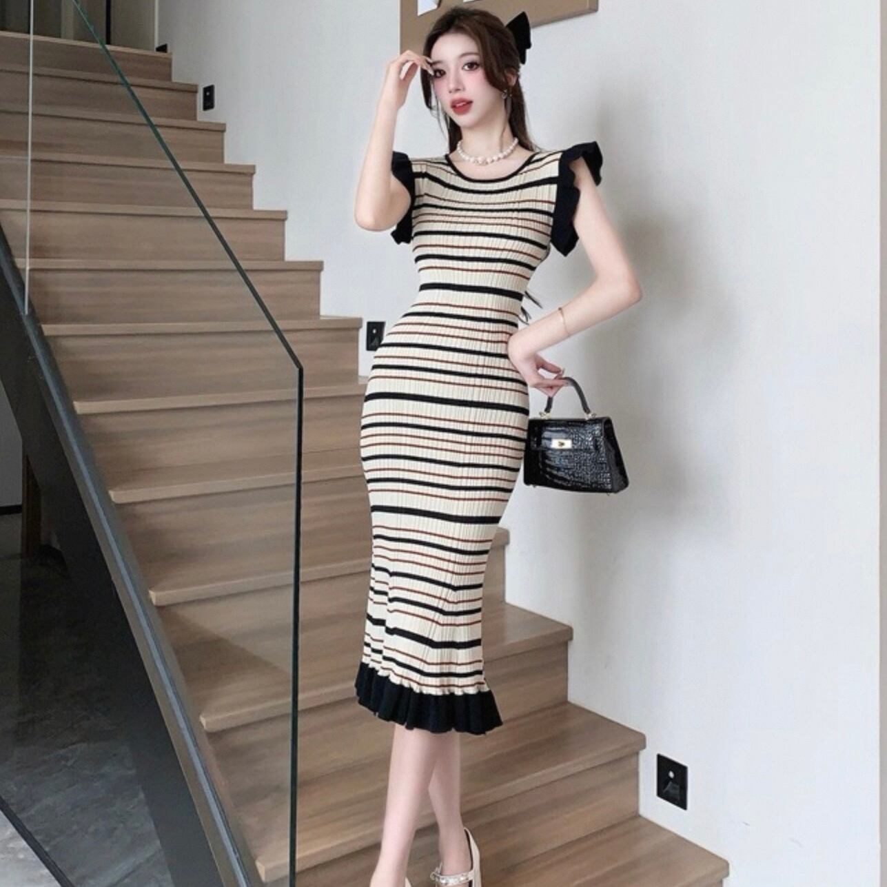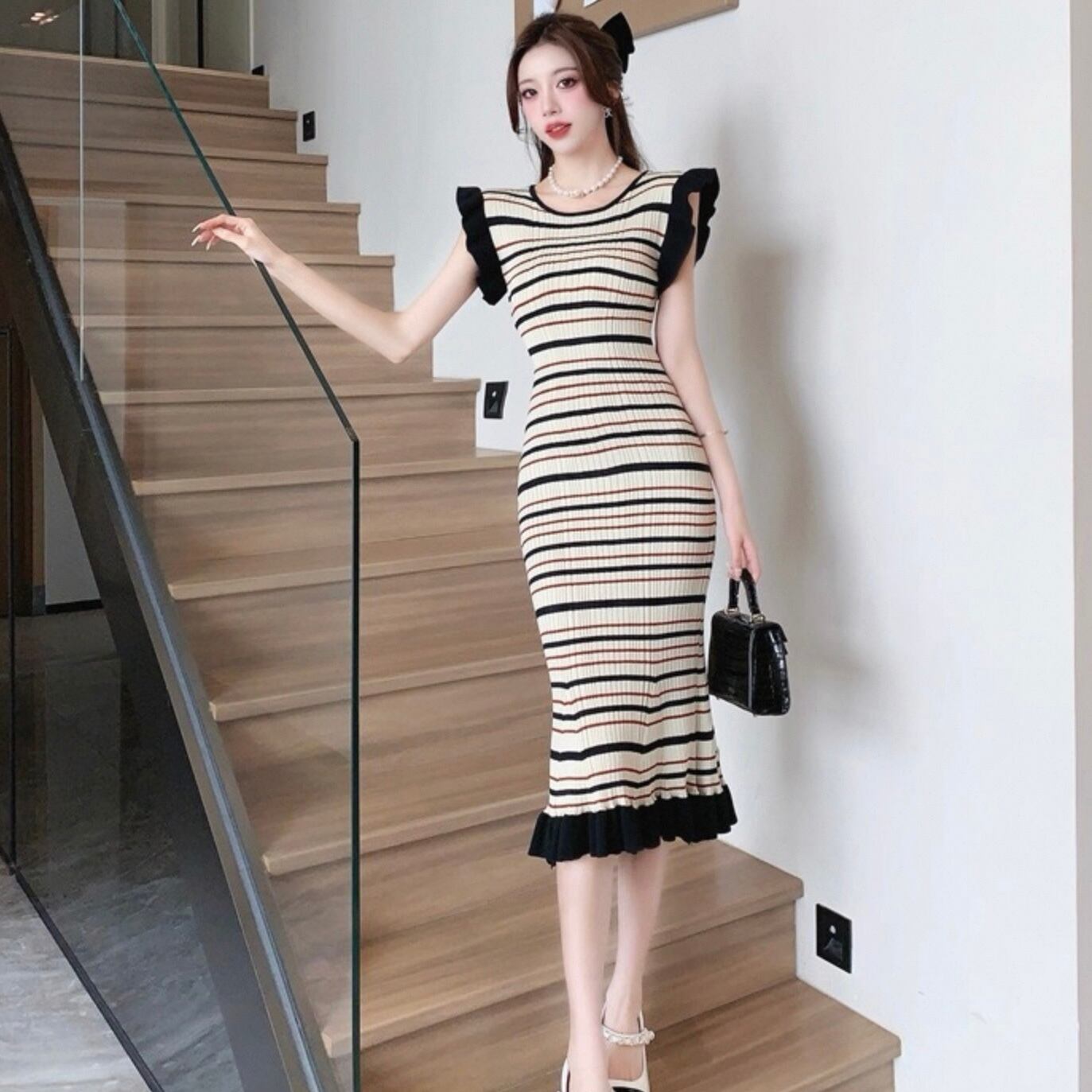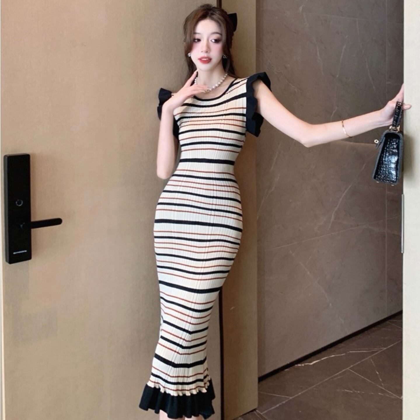 【dress】ボーダー柄フリル袖ワンピース HK0192