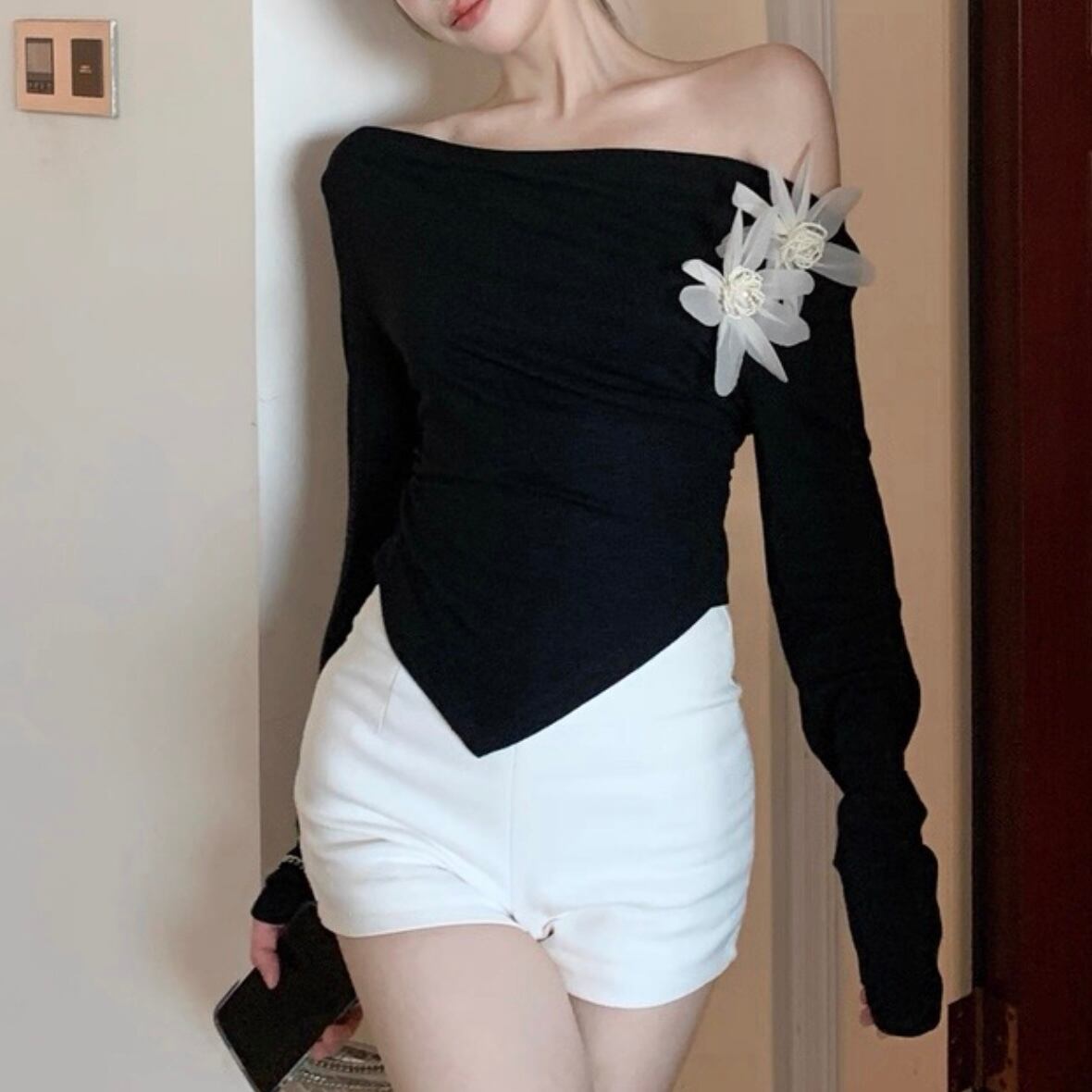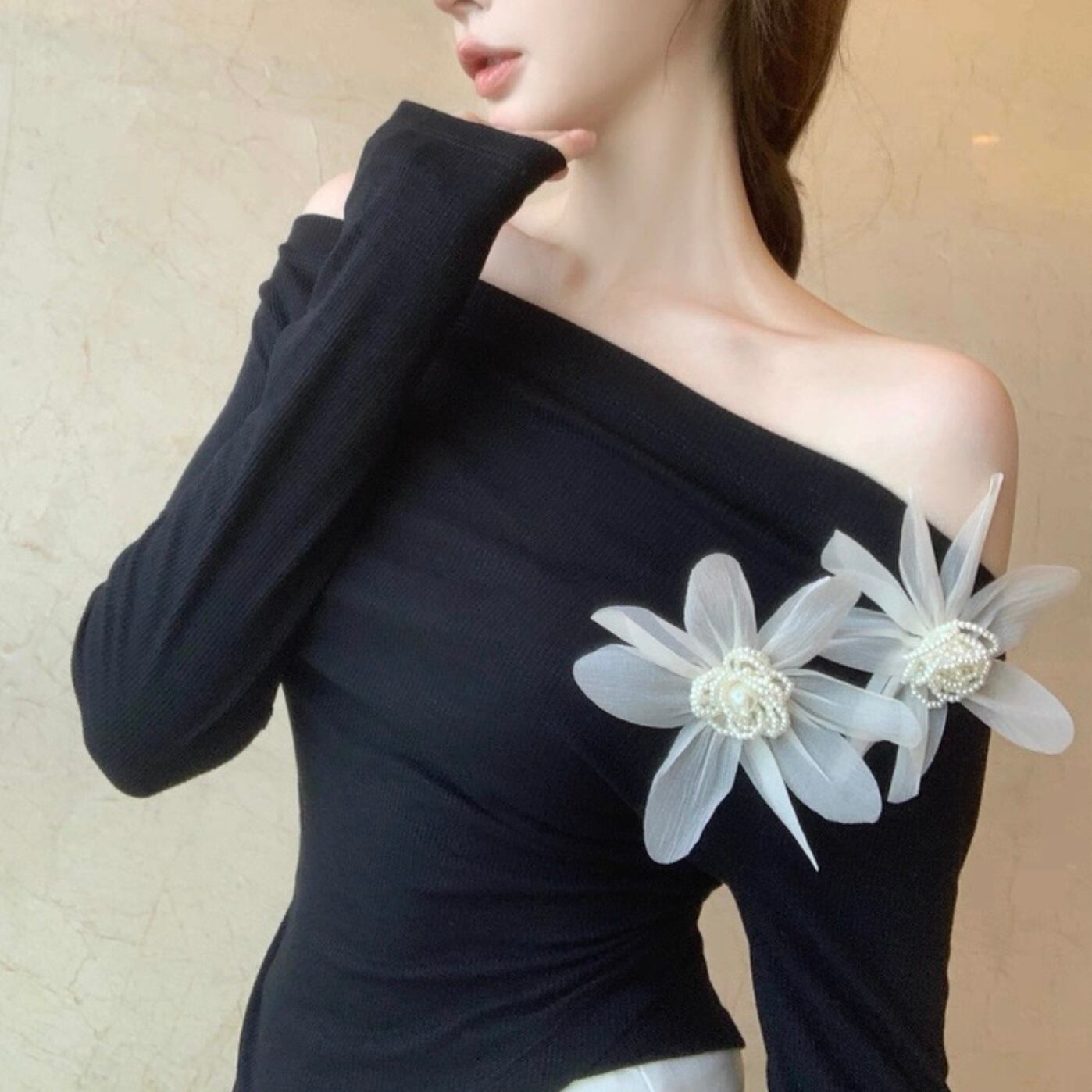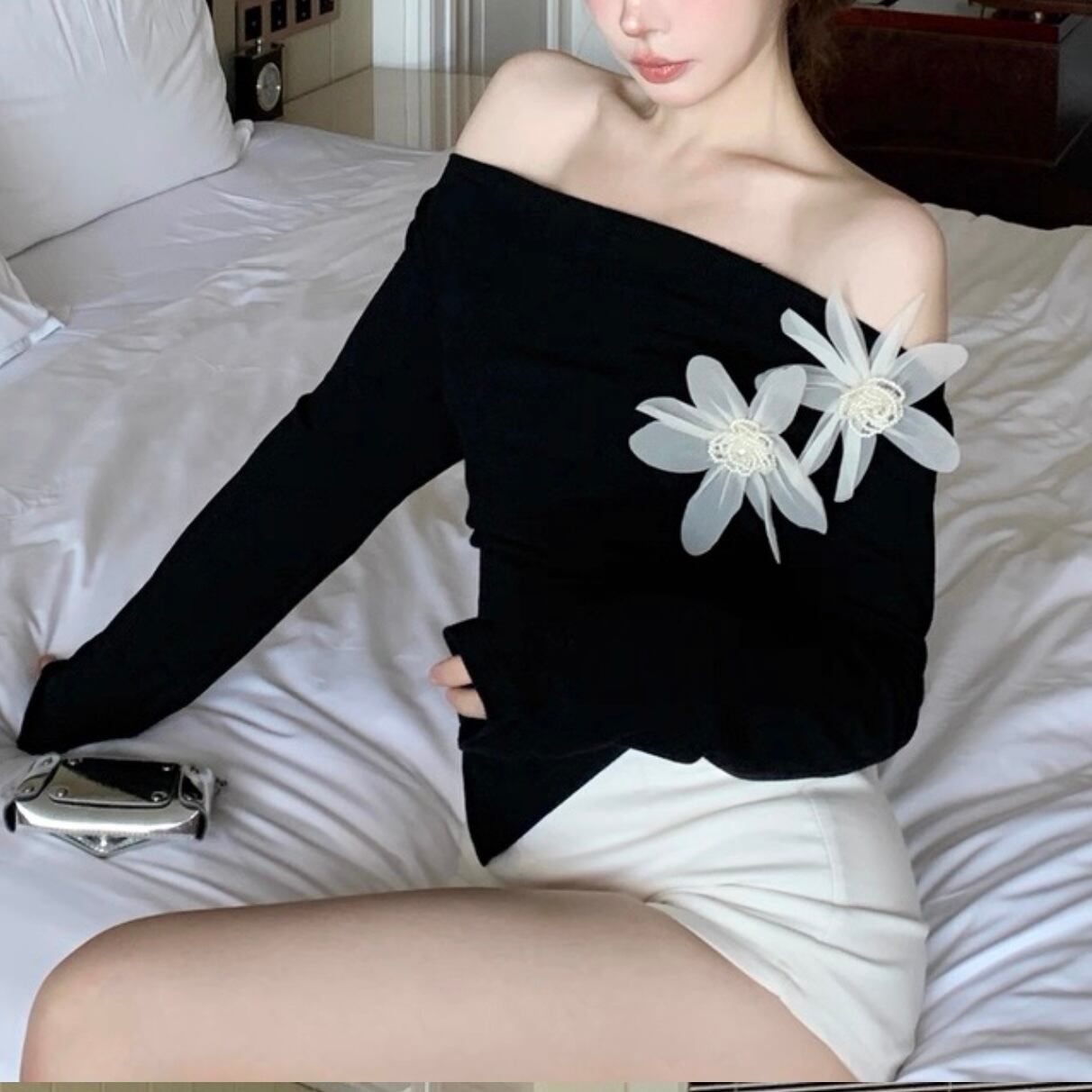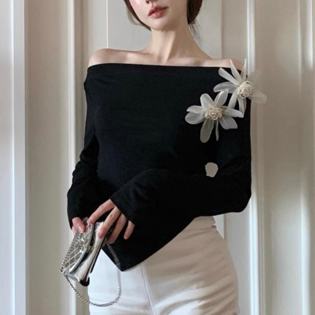 【tops】オフショルダーフラワー長袖トップス HK0199