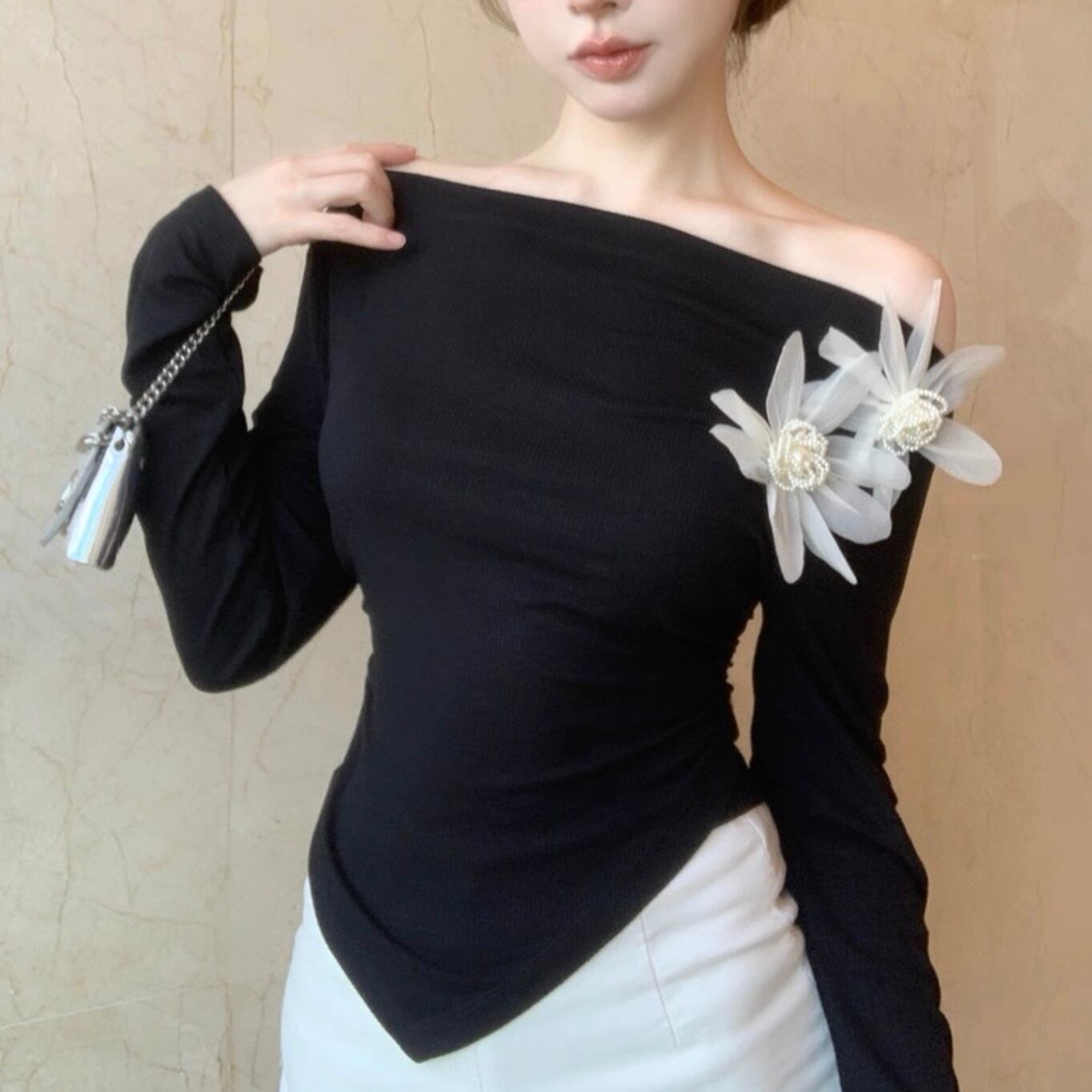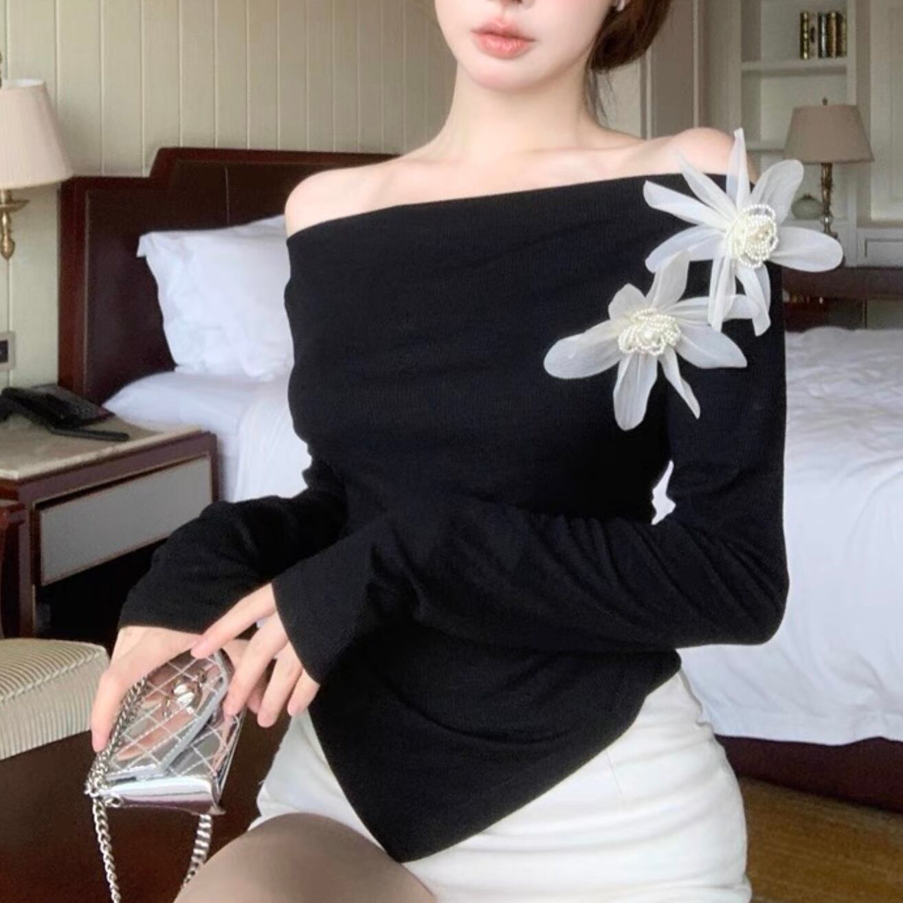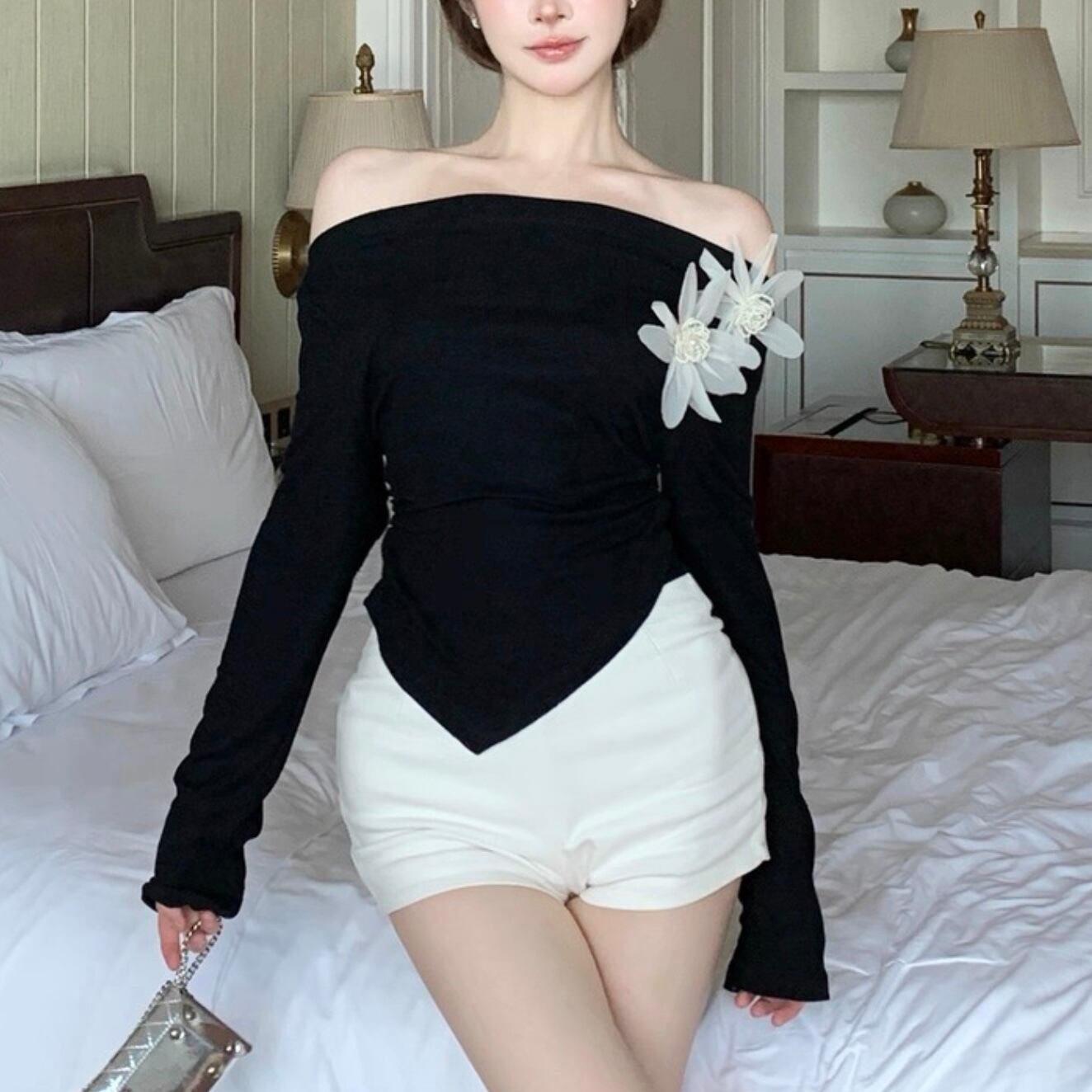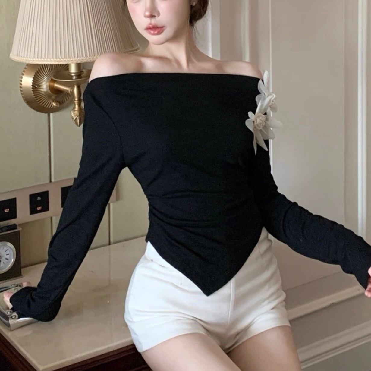 【tops】オフショルダーフラワー長袖トップス HK0199