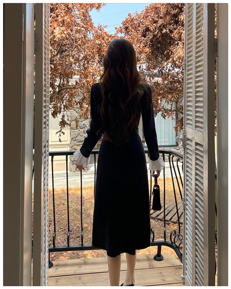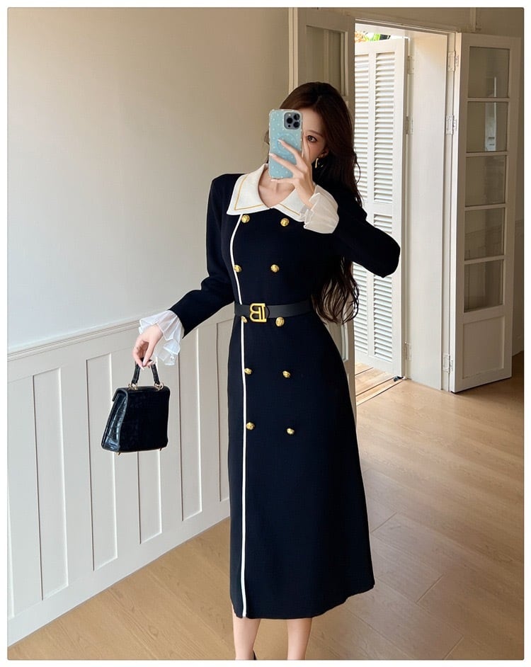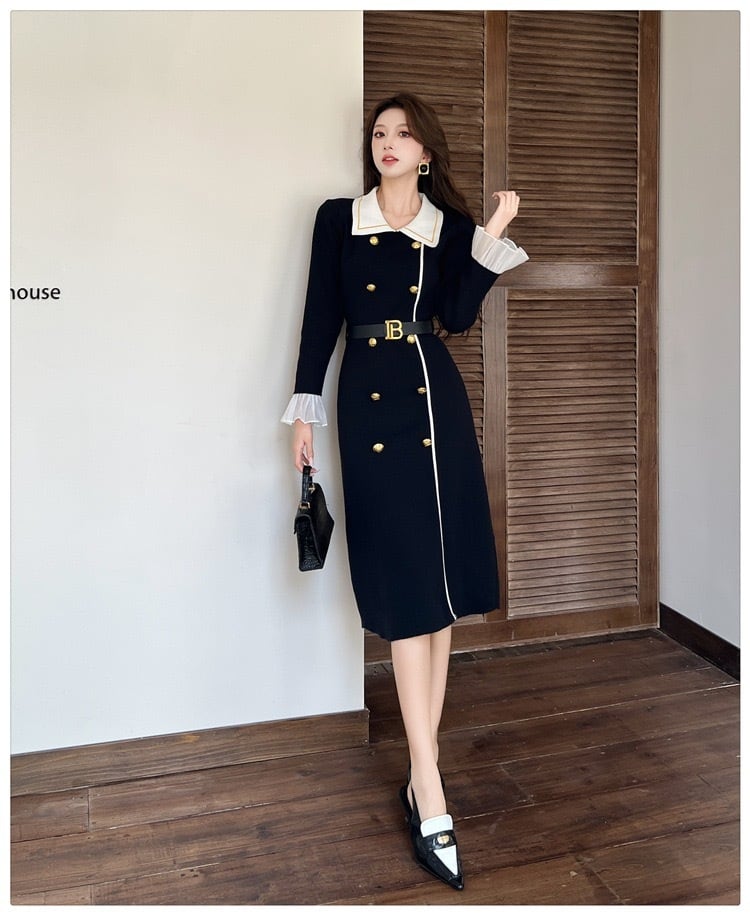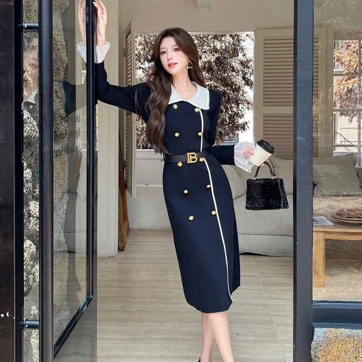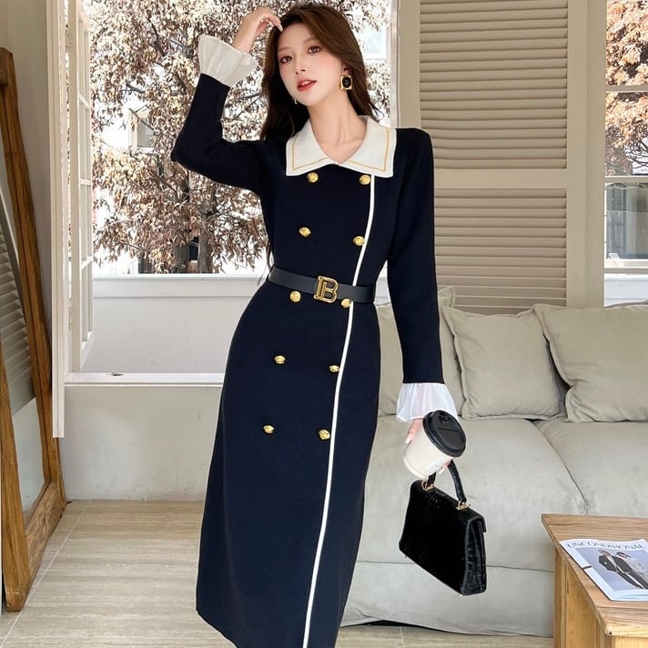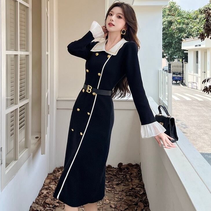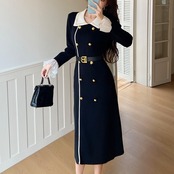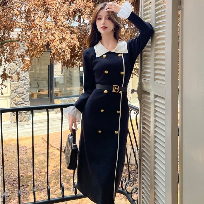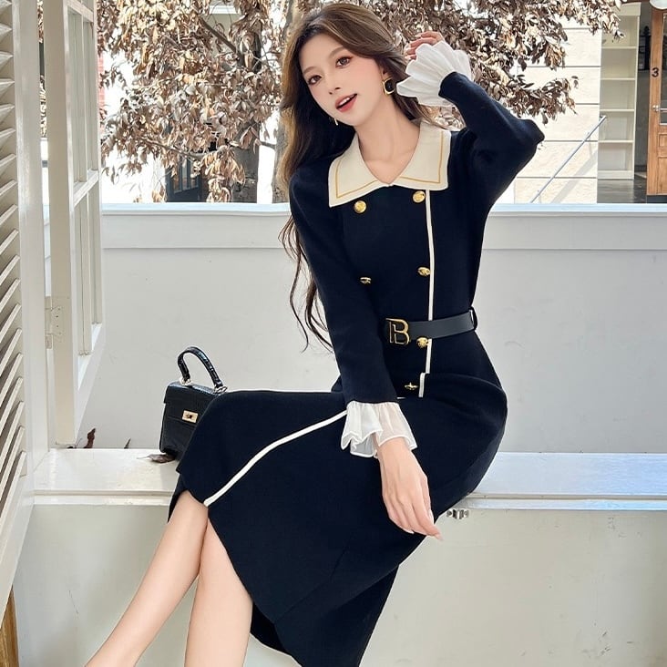 【dress】ベルト付きフロントボタン配色ニットワンピース HB1502