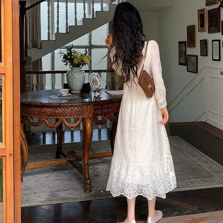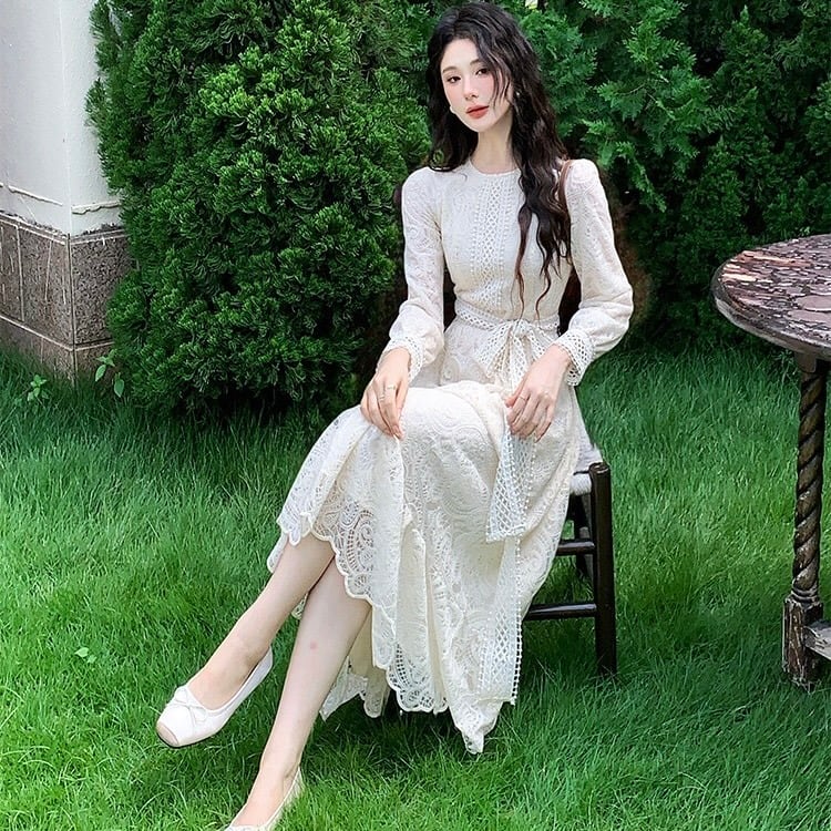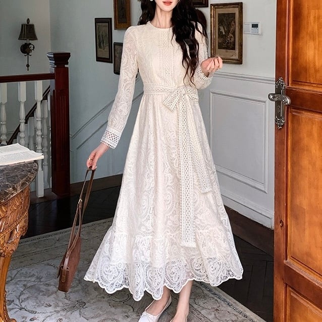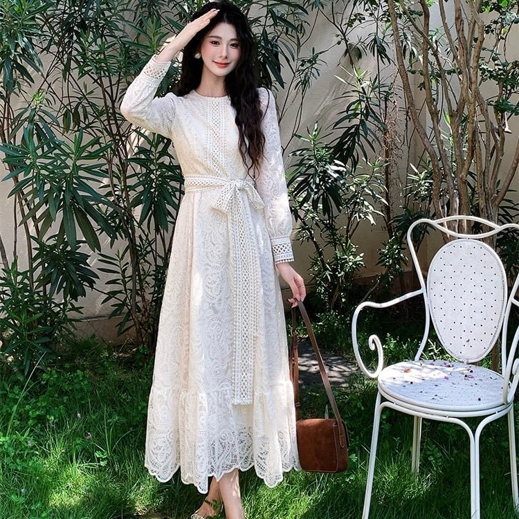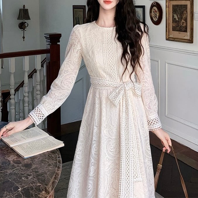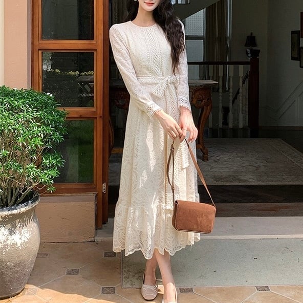 【dress】S〜2XLリボンベルトレースワンピース HX9204
