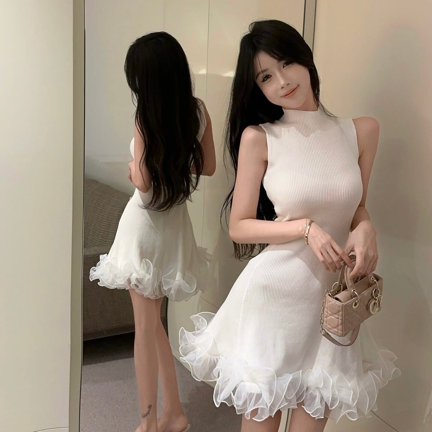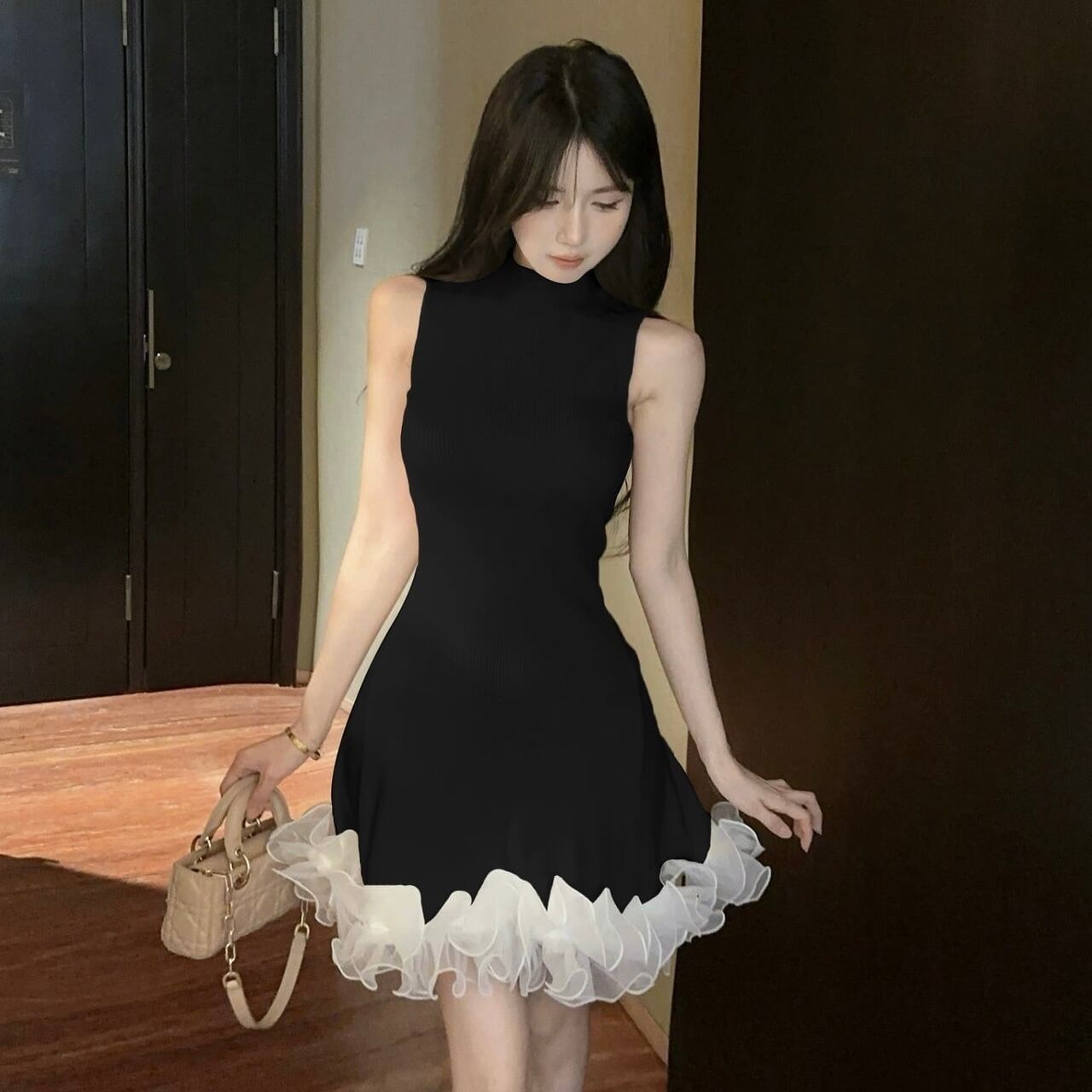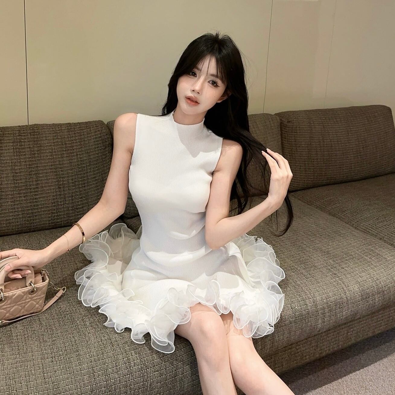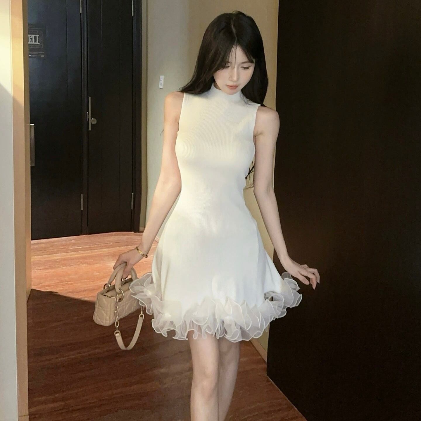 【dress】フリルノースリーブニットワンピース3色 HK0209