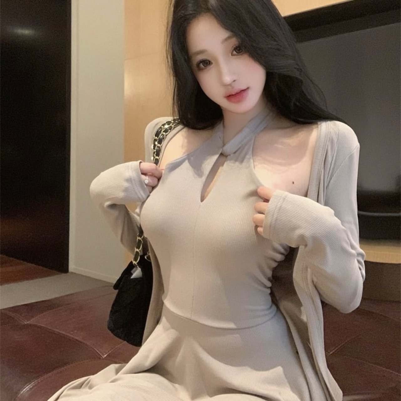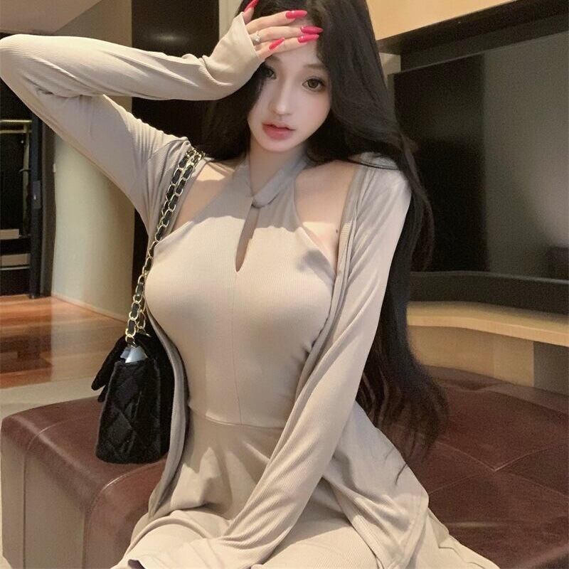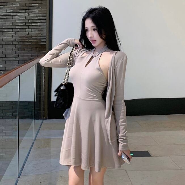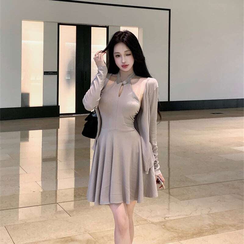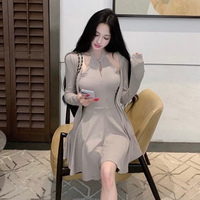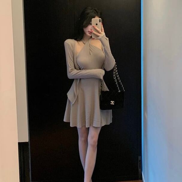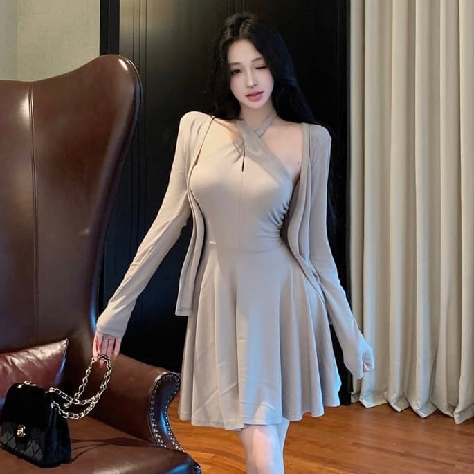 【set】クロスオフショルドレス×カーデセット HK02158