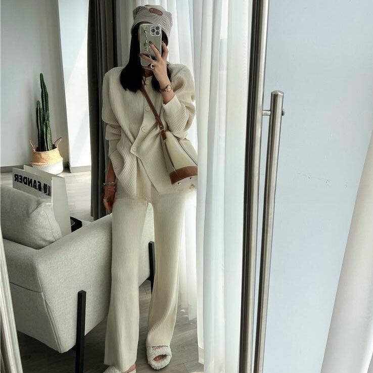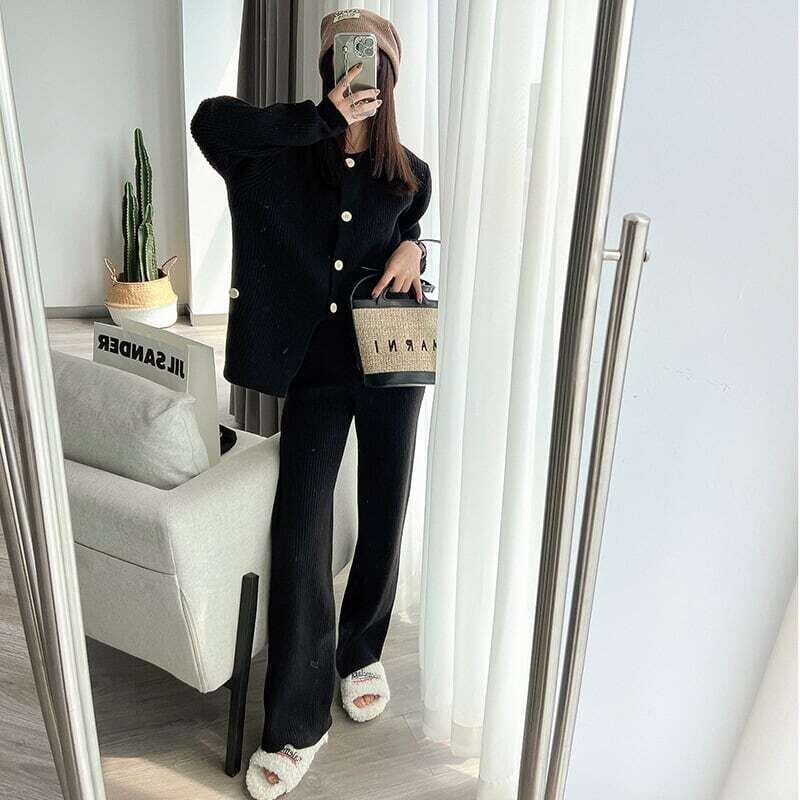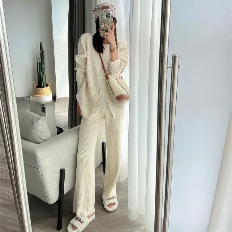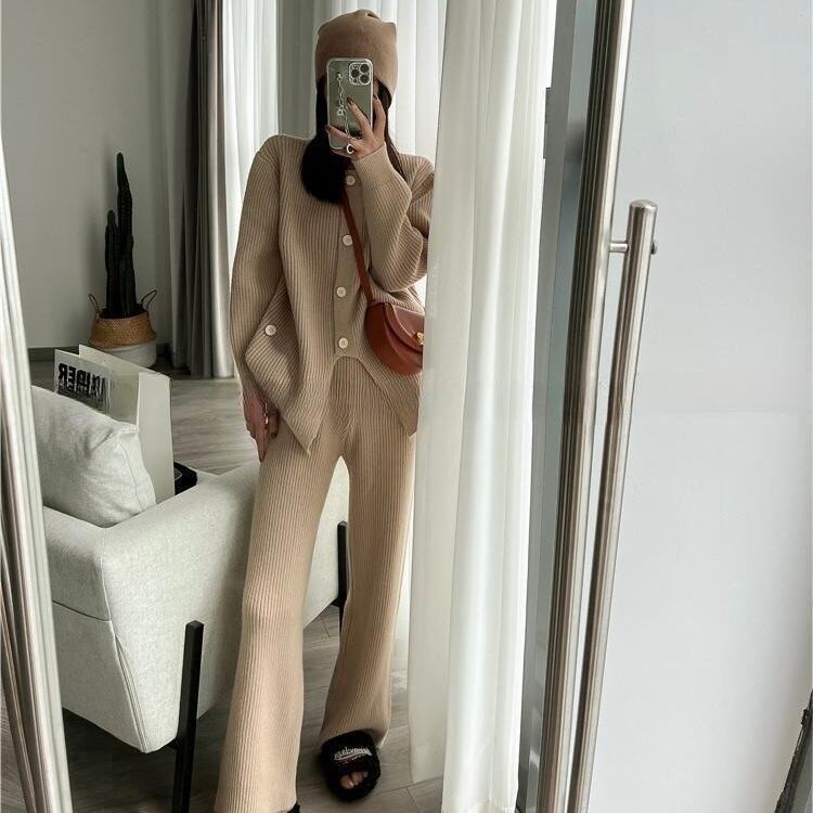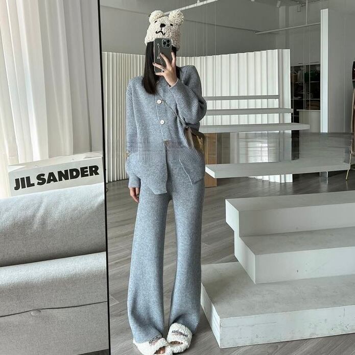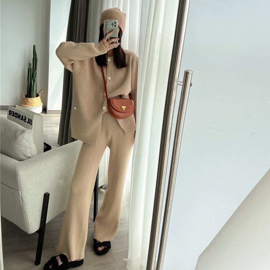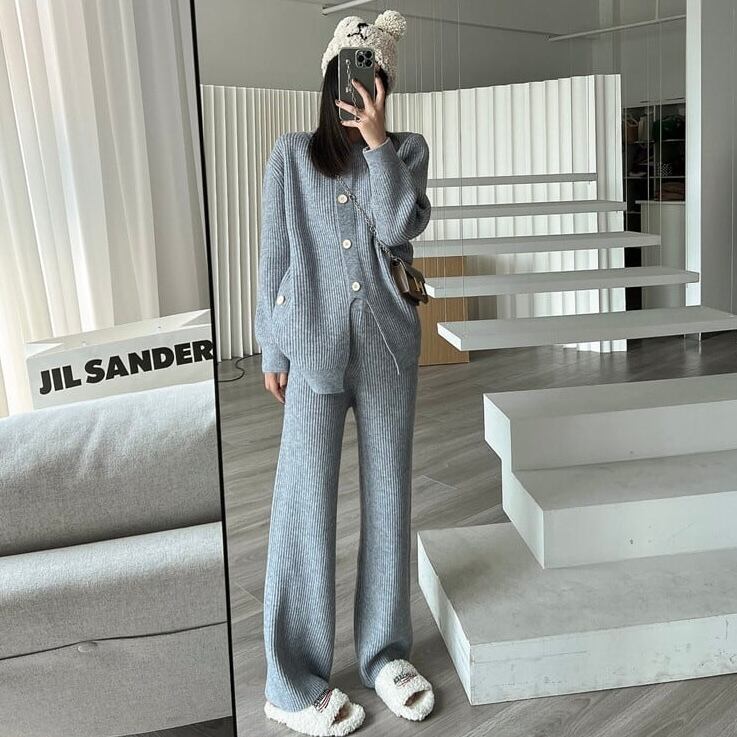 【set】ニットボタンカーディガン×ニットワイドパンツ4色 HK02173