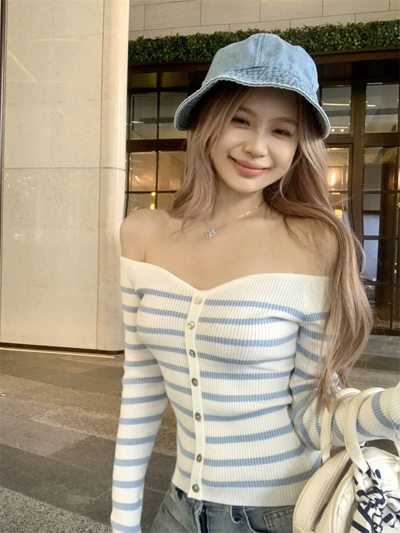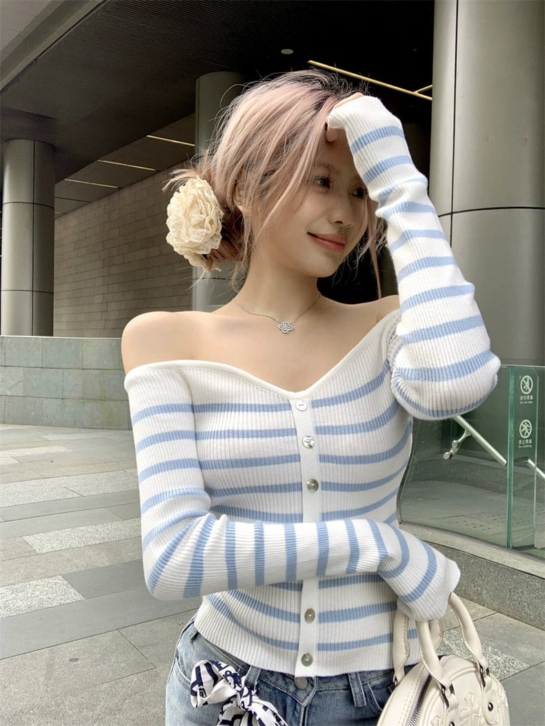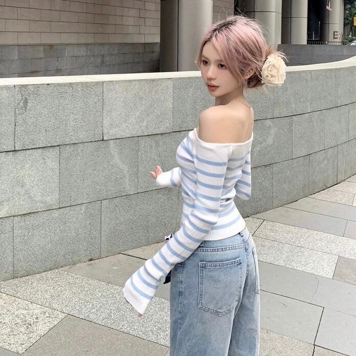 【tops】オフショルダーボーダーニットトップス HO1503