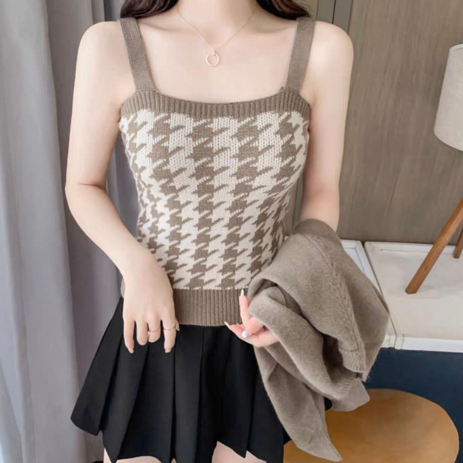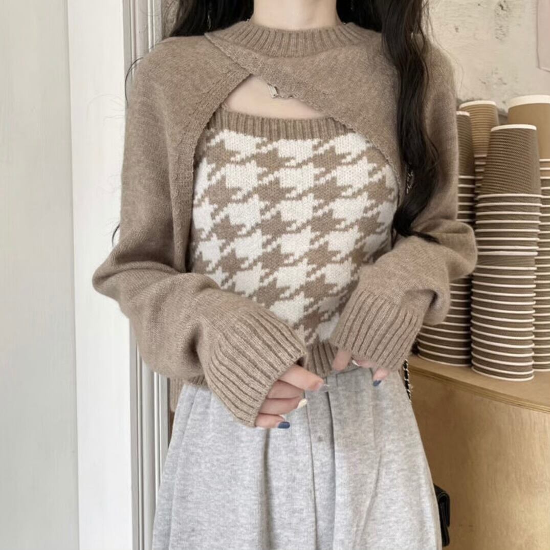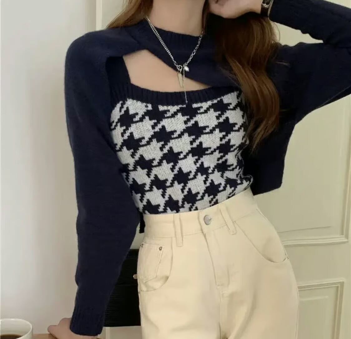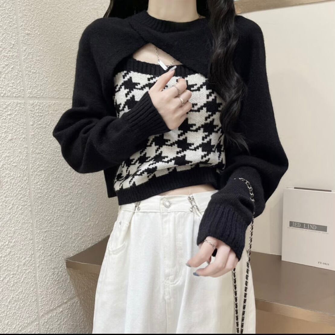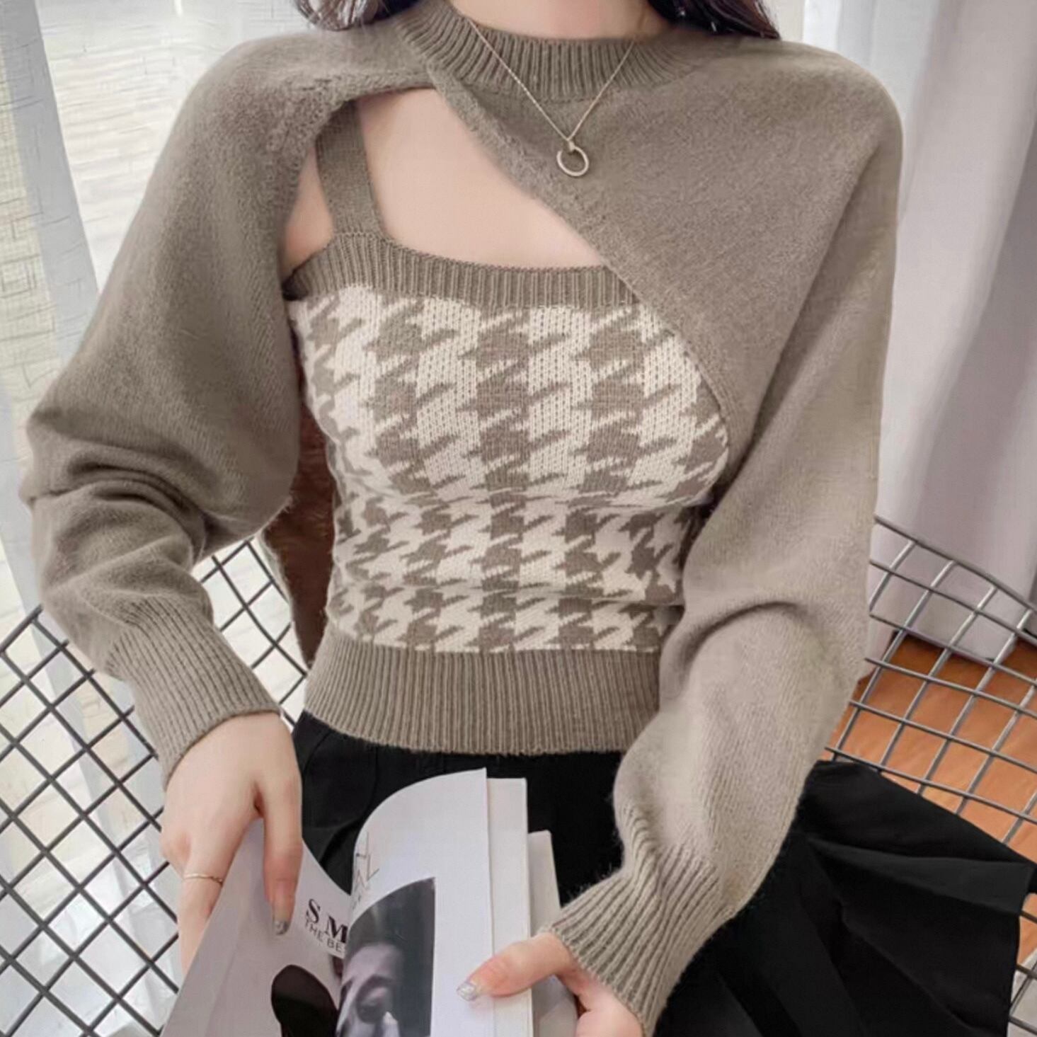 【set】 千鳥柄ニットキャミ×スリーブ2色 HK02190