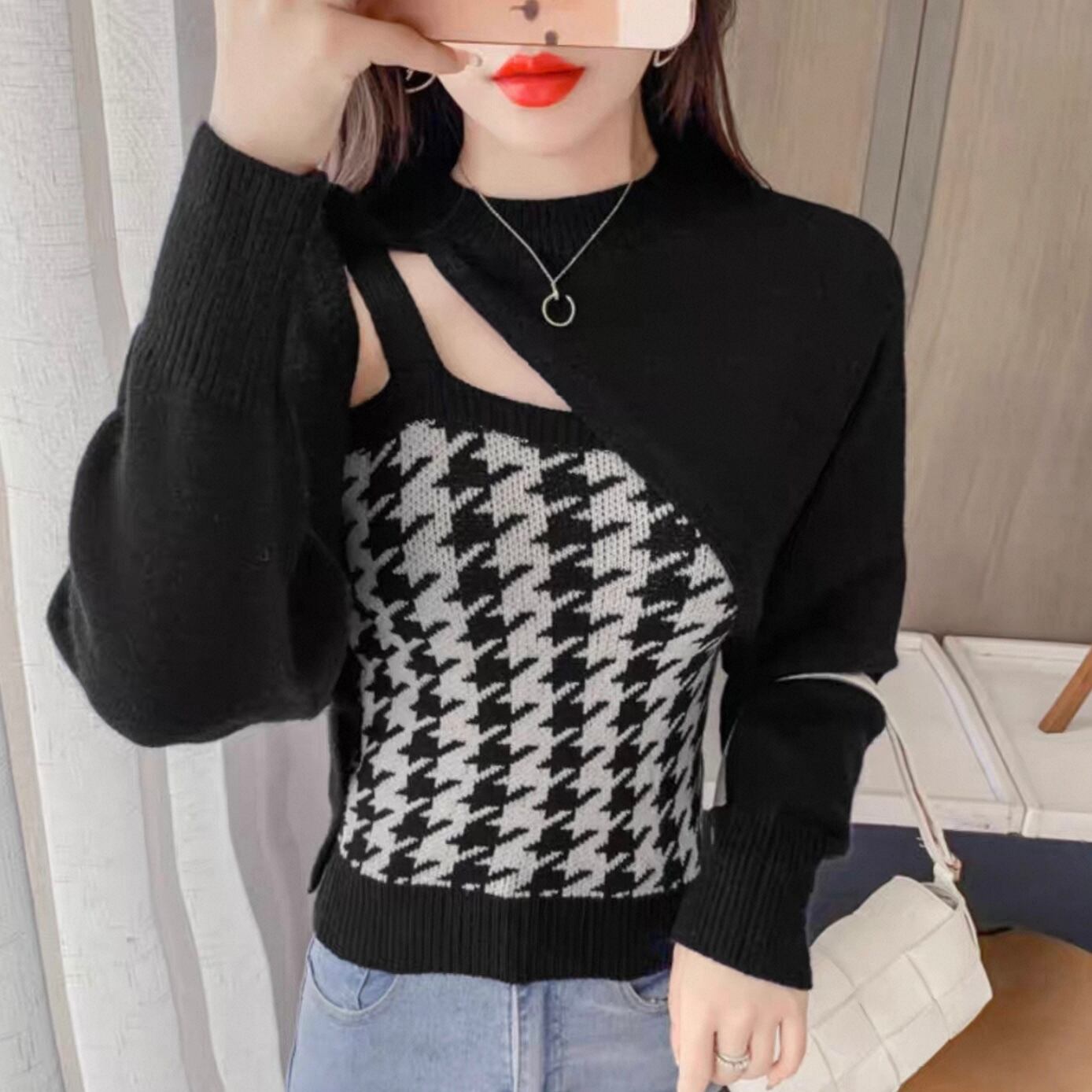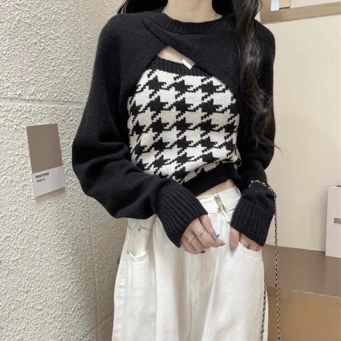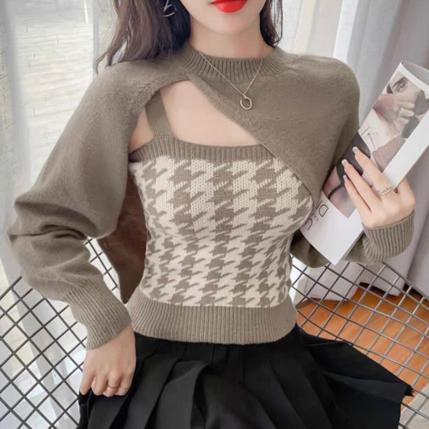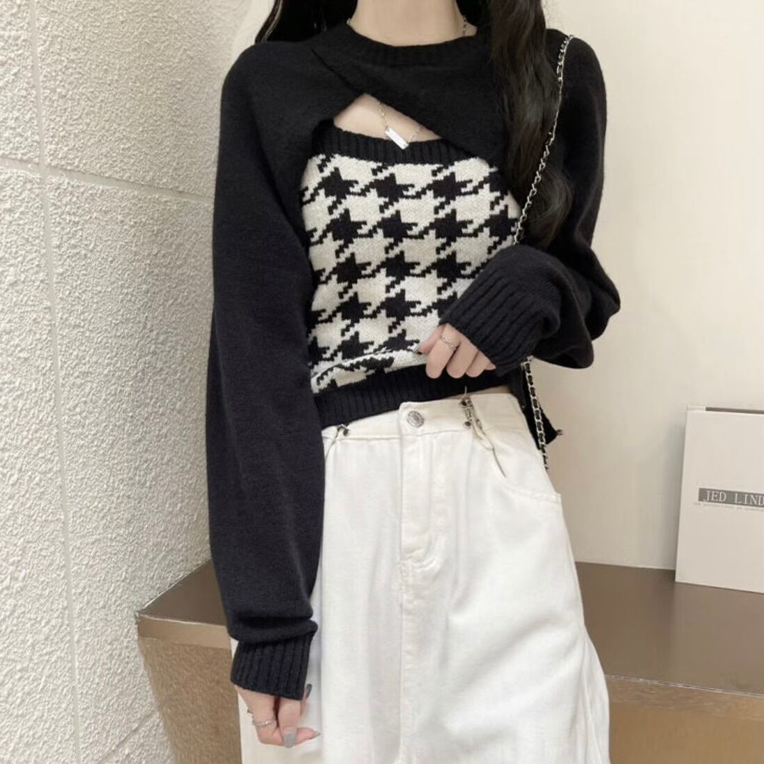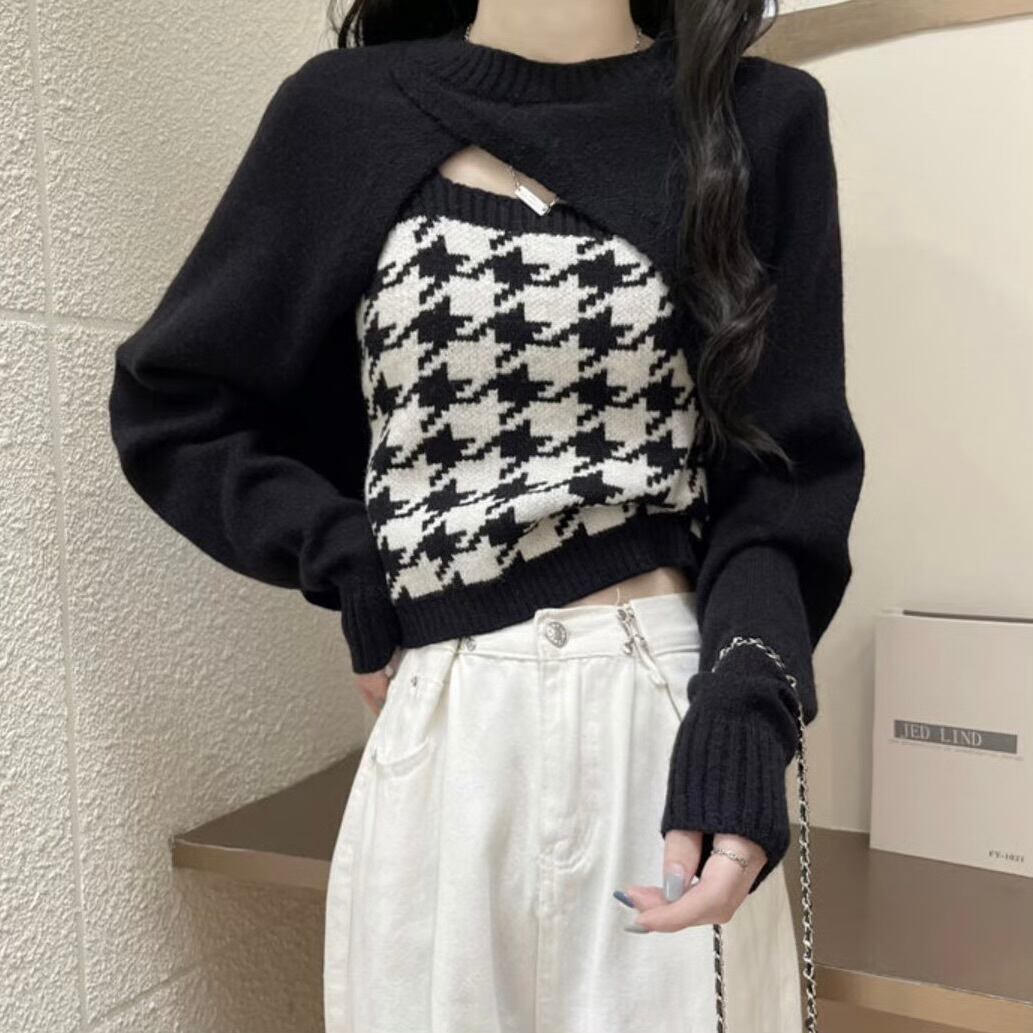 【set】 千鳥柄ニットキャミ×スリーブ2色 HK02190