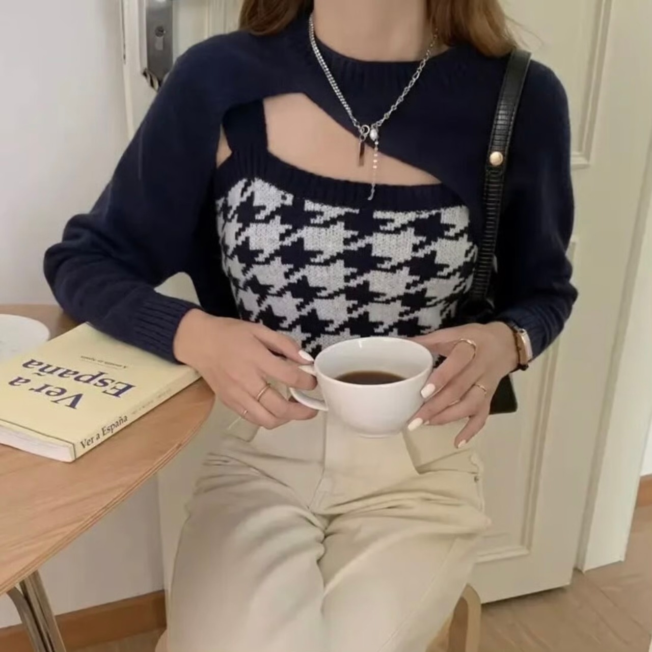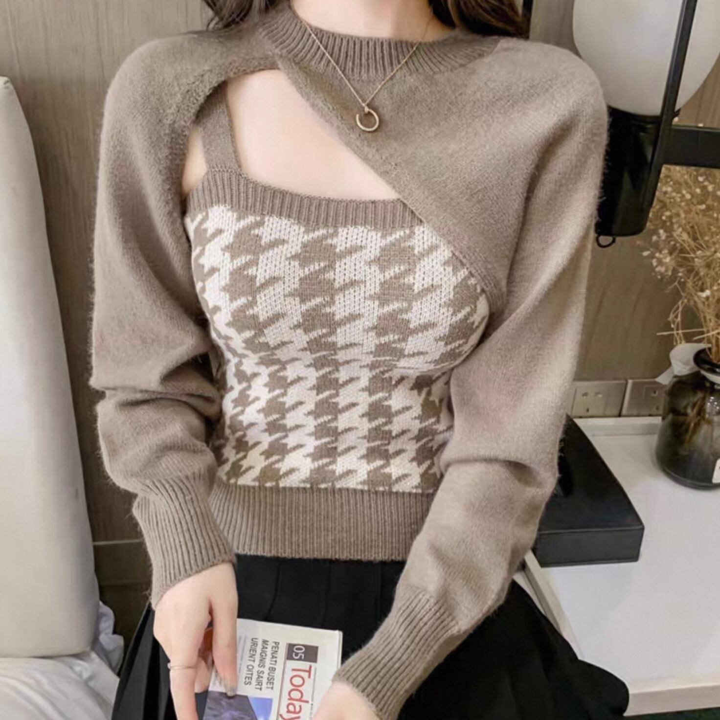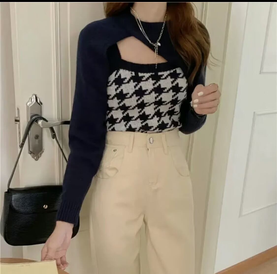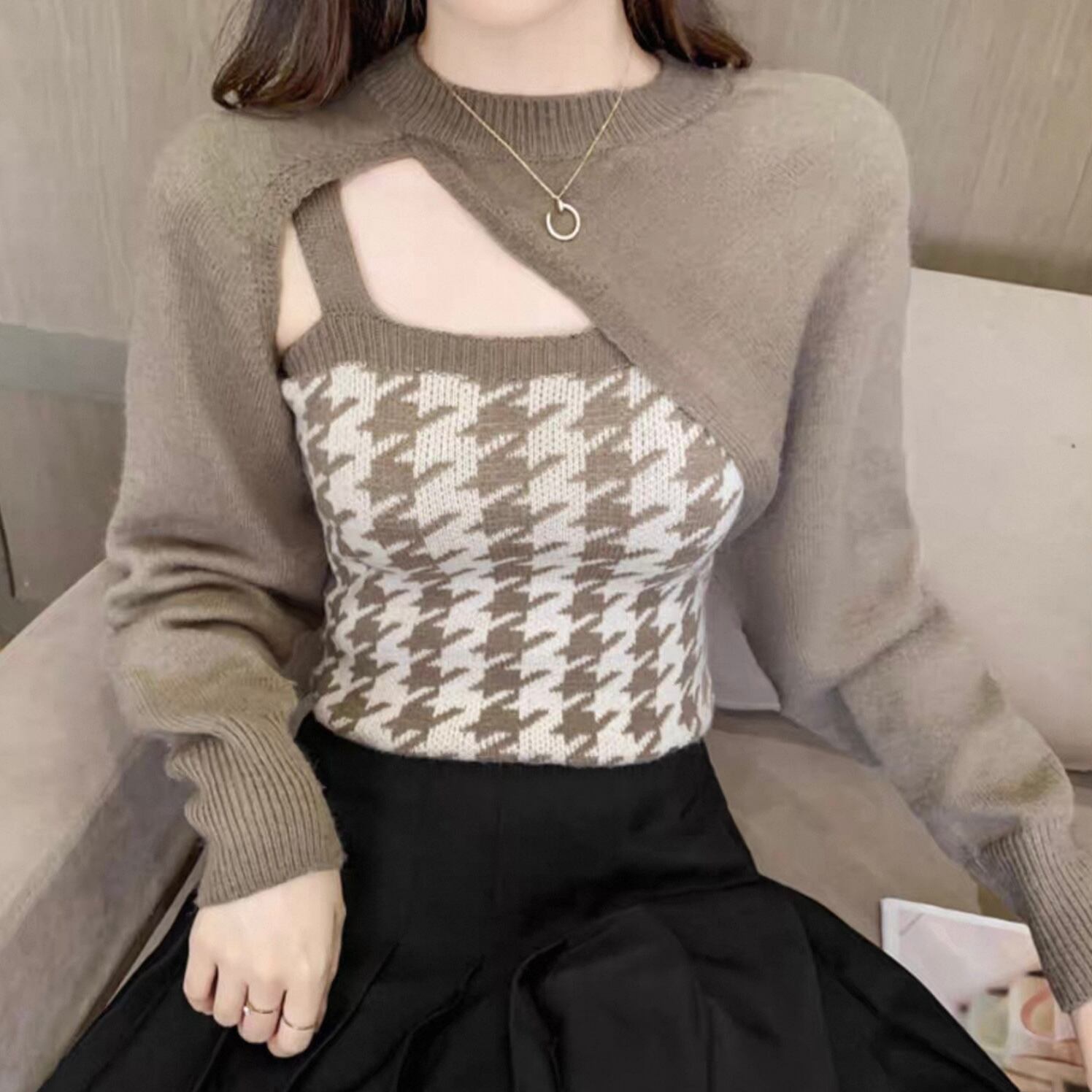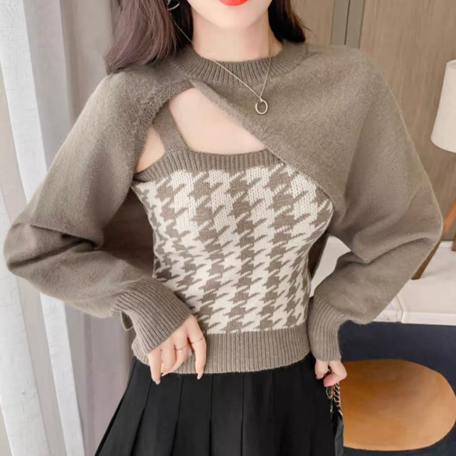 【set】 千鳥柄ニットキャミ×スリーブ2色 HK02190