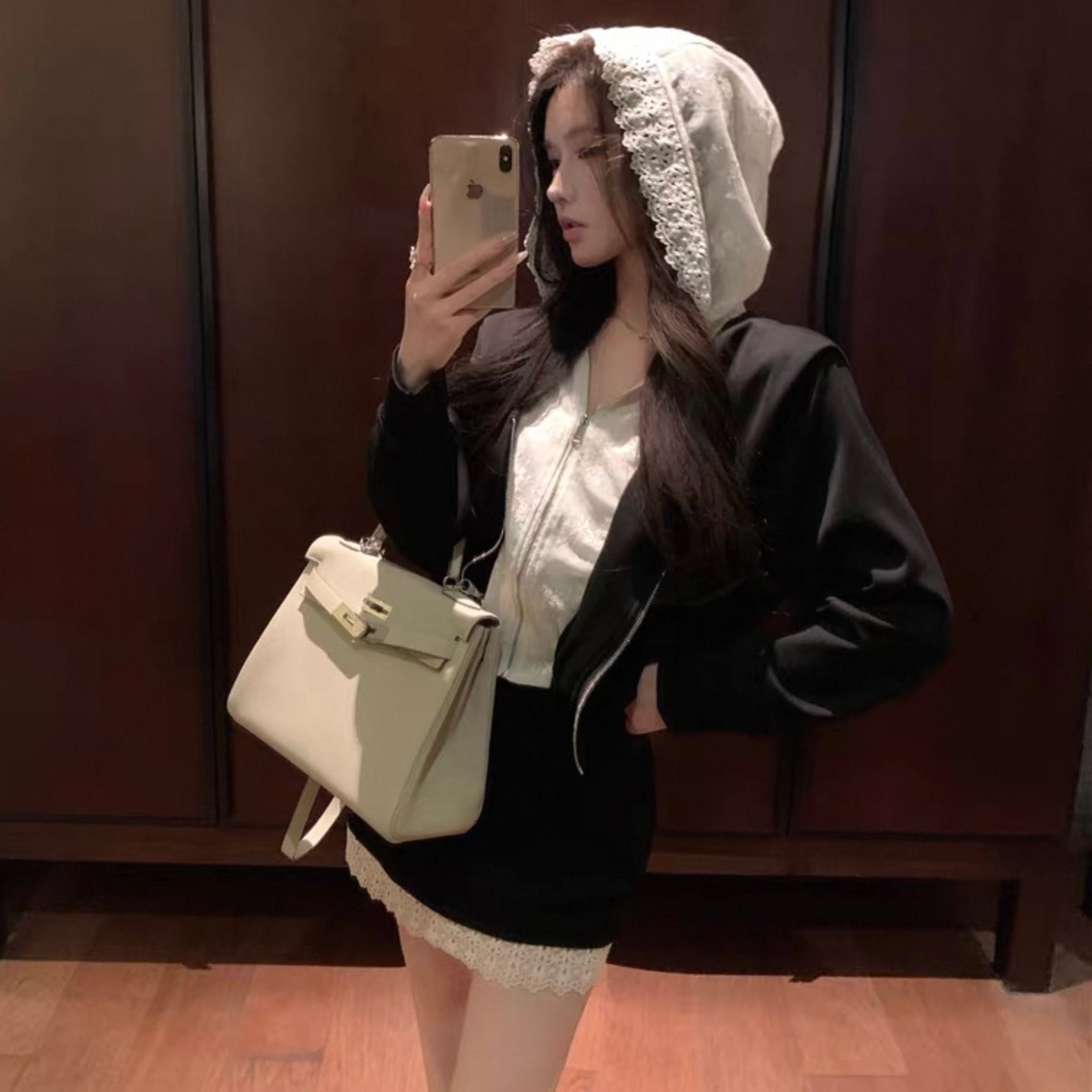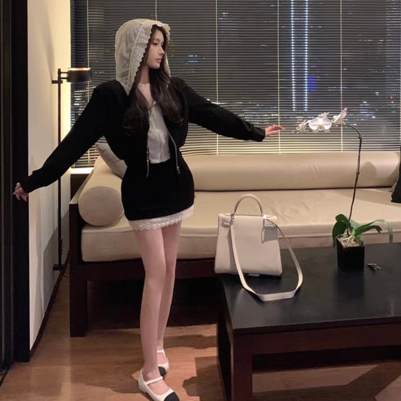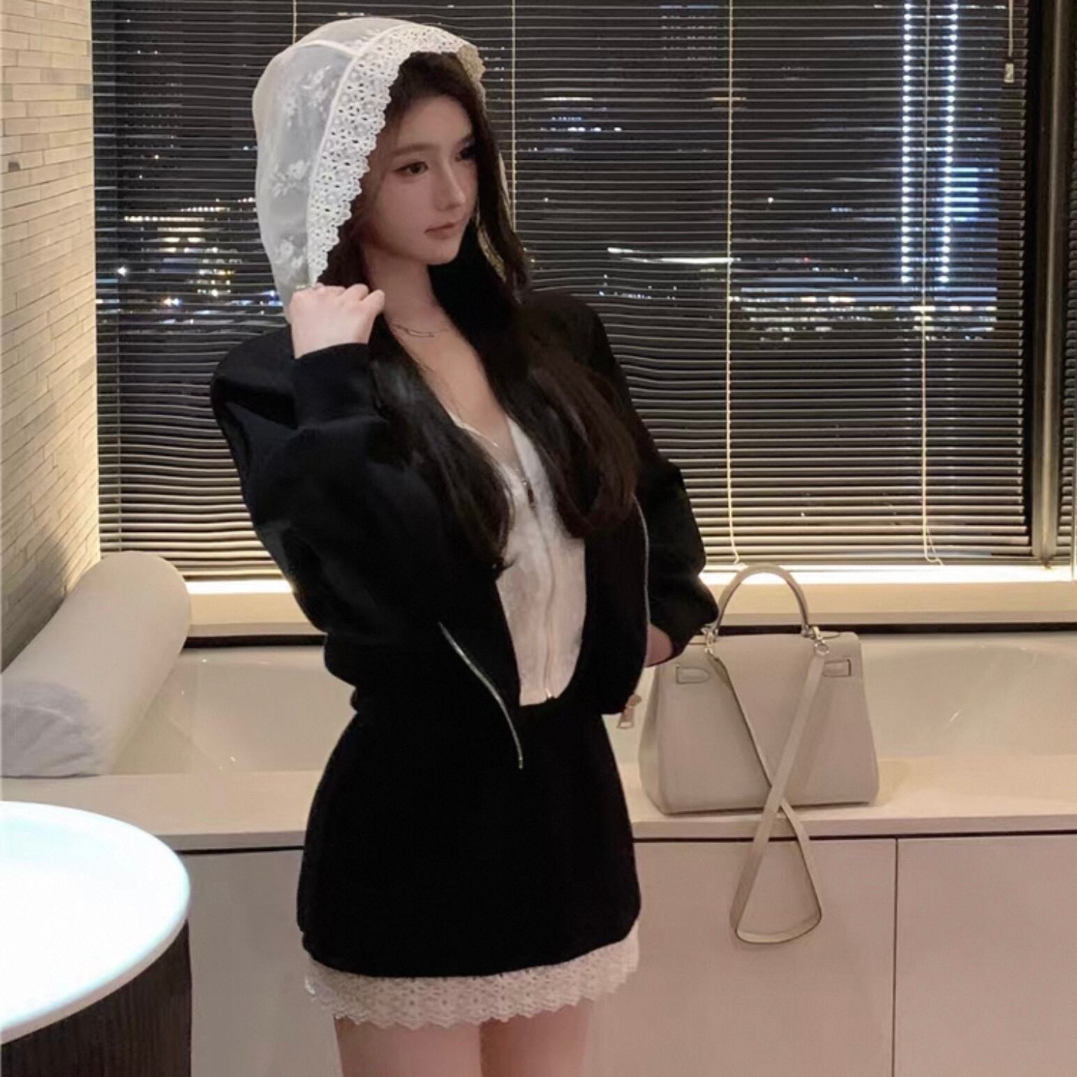 【set】レースフードジャンパー×レース切り替えミニスカート HK02196