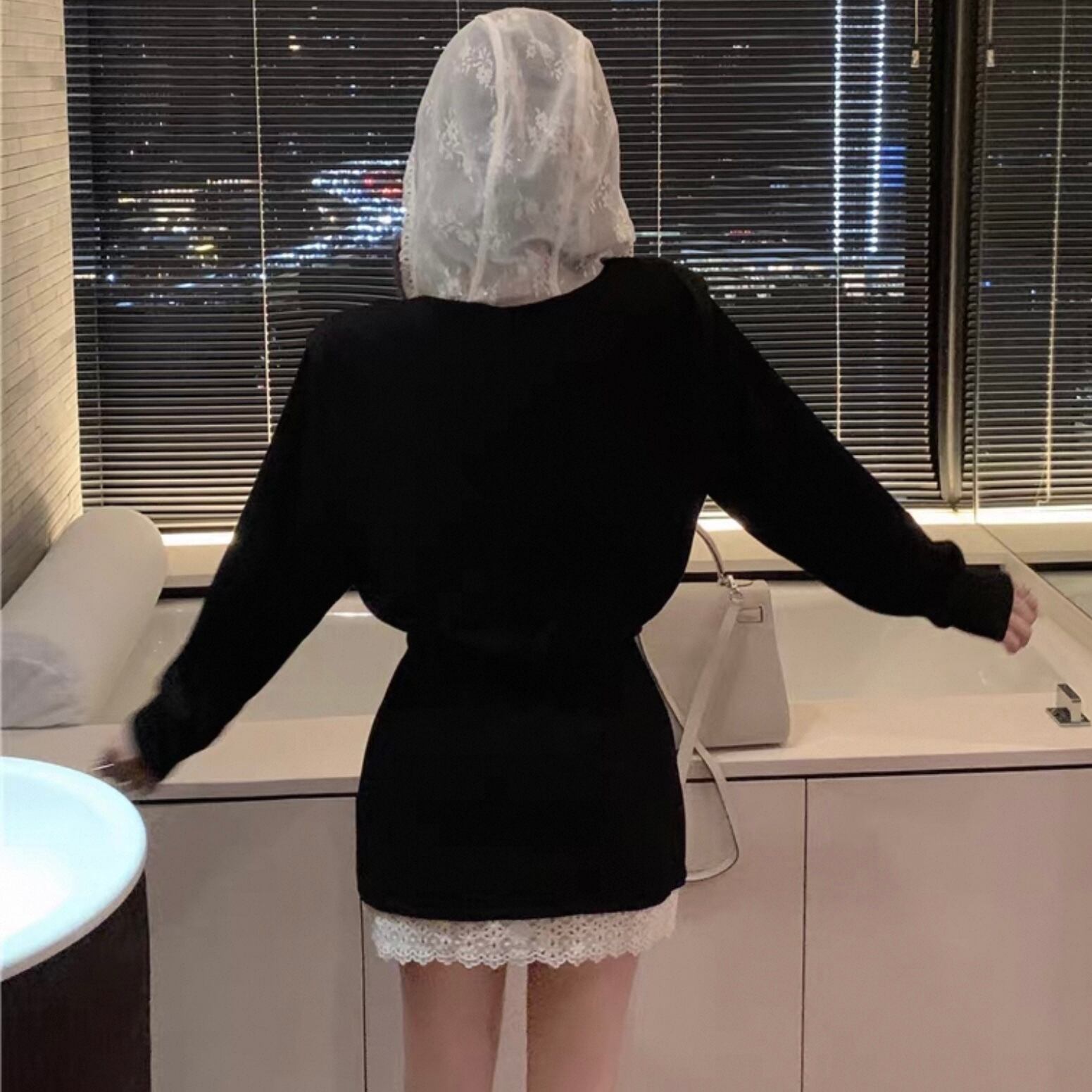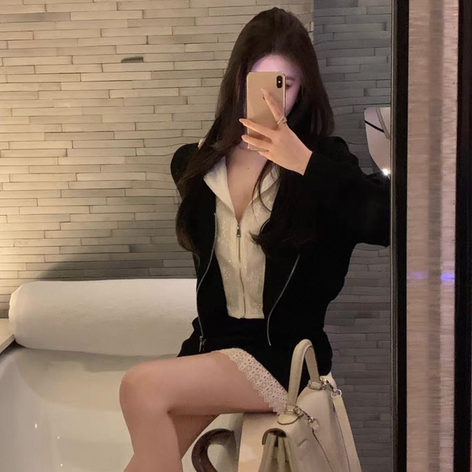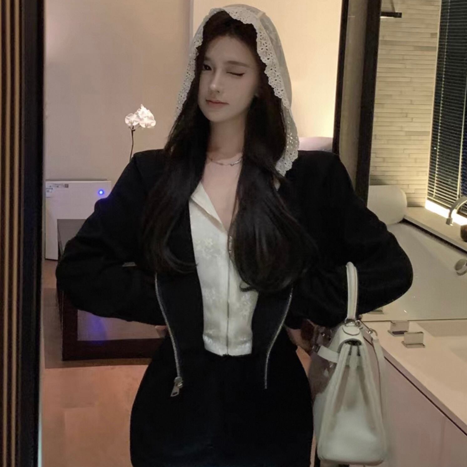 【set】レースフードジャンパー×レース切り替えミニスカート HK02196