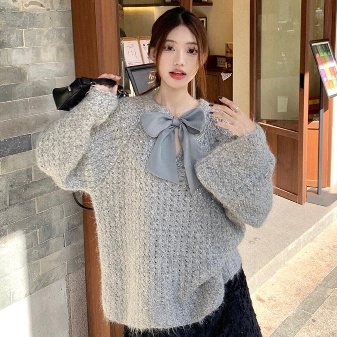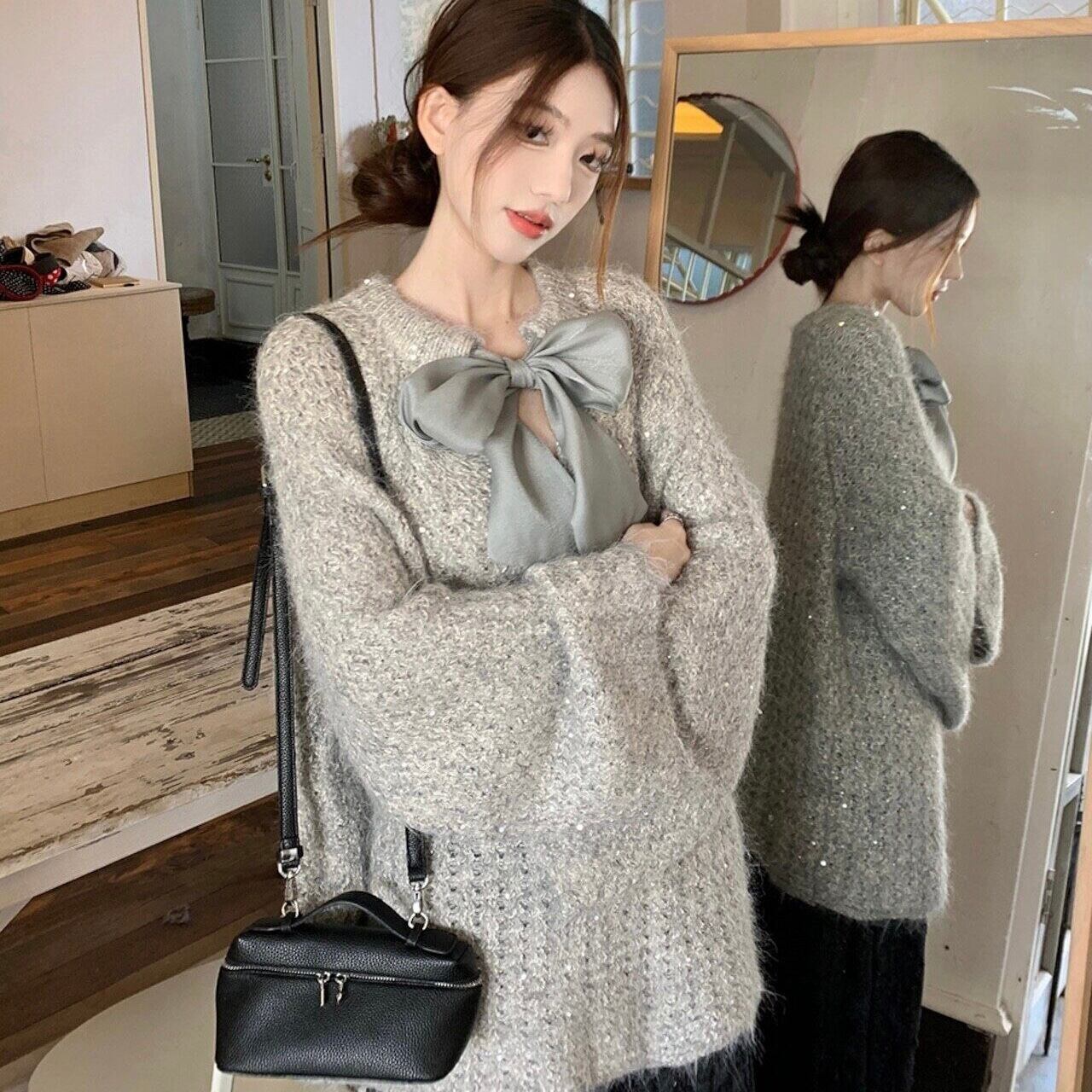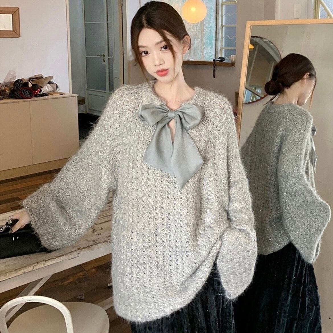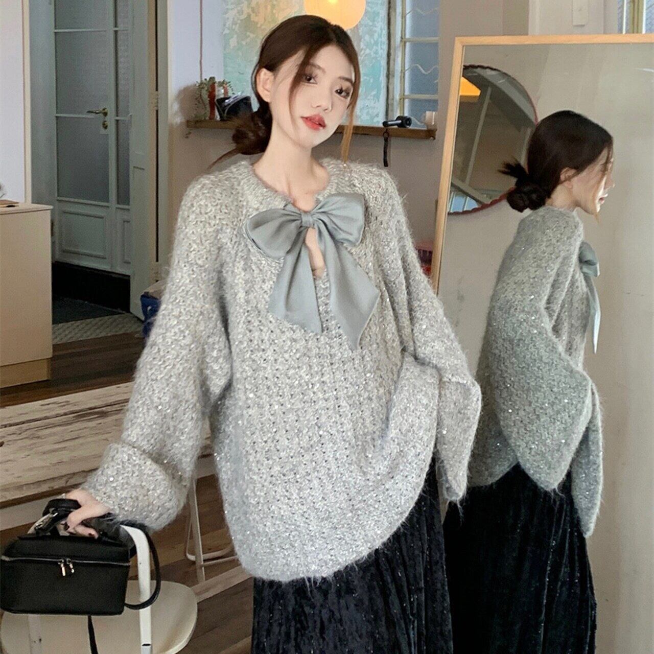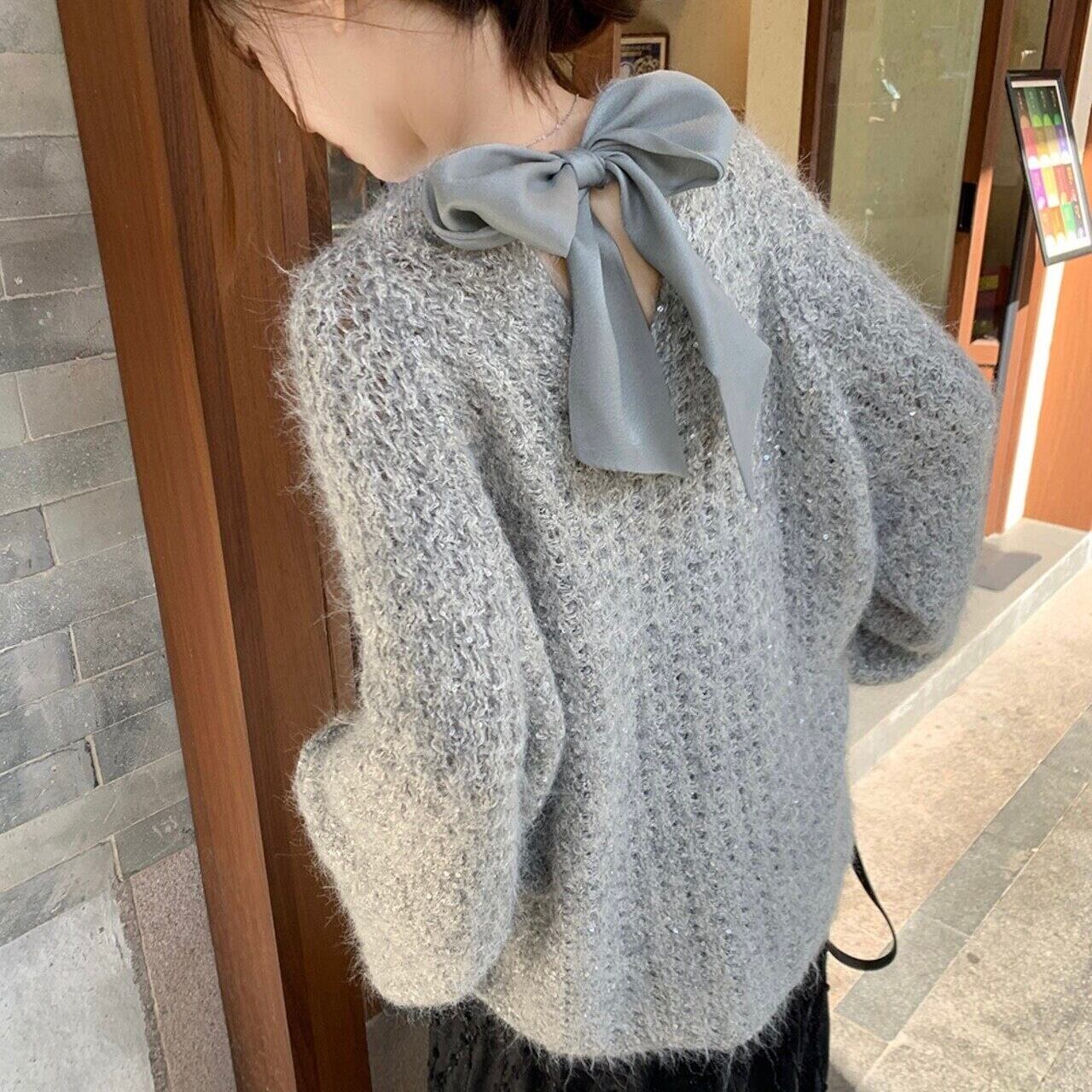 【tops】2wayリボンラメ入りニットトップス2色 HK0244