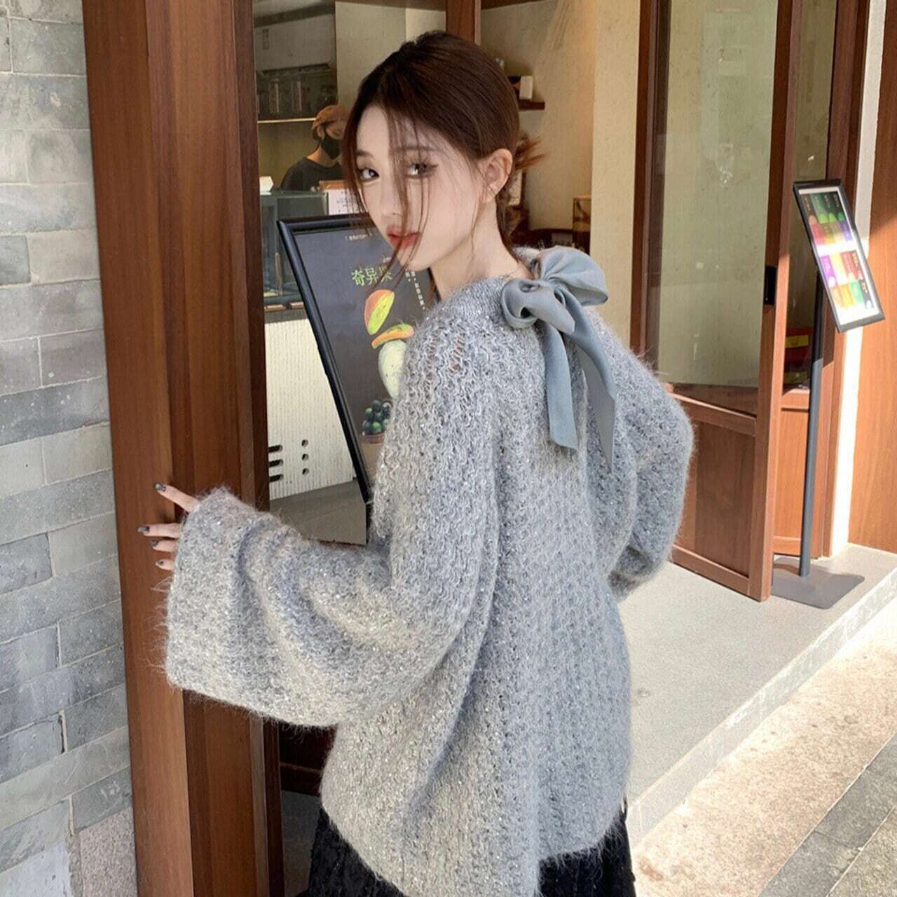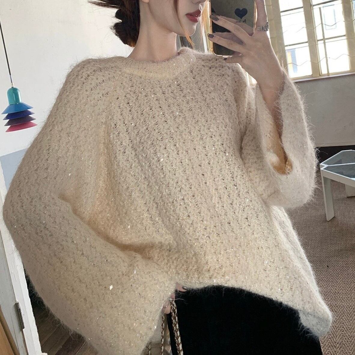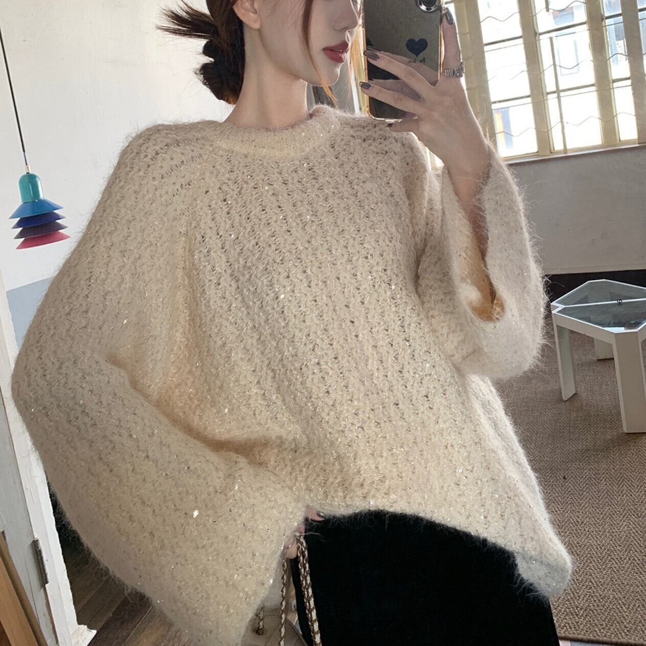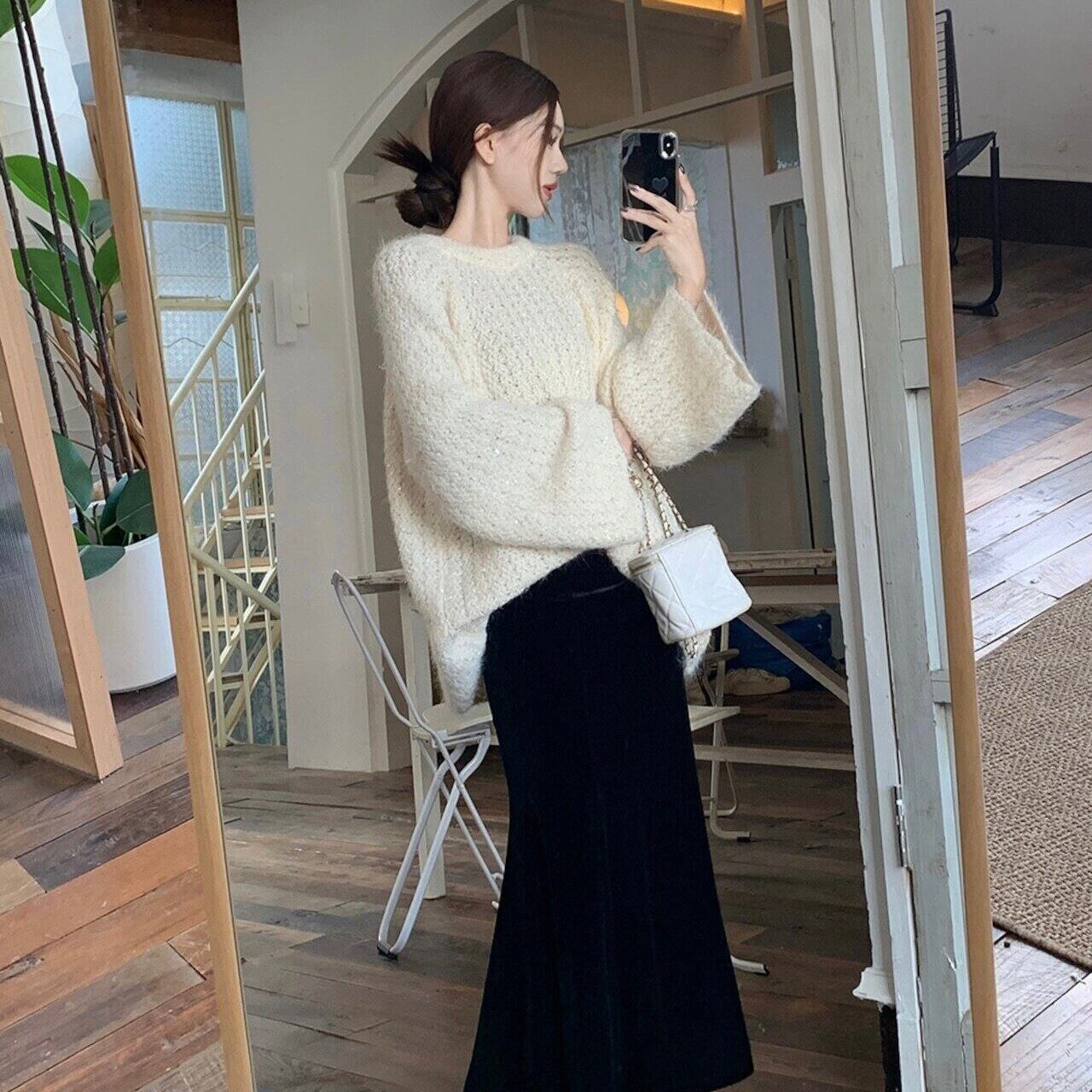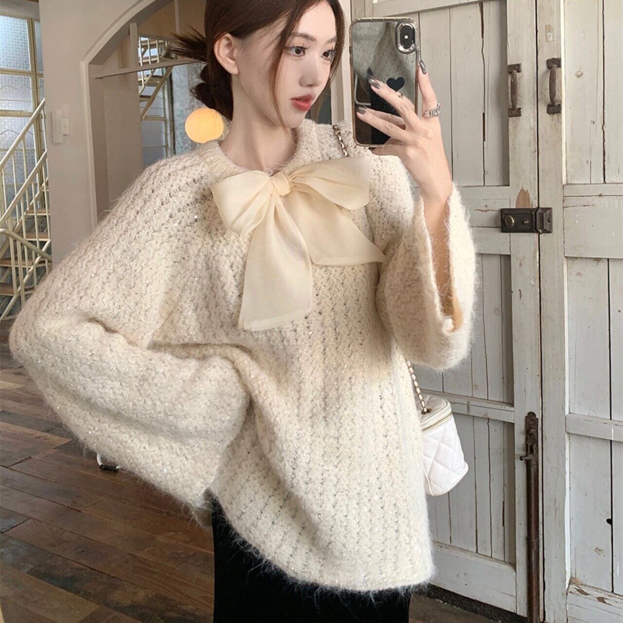 【tops】2wayリボンラメ入りニットトップス2色 HK0244