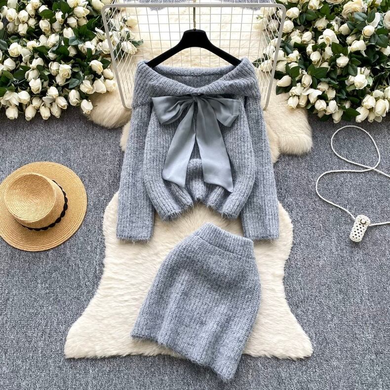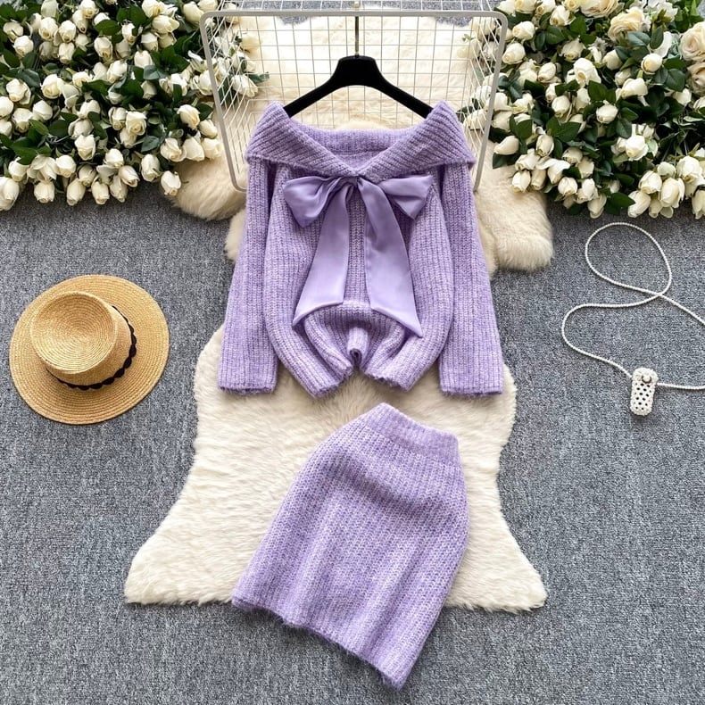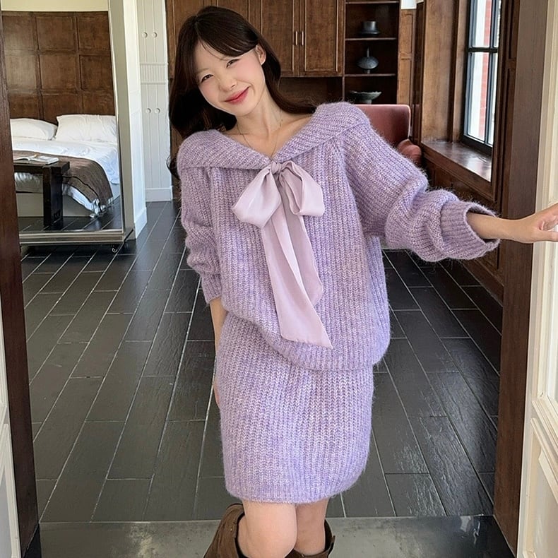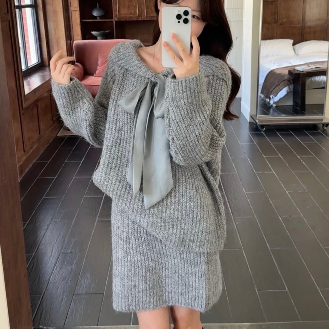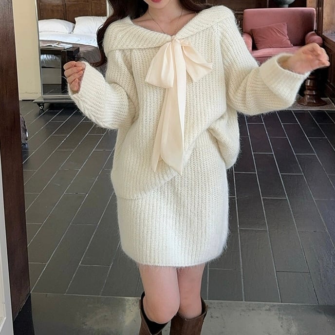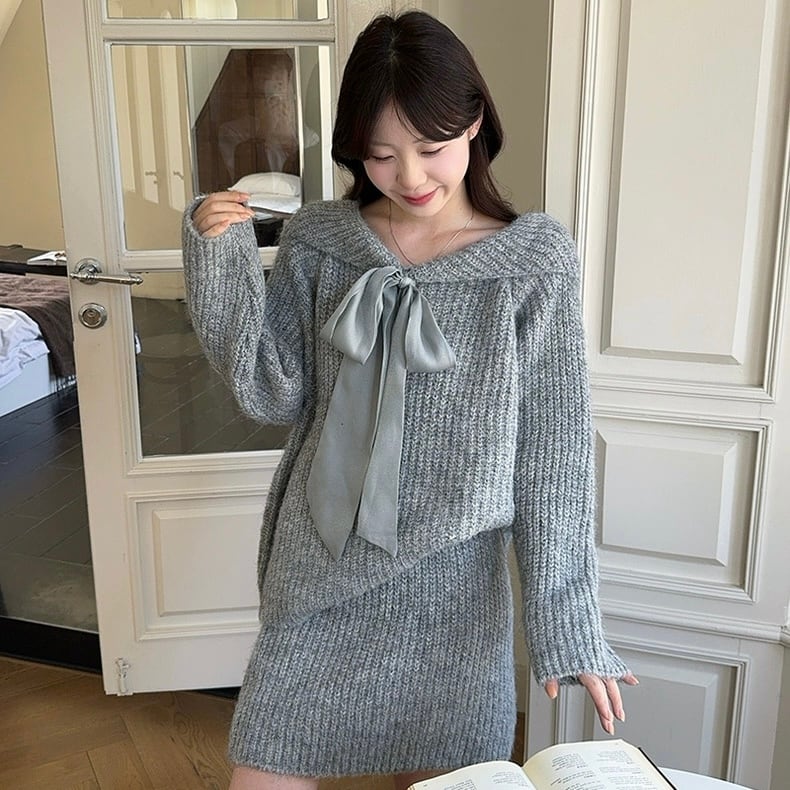 【set】2wayボウタイニットトップスxスカート3色 HN0051