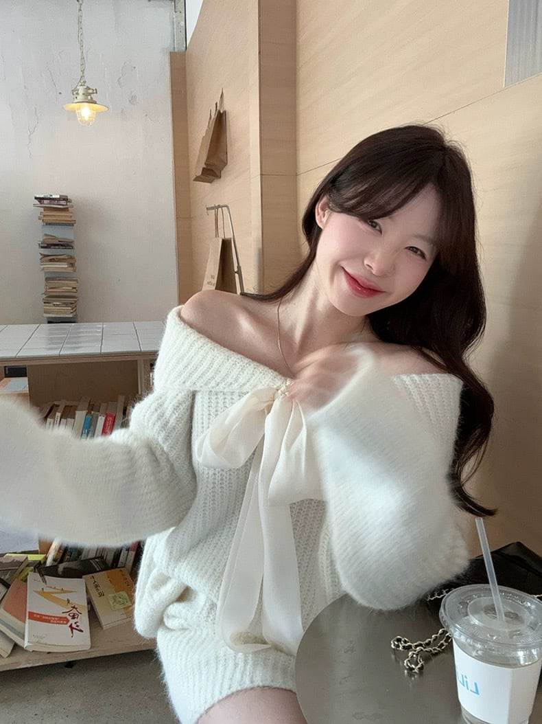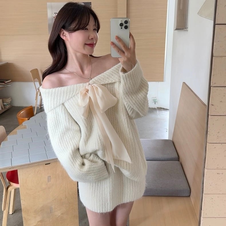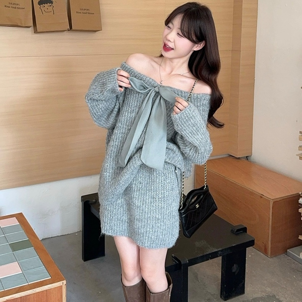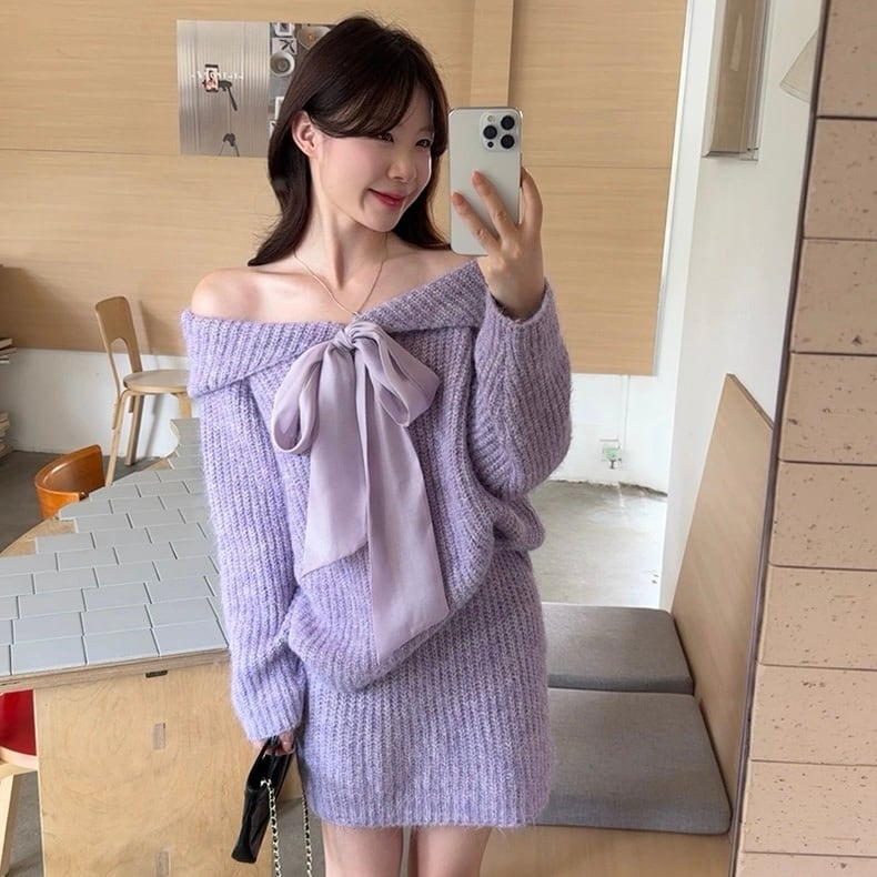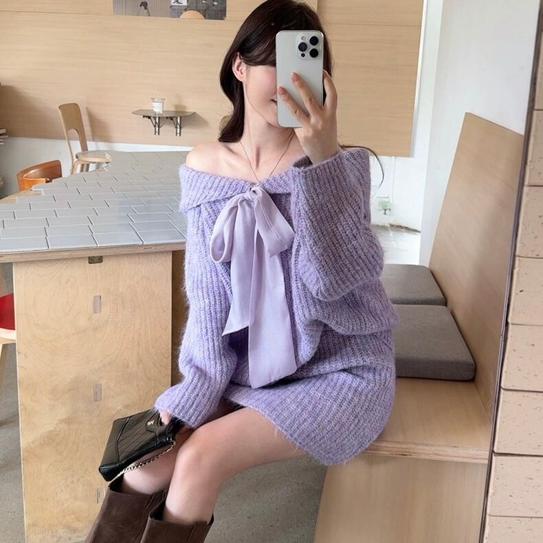 【set】2wayボウタイニットトップスxスカート3色 HN0051