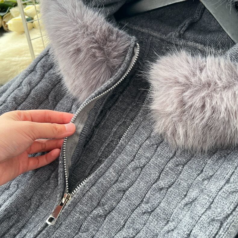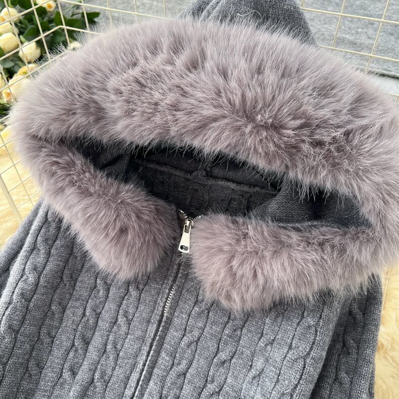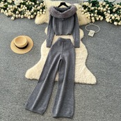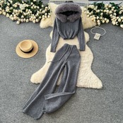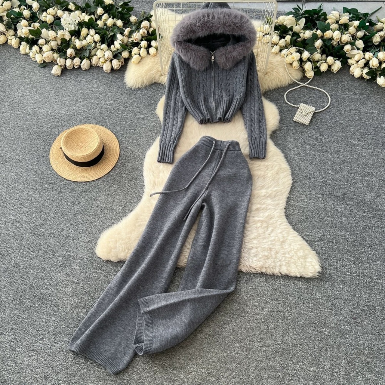 【set】ファーフードニットジャケットxパンツ2色 HN0053