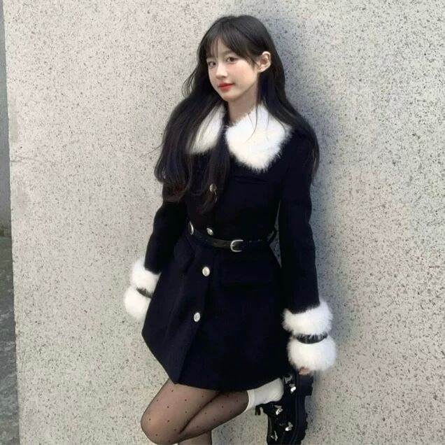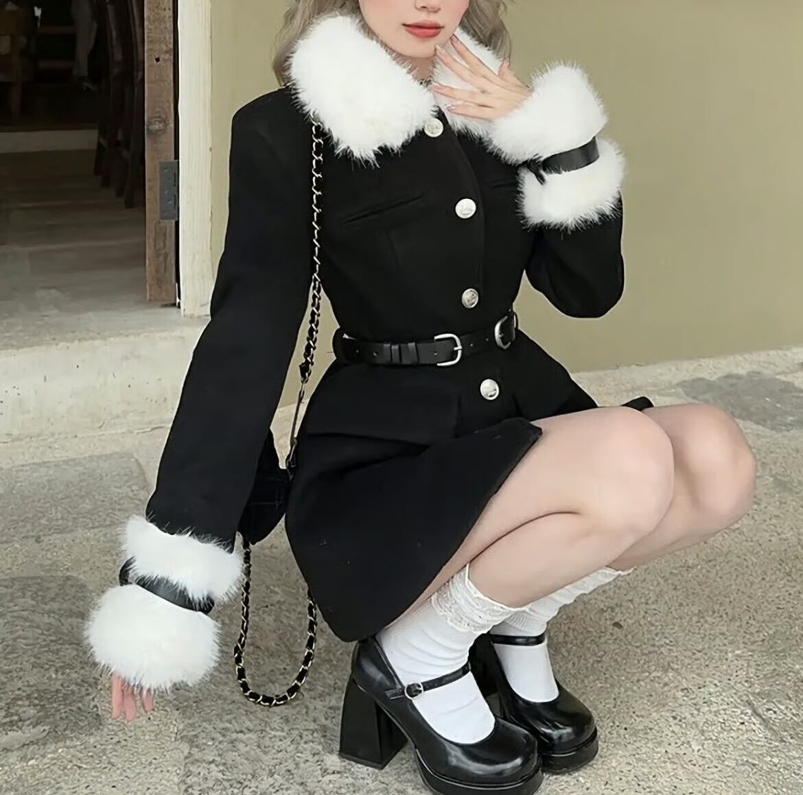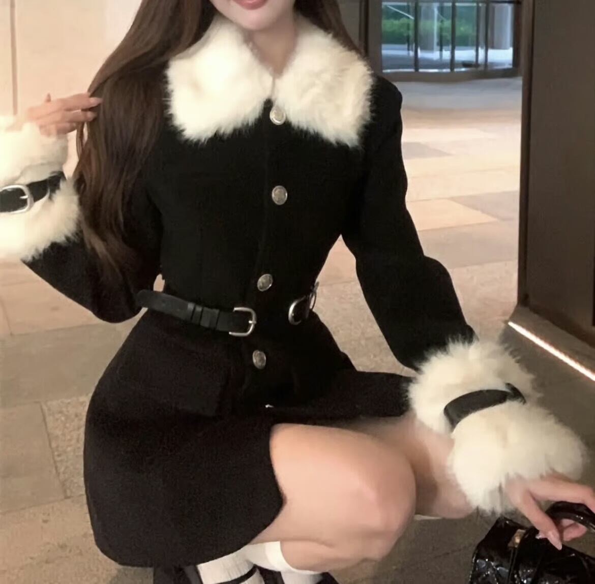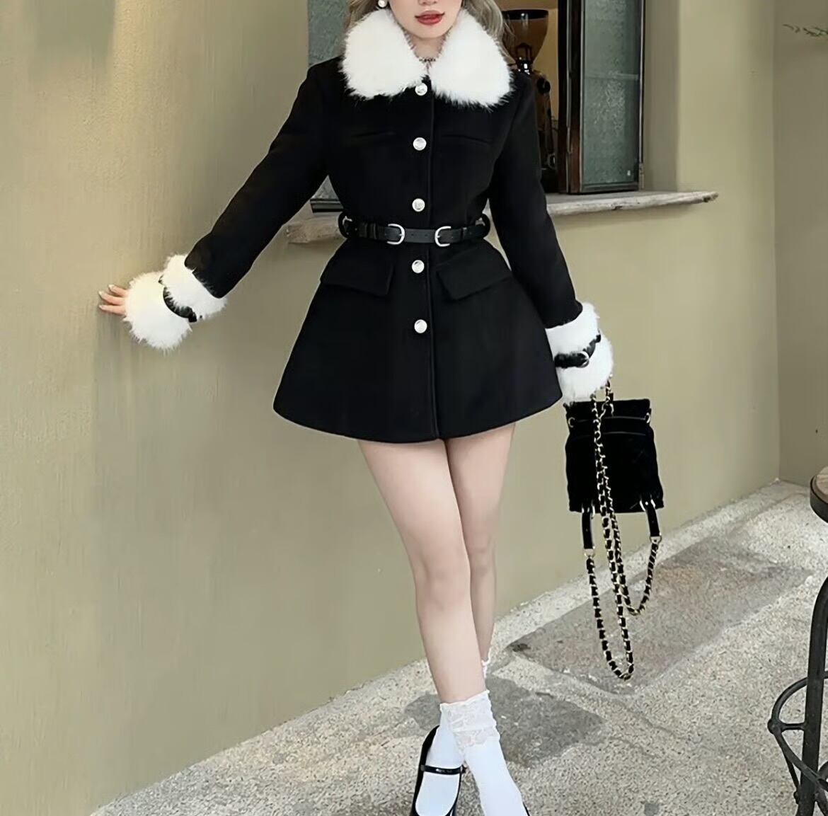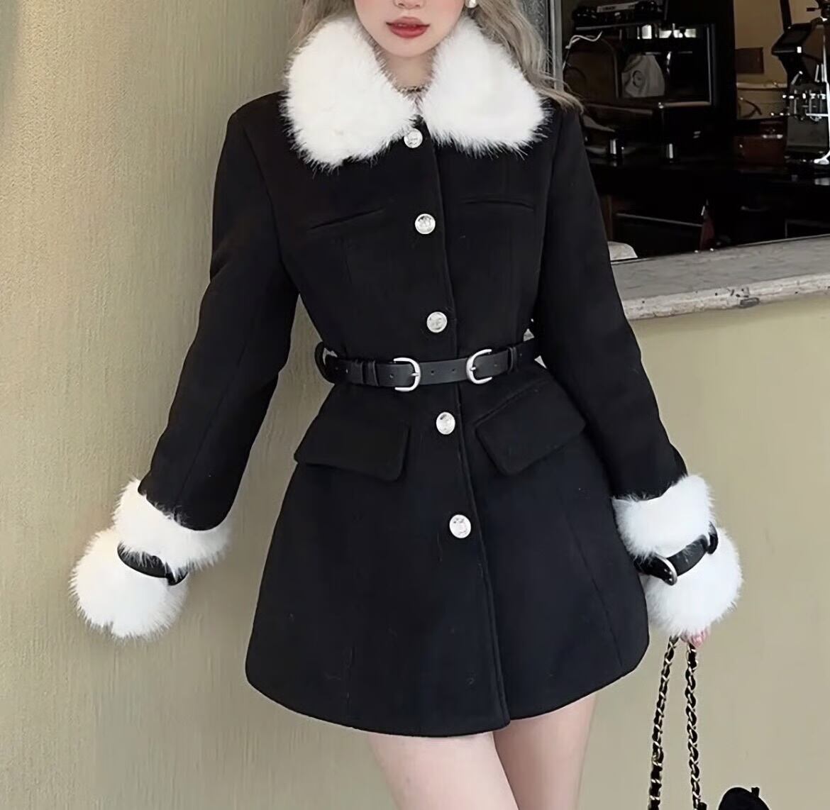 【outer】ベルトホワイトファー付きコート HK0263