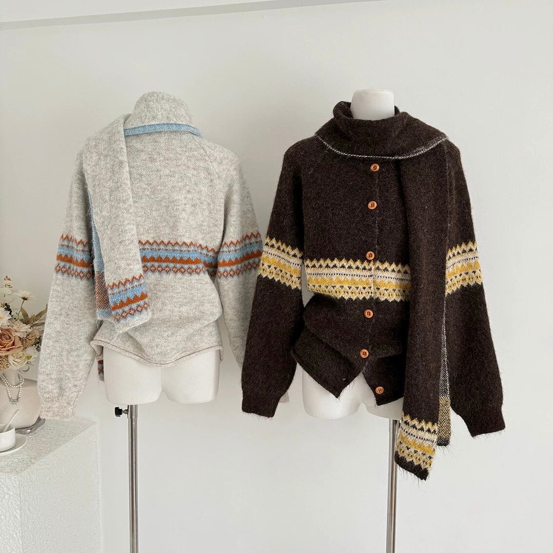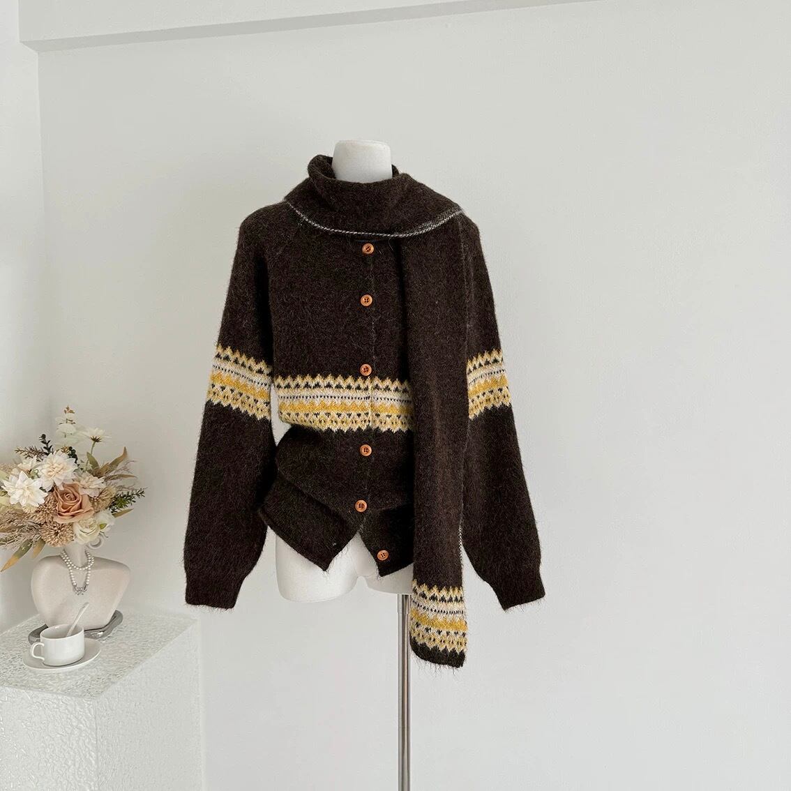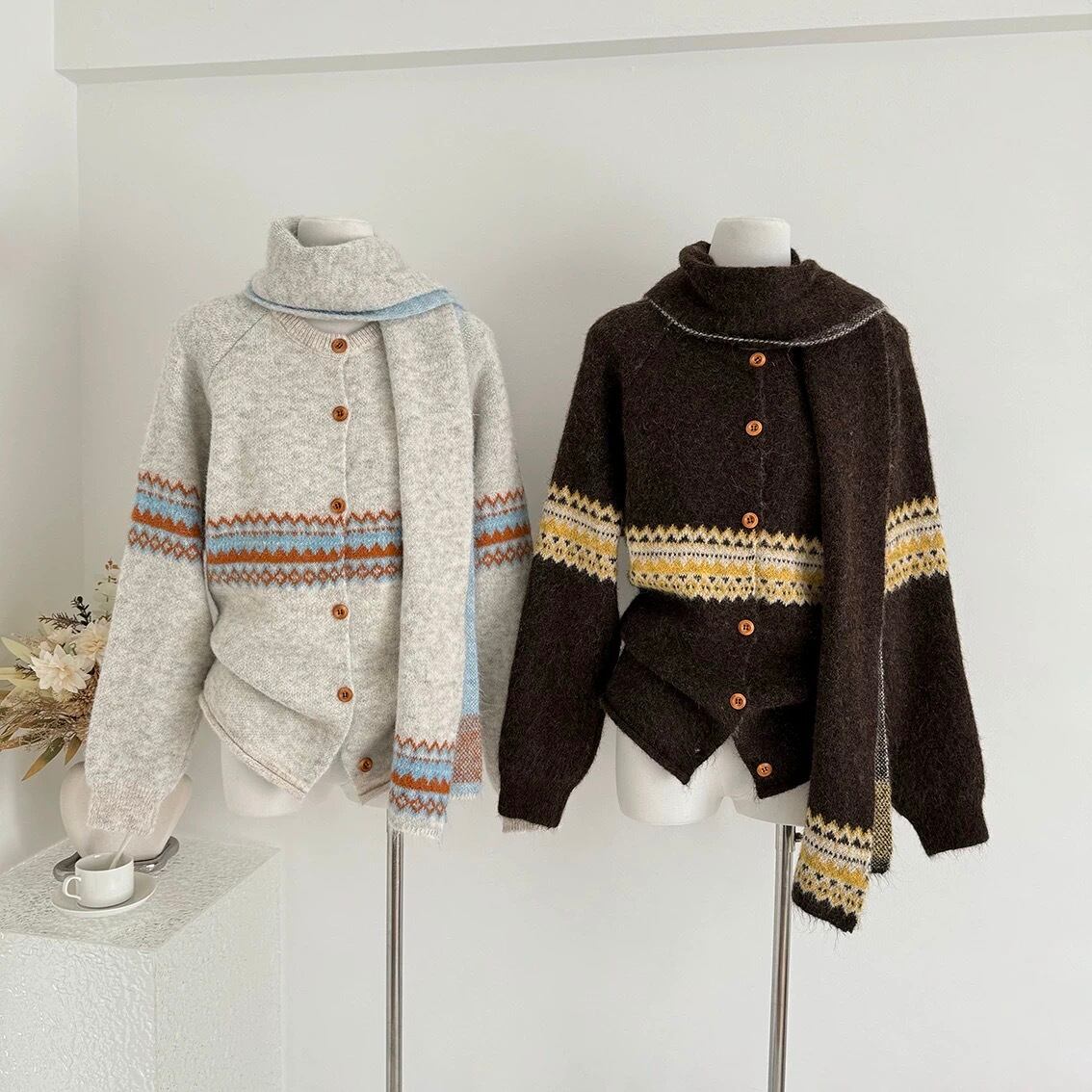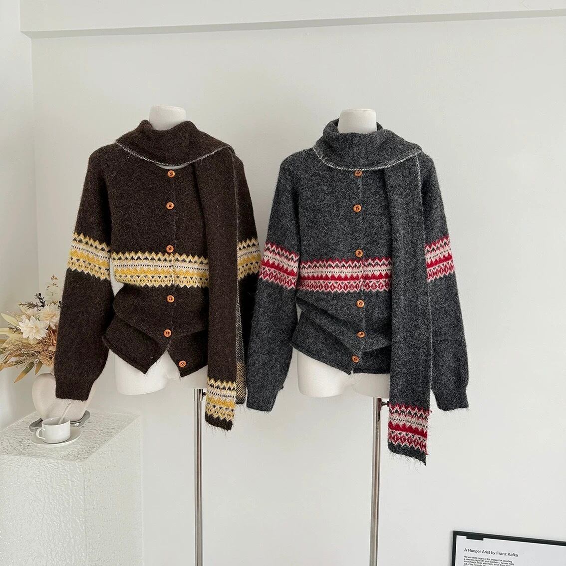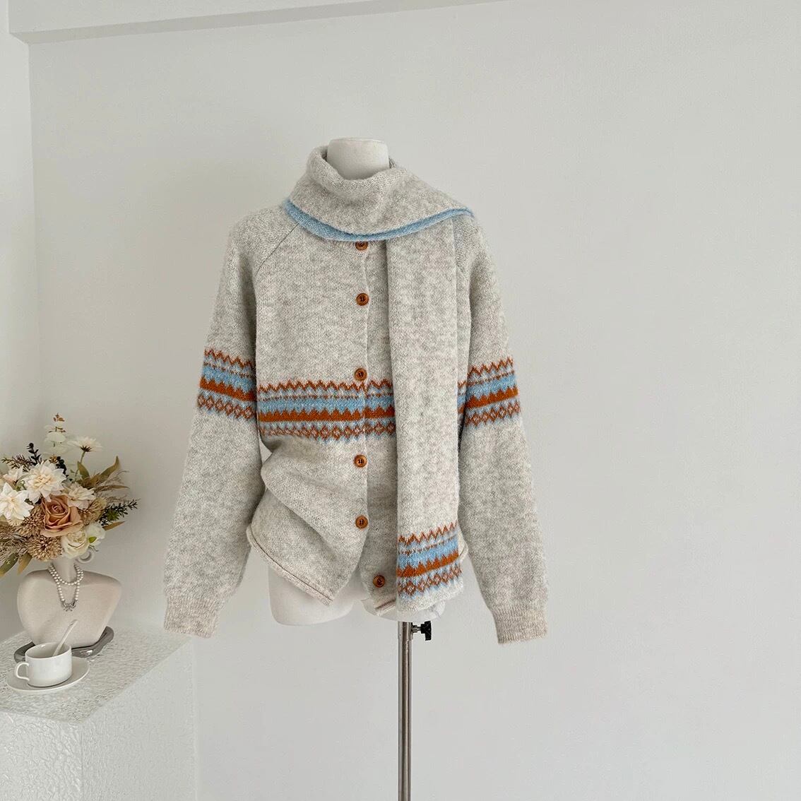【outer】マフラー付き模様カーディガン3色 RD015