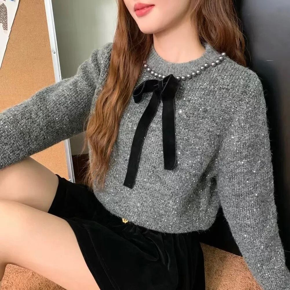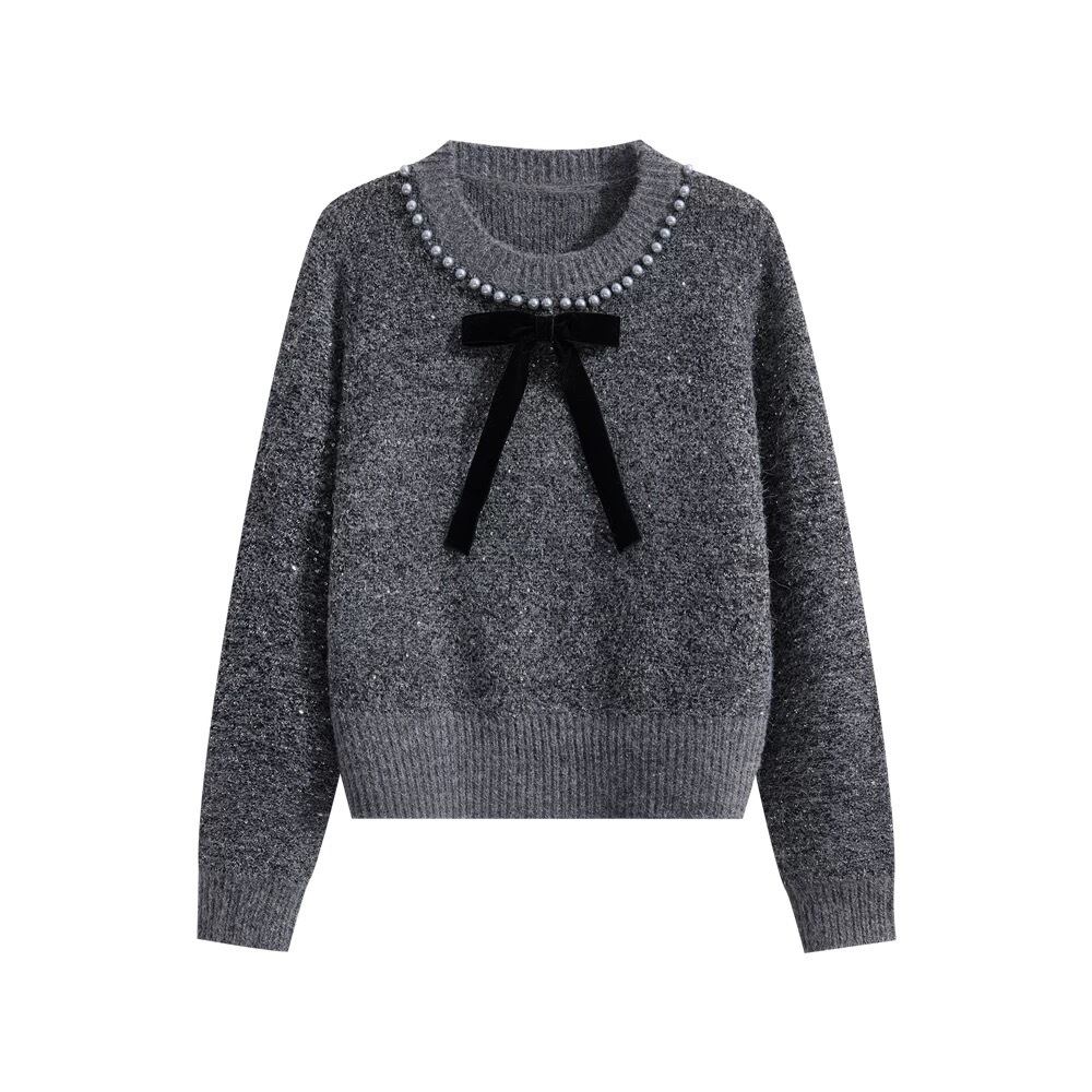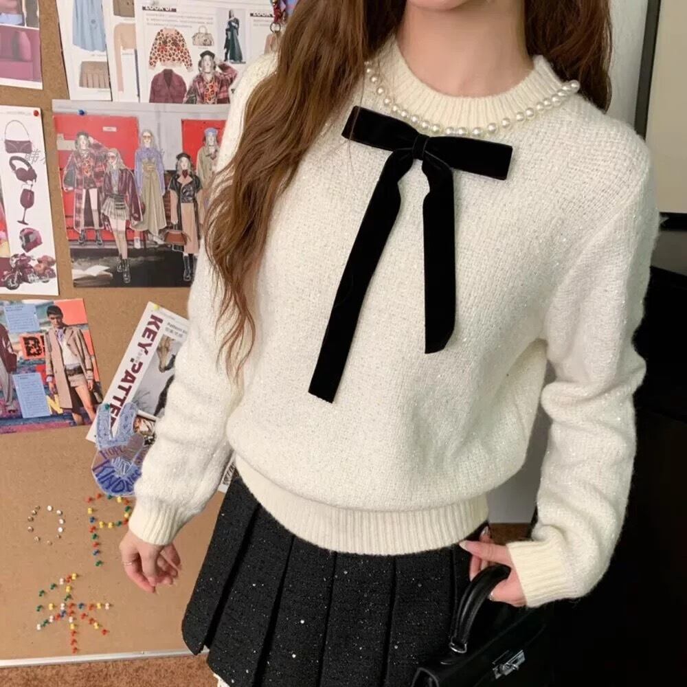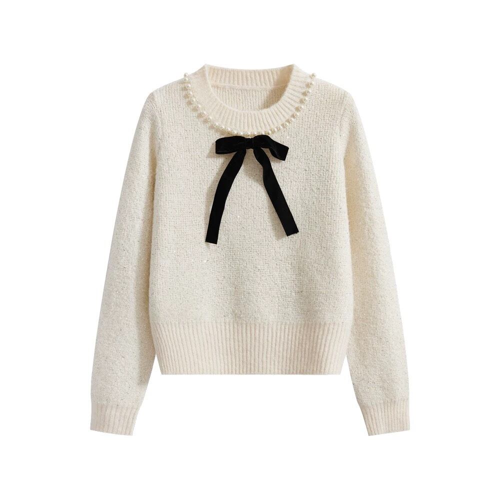 【tops】リボンパールラインニットトップス2色 YA0089