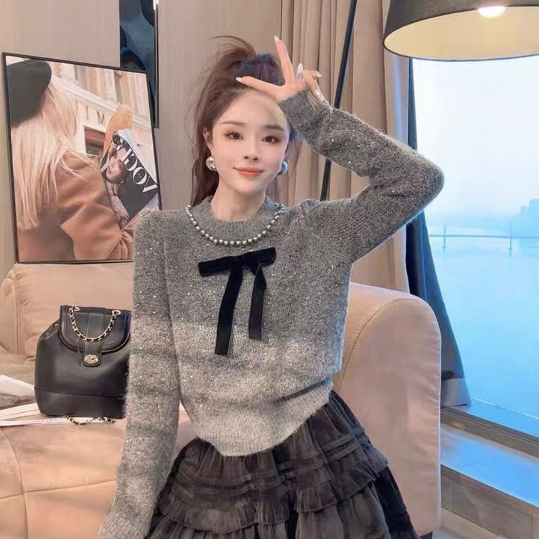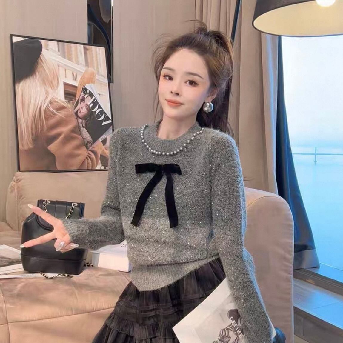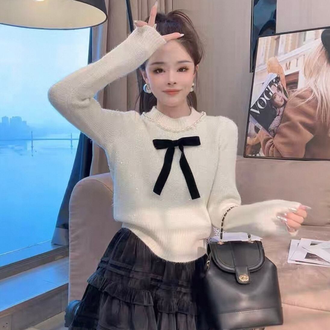 【tops】リボンパールラインニットトップス2色 YA0089