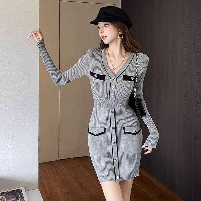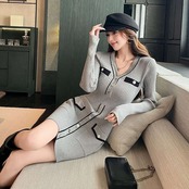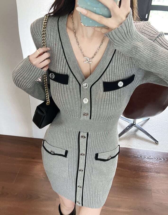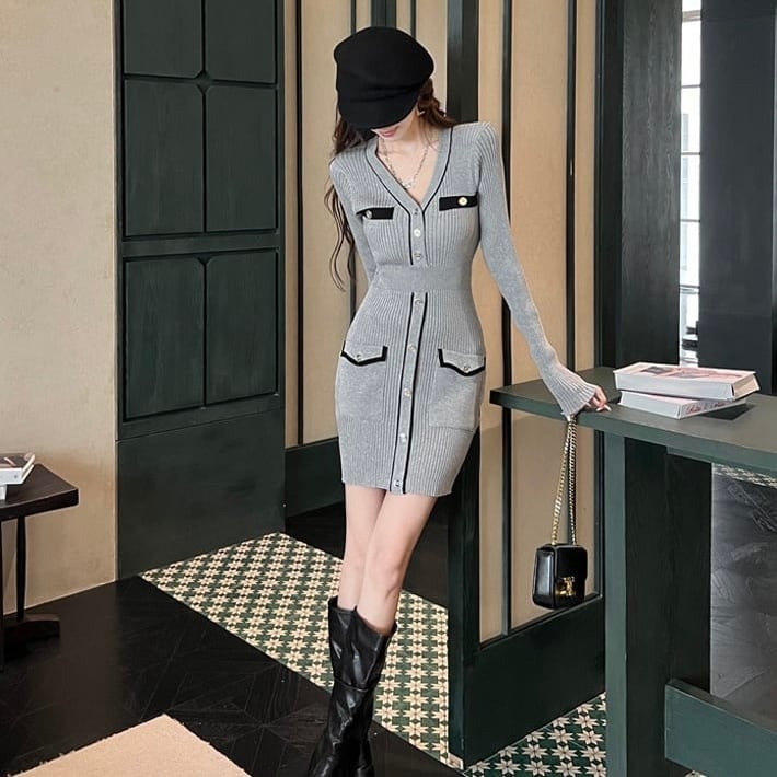 【dress】Vネックタイトニットワンピース HK0295