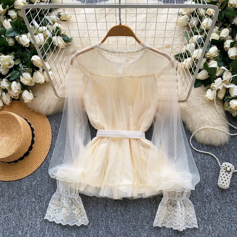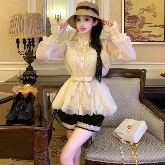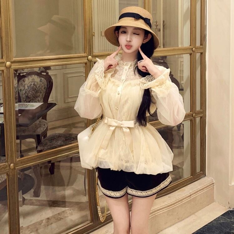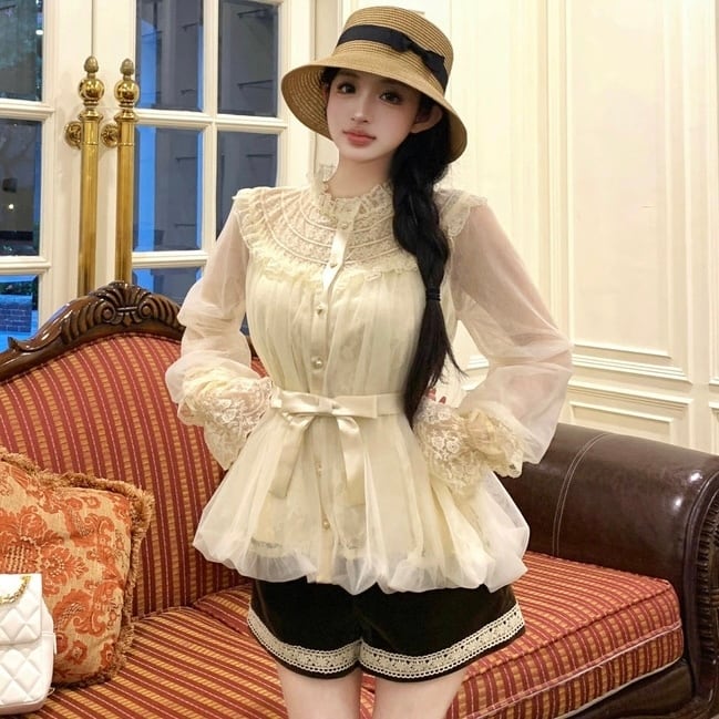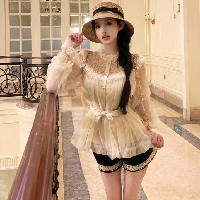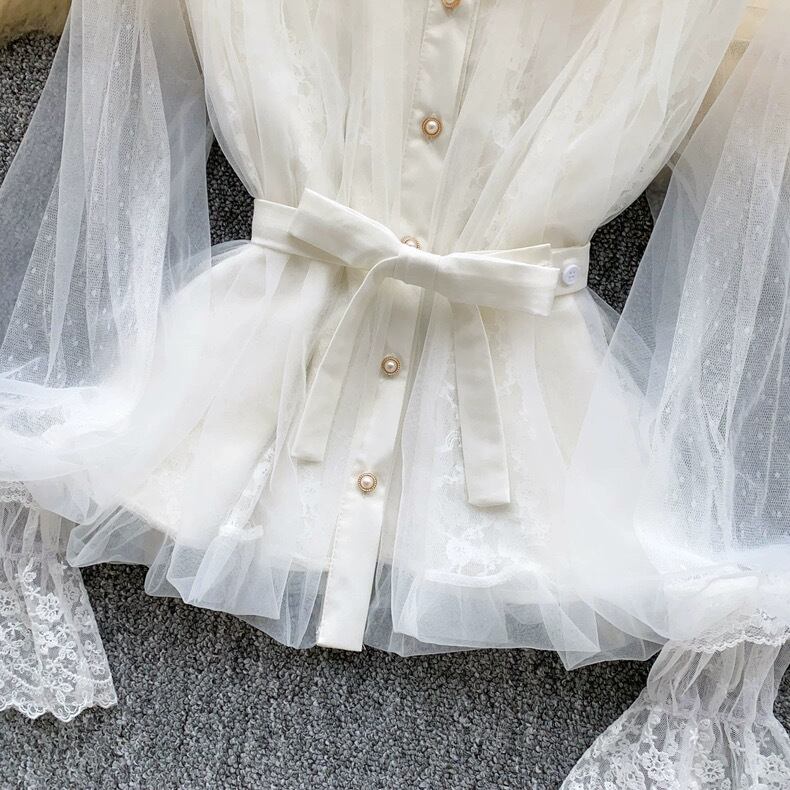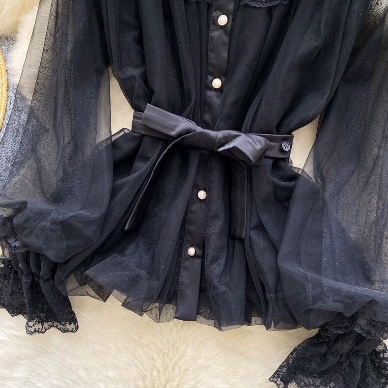 【tops】リボンベルトチュールシャツトップス3色 RY6006