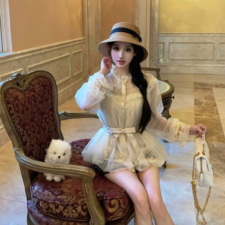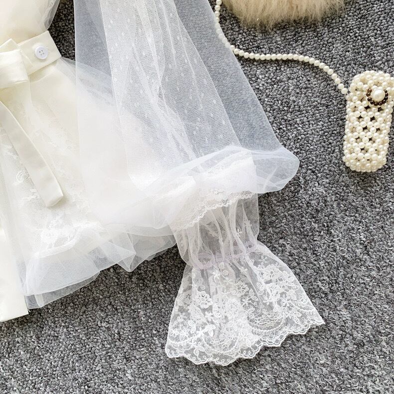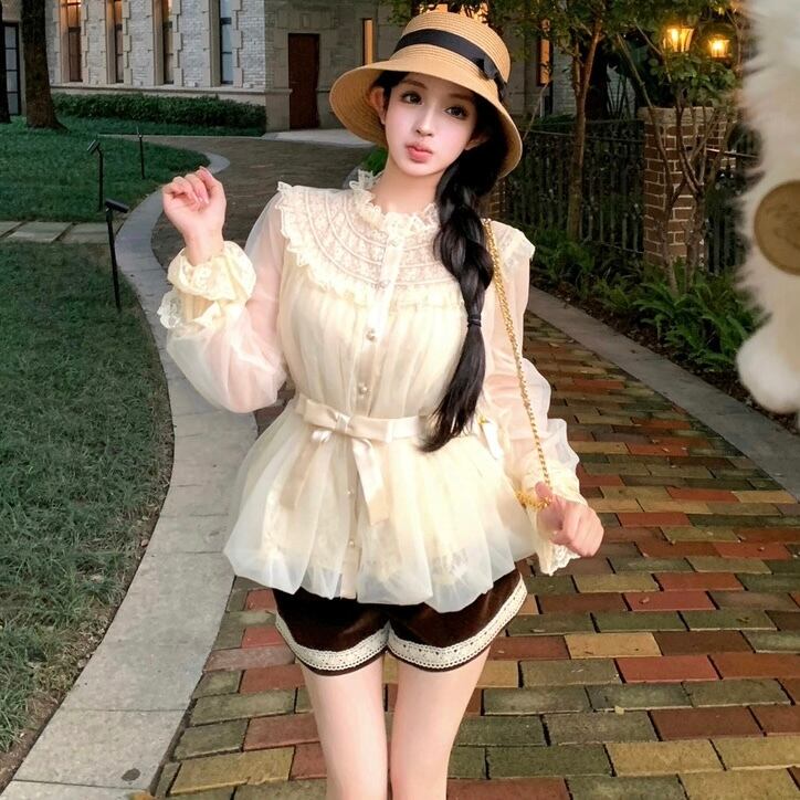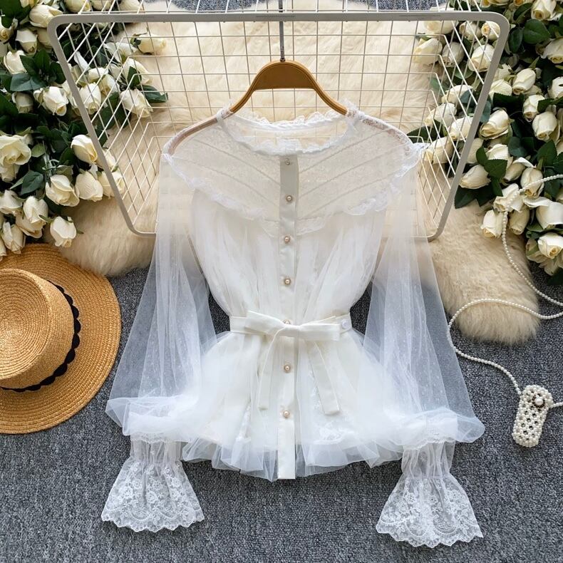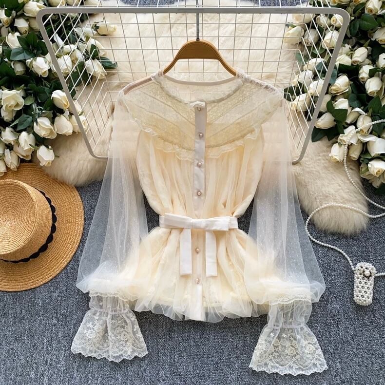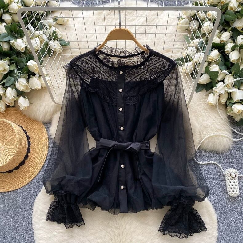 【tops】リボンベルトチュールシャツトップス3色 RY6006