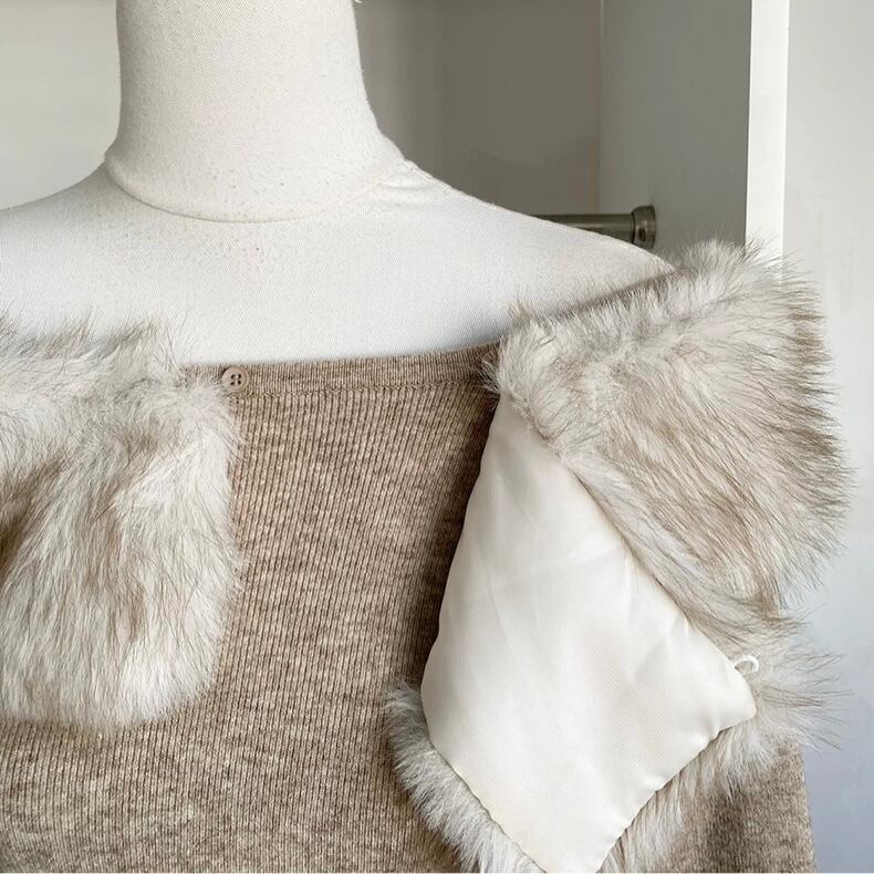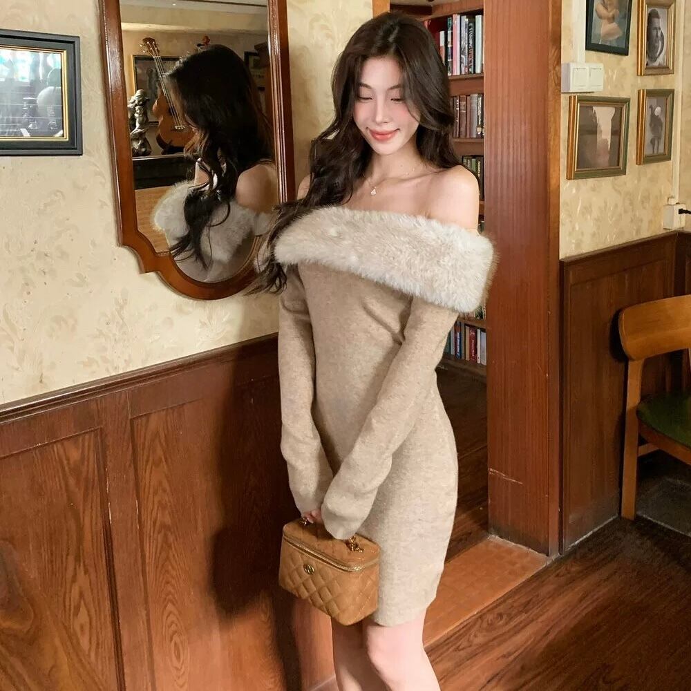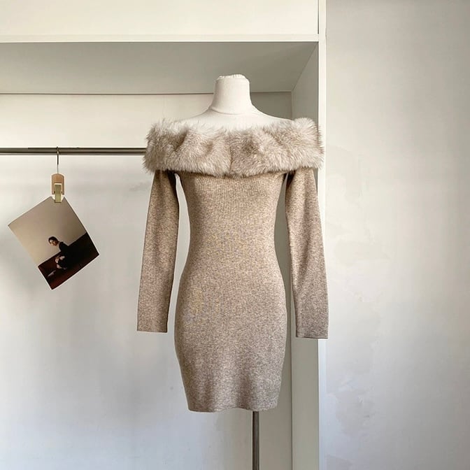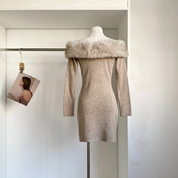 【dress】取り外し可能ファーオフショルダーニットワンピース RY7013