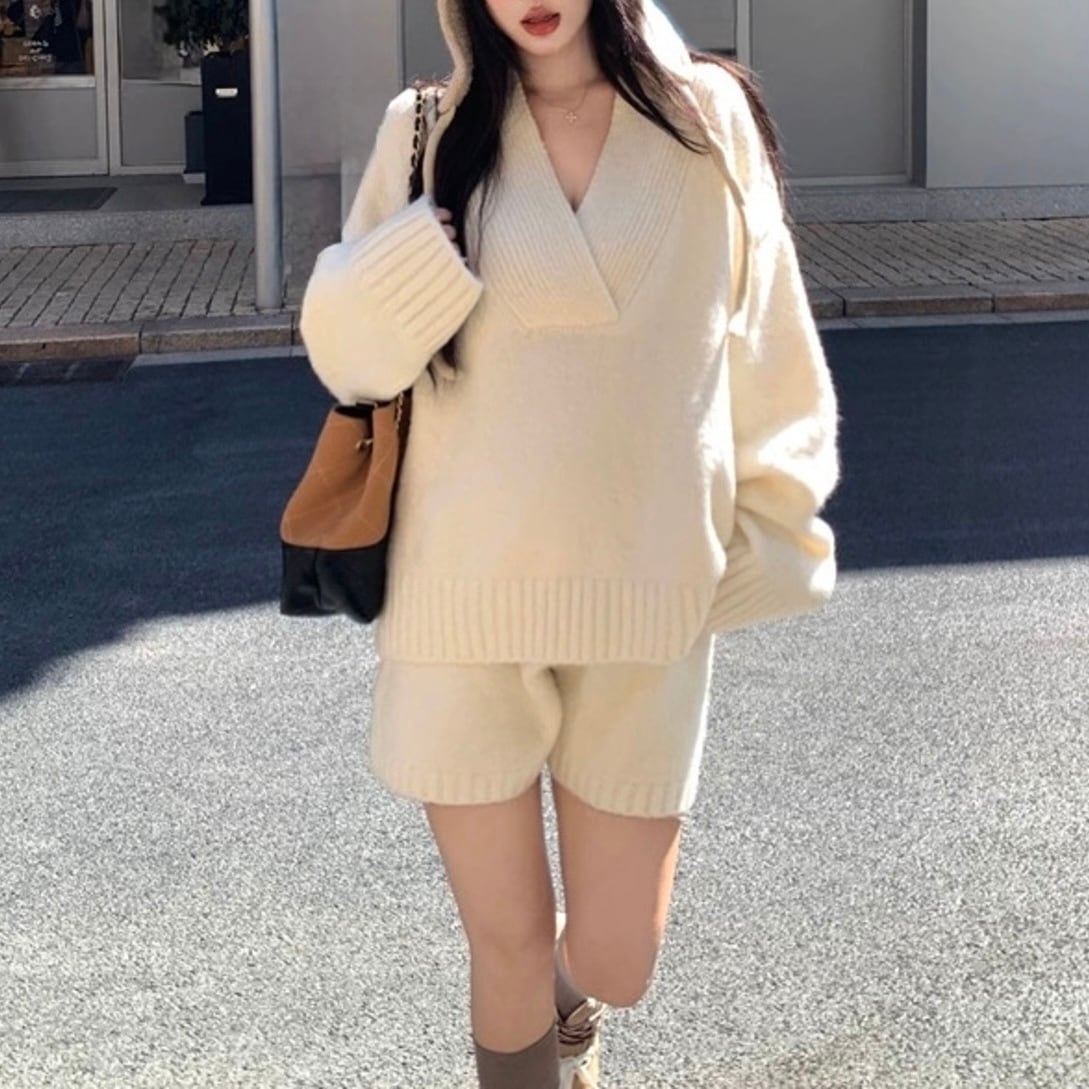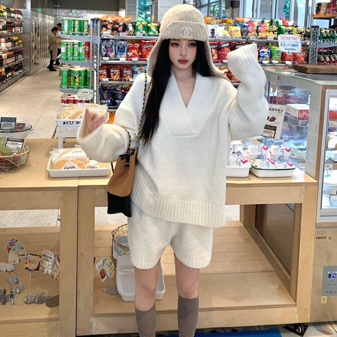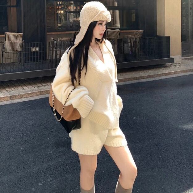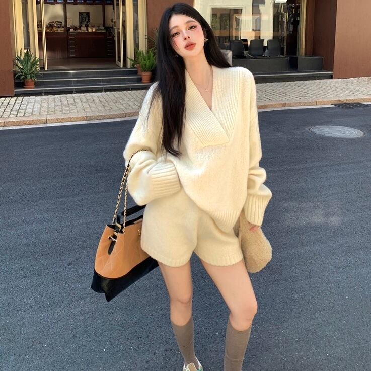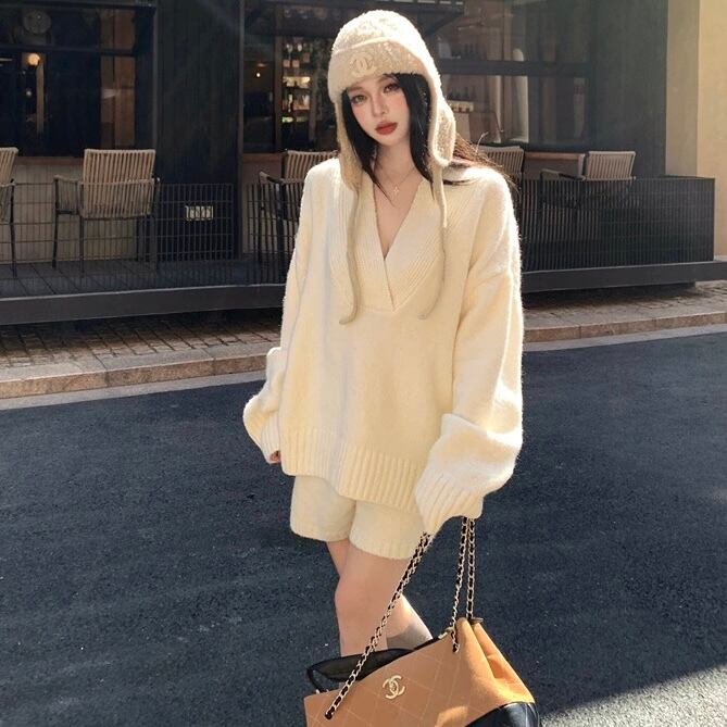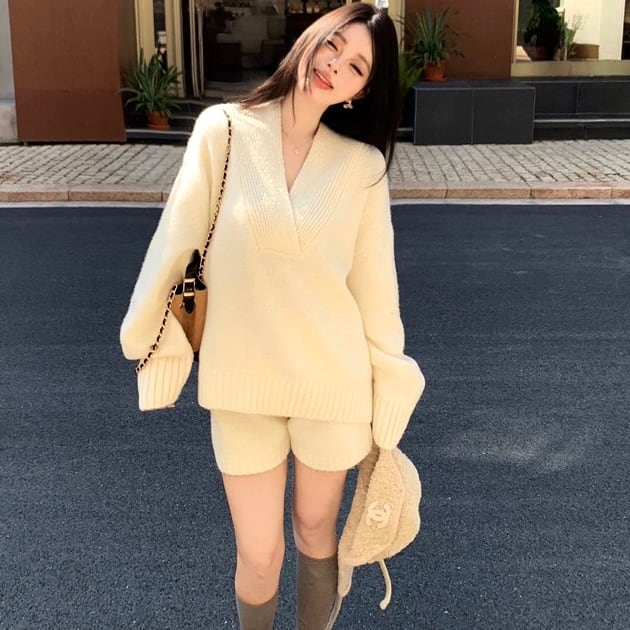 【set】2色Vネックニットトップスxショートパンツ RY1003