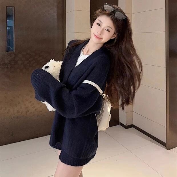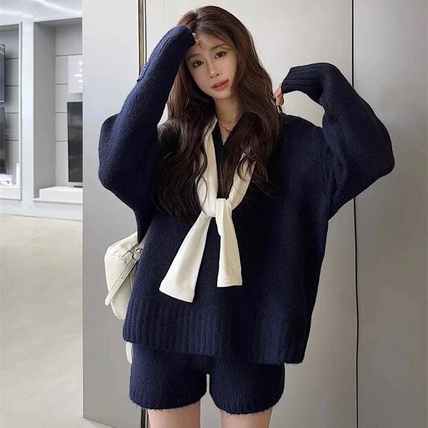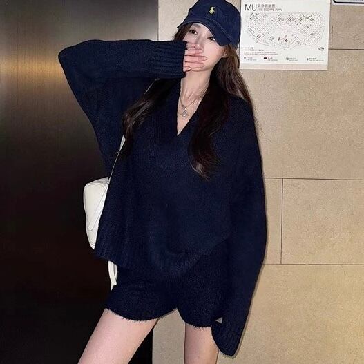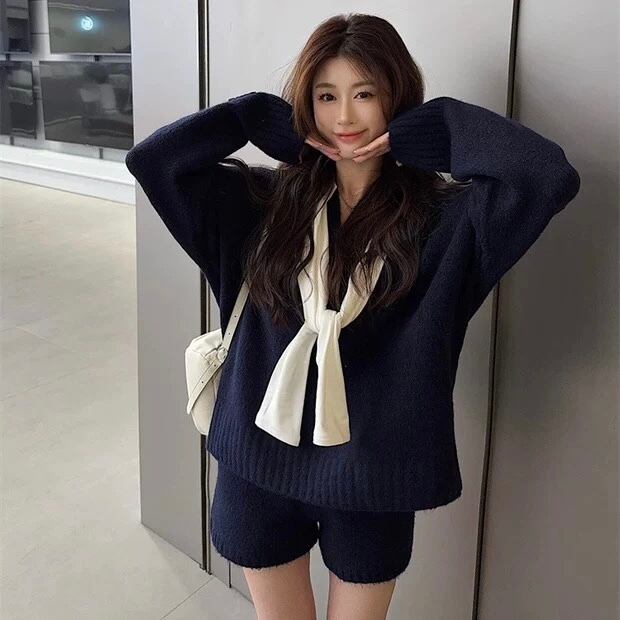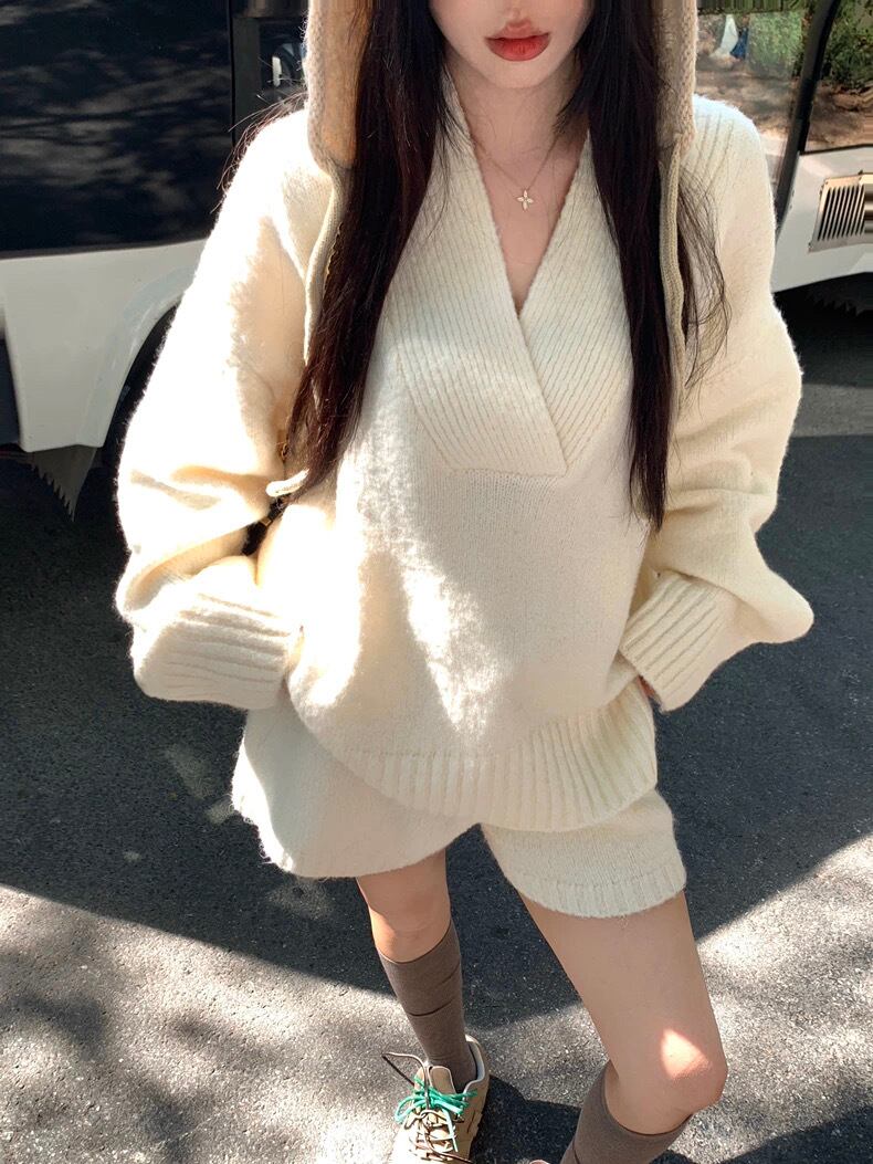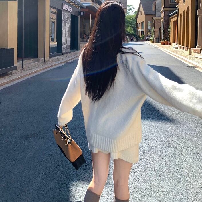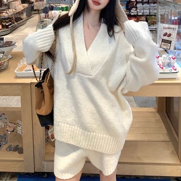 【set】2色Vネックニットトップスxショートパンツ RY1003
