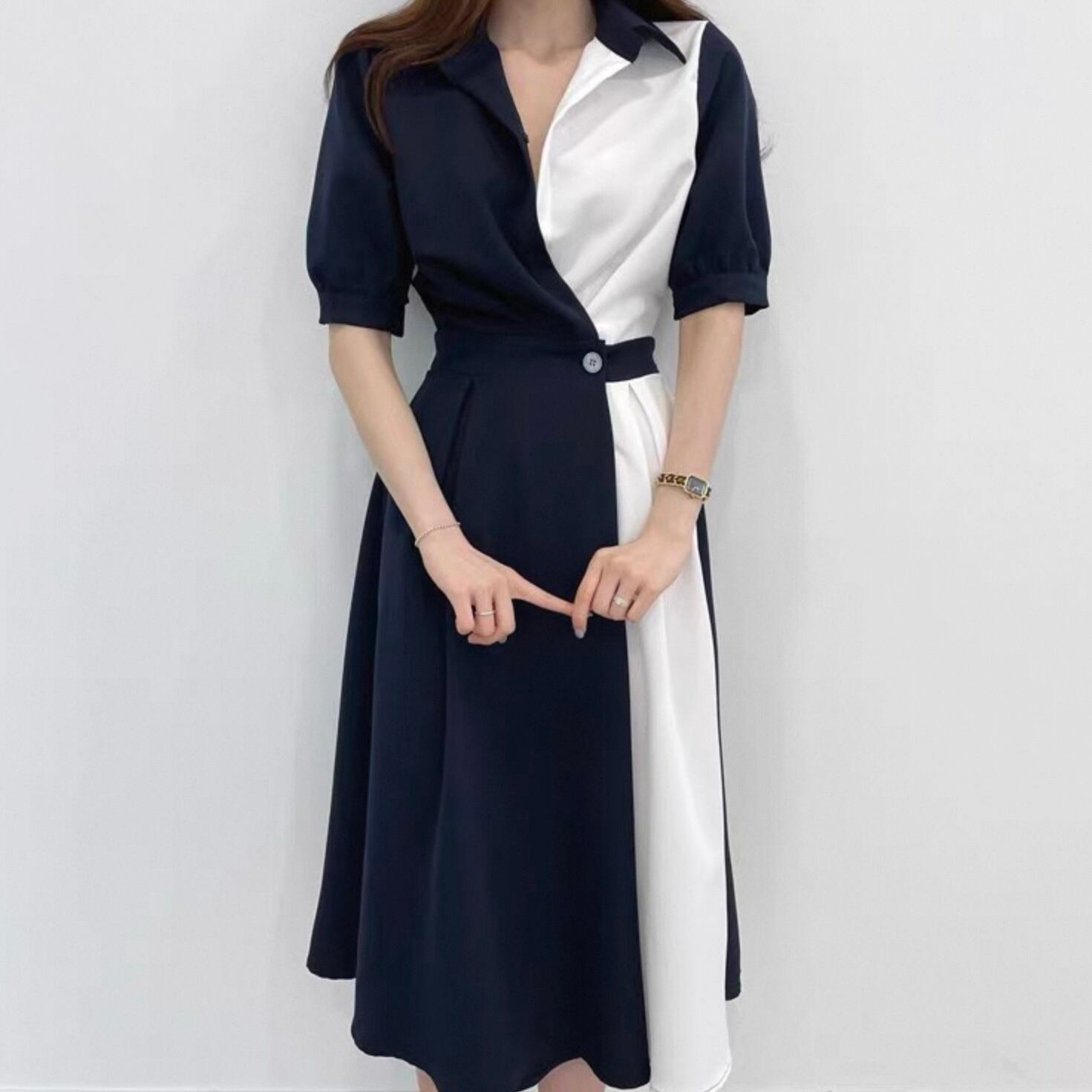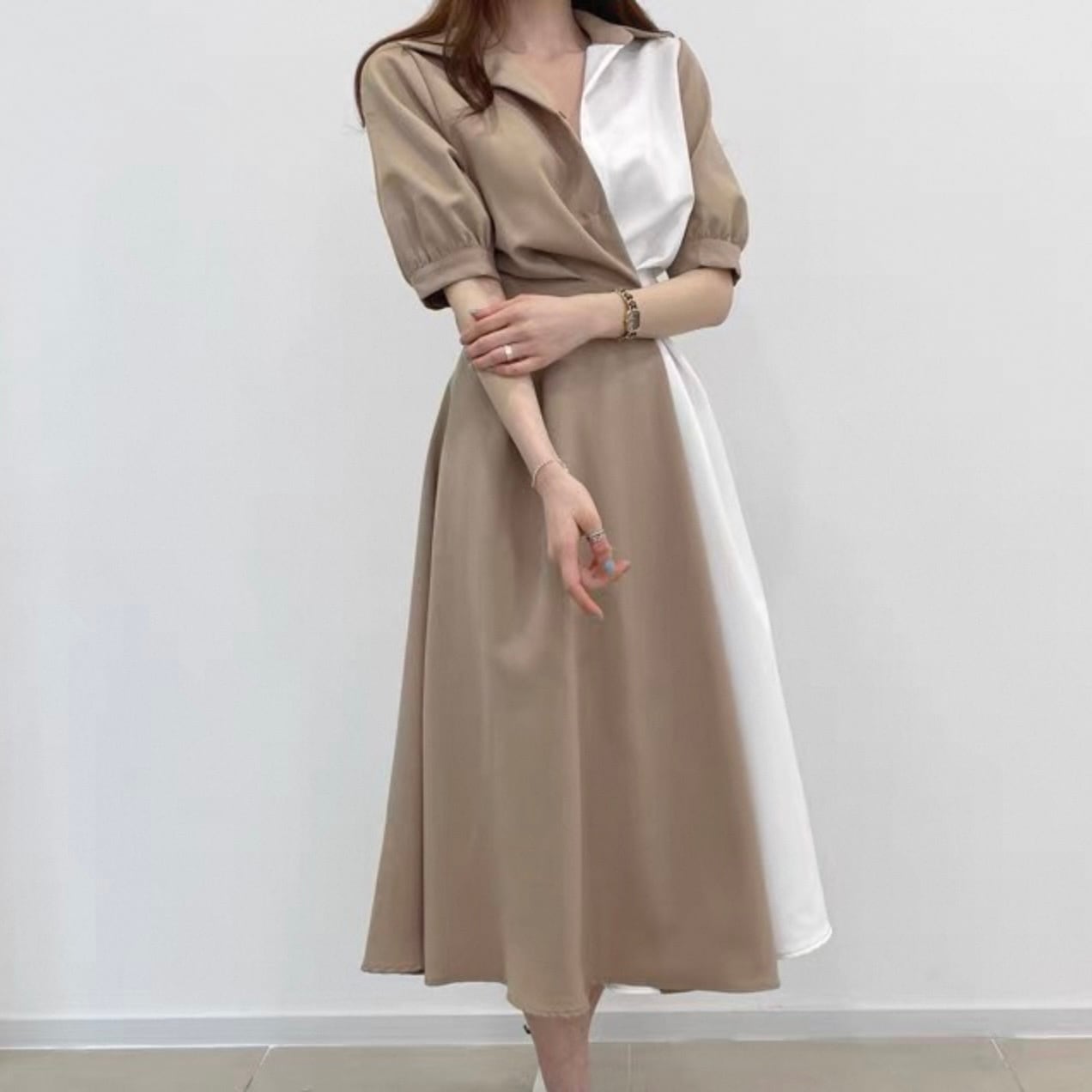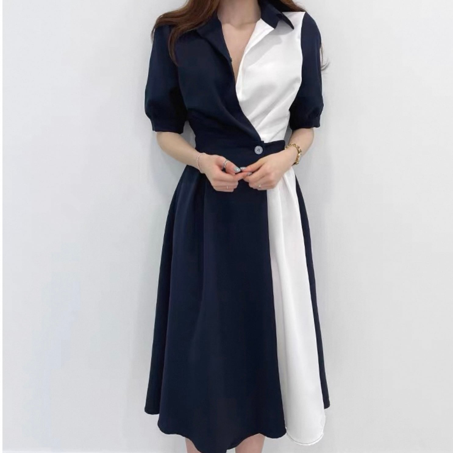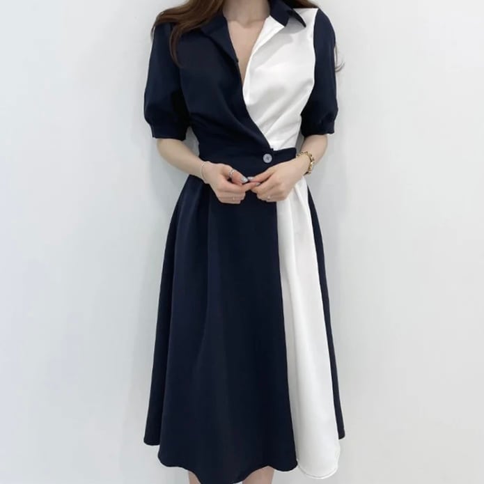 【dress】ロング丈コントラストステッチワンピース2色 HK0309