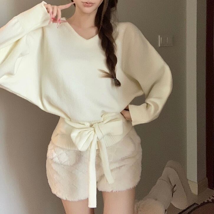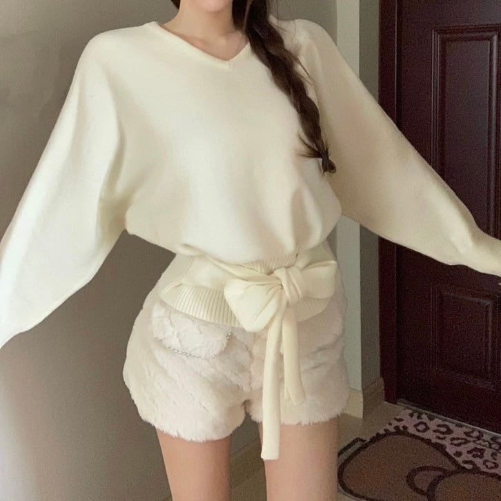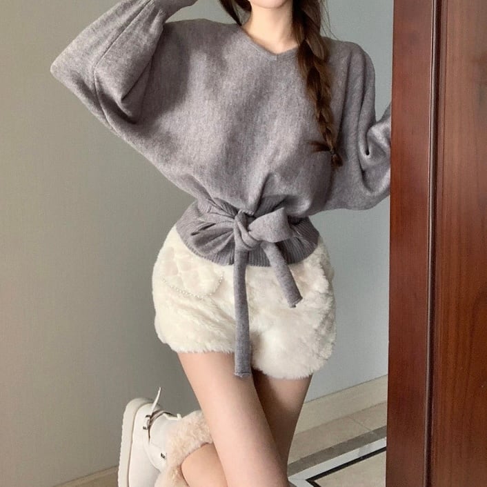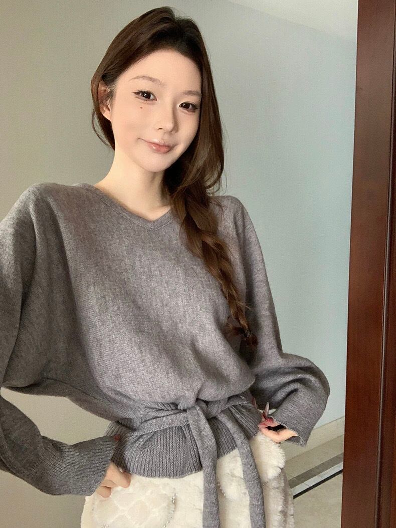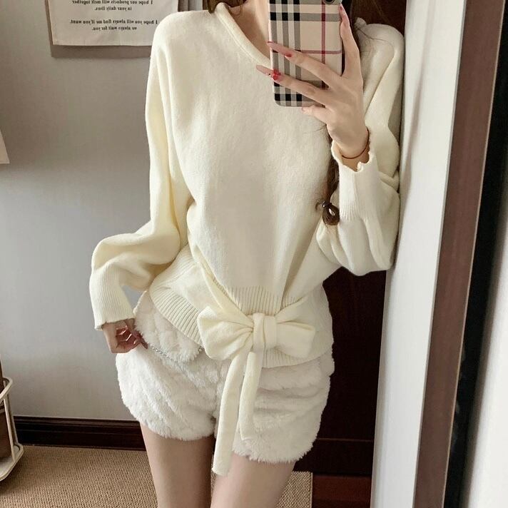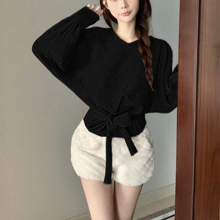 【tops】4色リボンベルト付きニットトップス RY2234