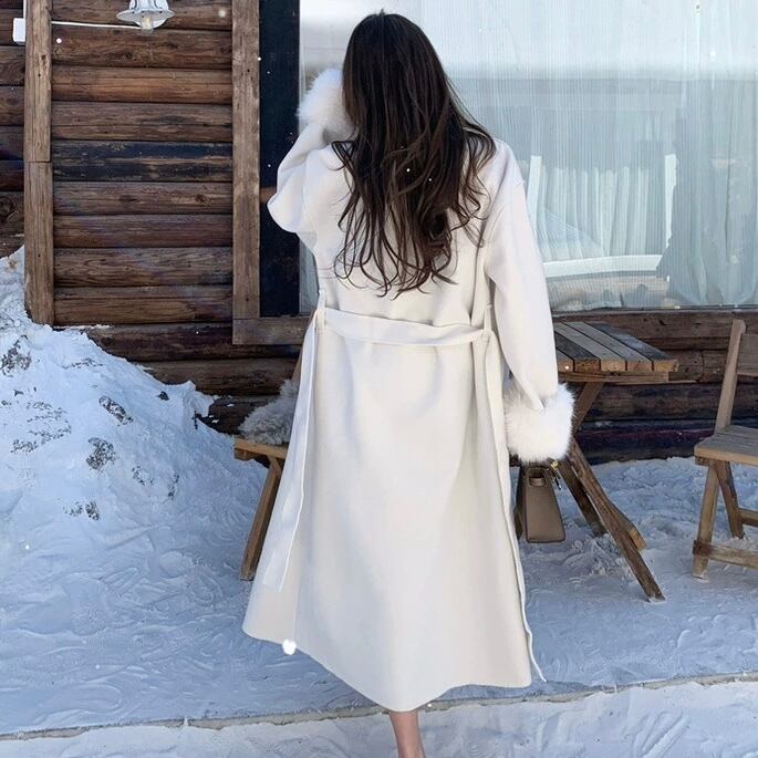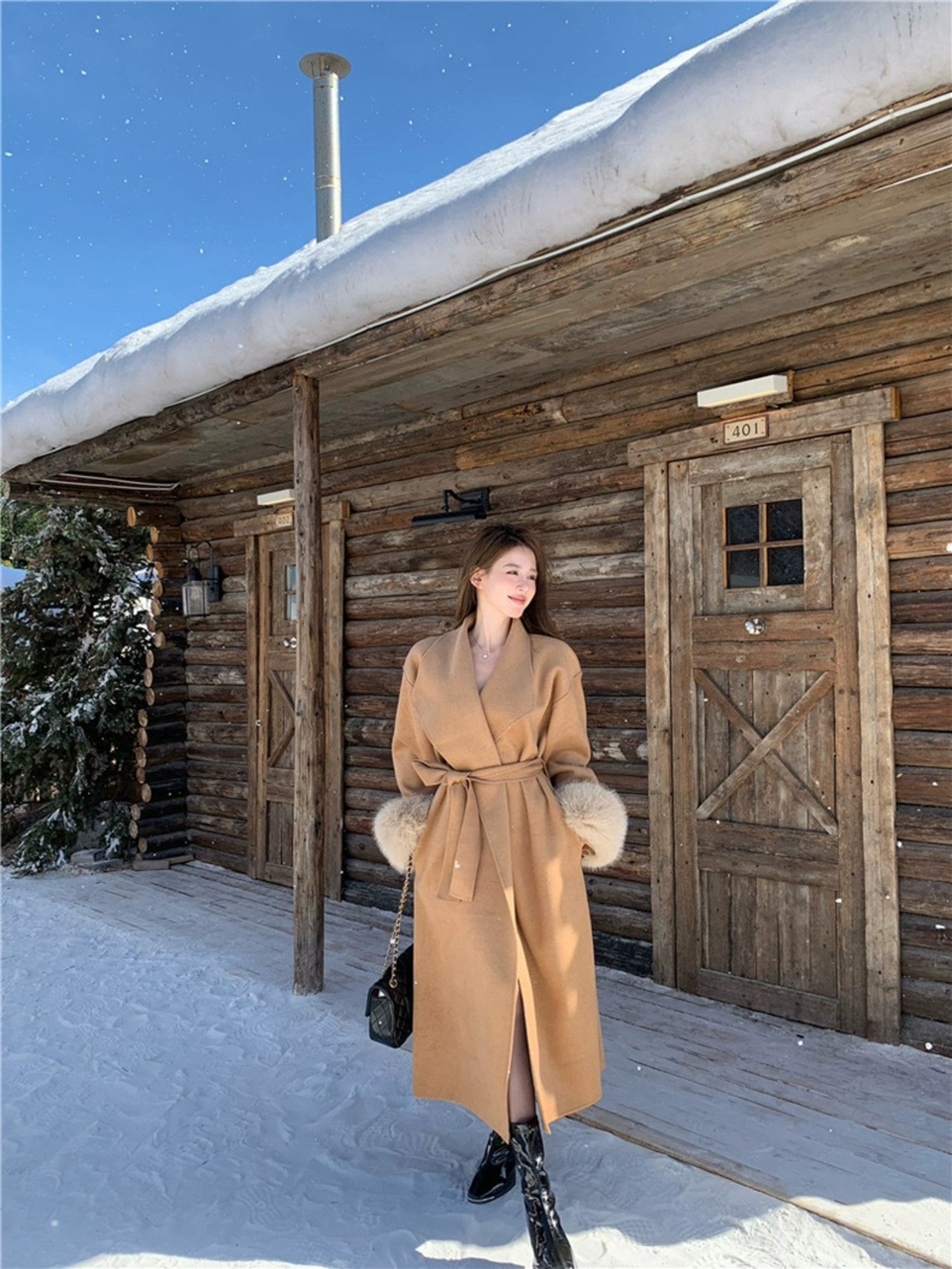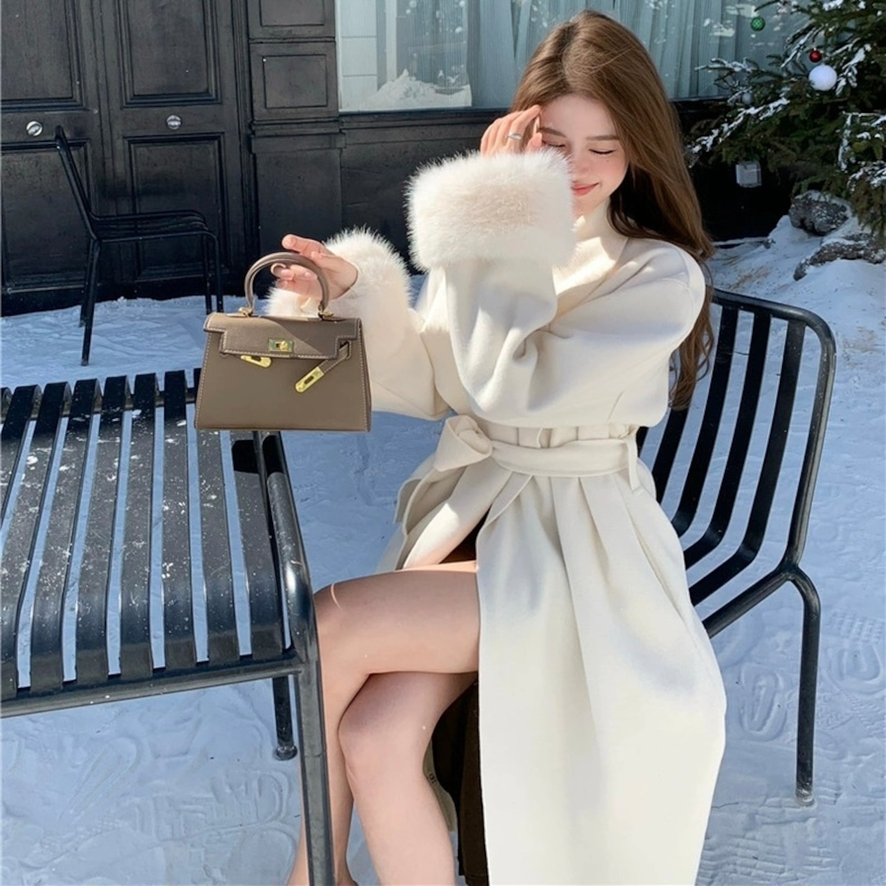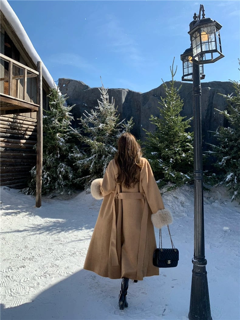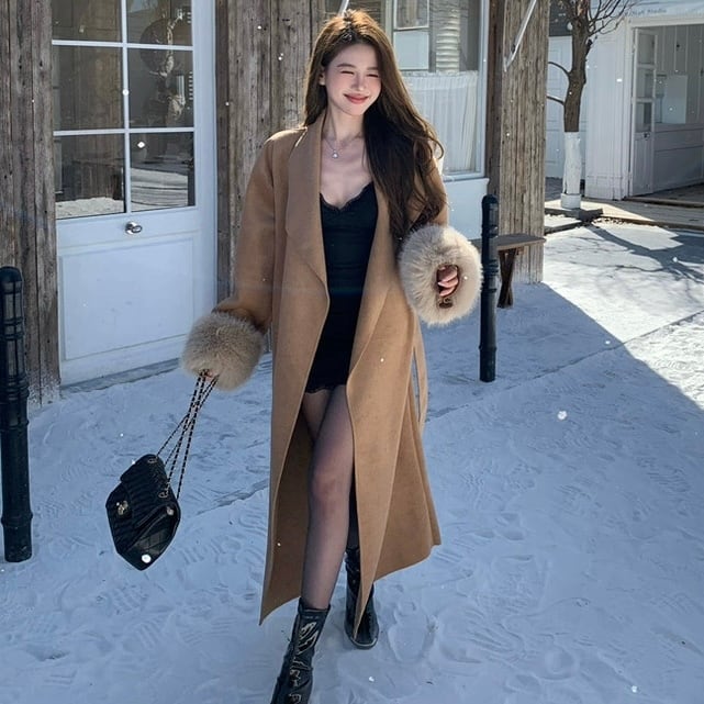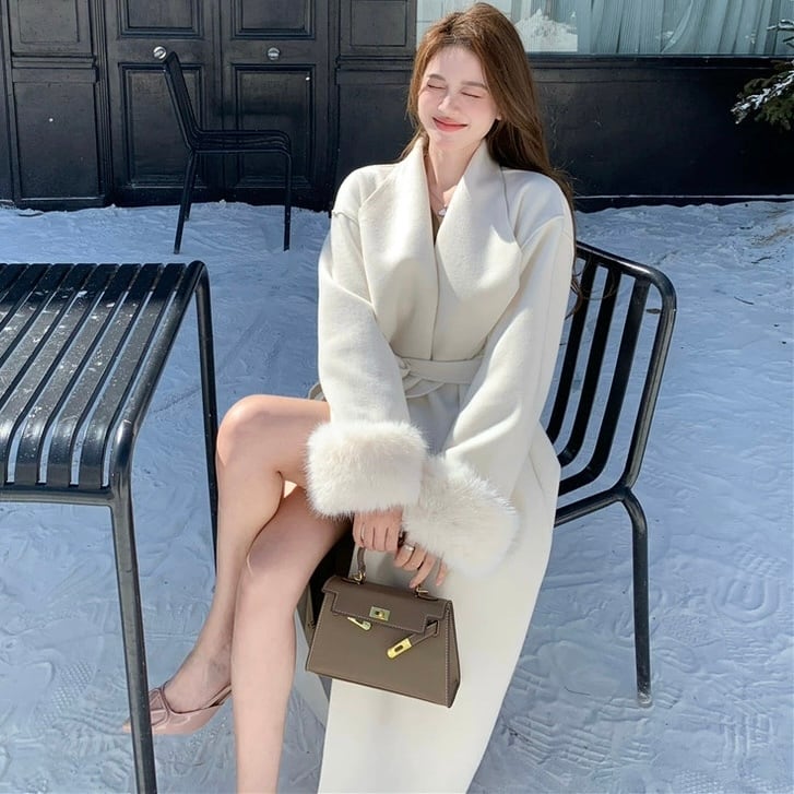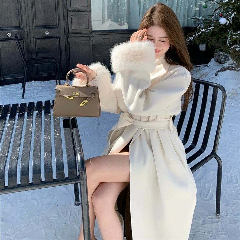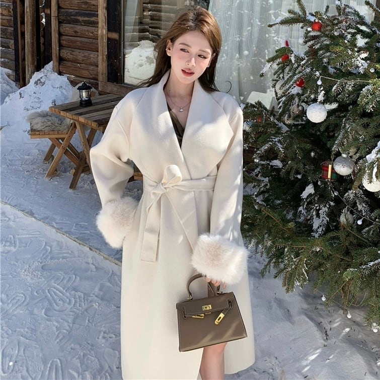 【outer】2色リボンベルト付きファー袖コート RY2412