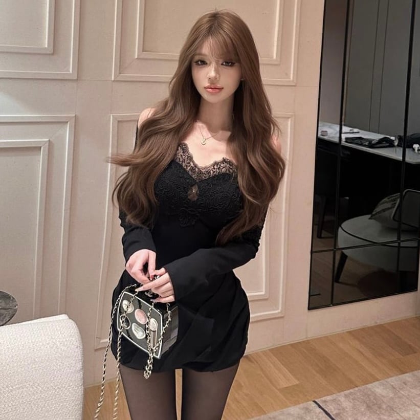 【dress】オフショルダーレースロングスリーブワンピース HK0321