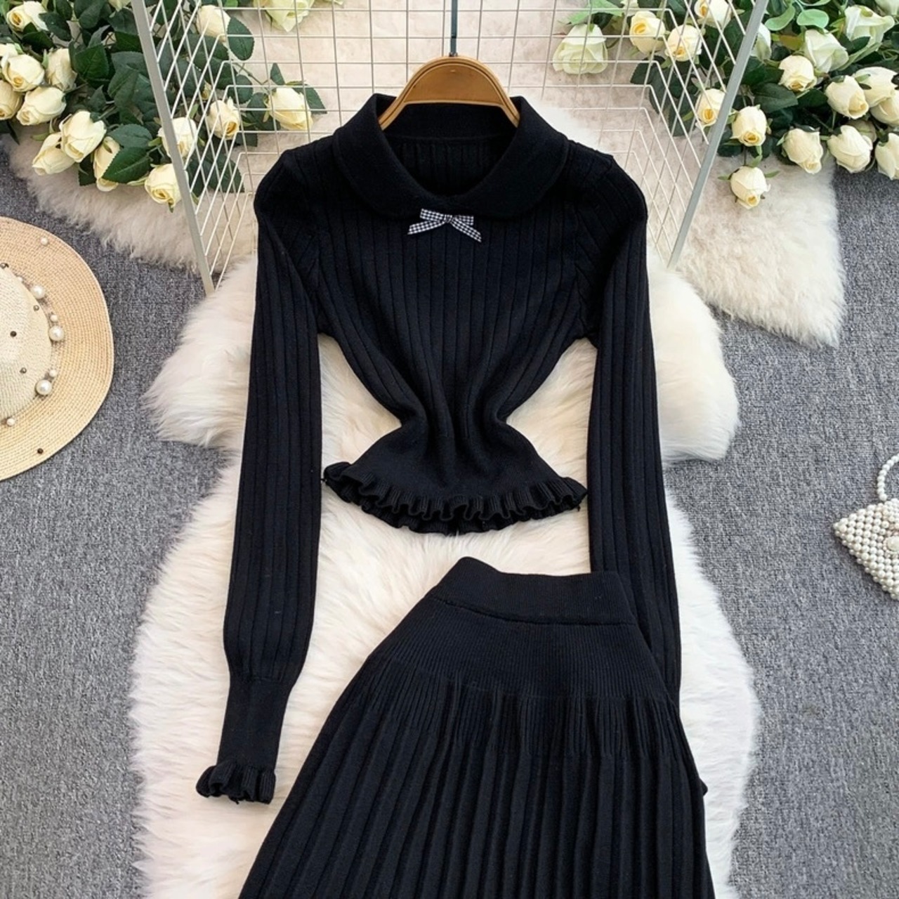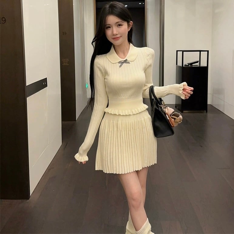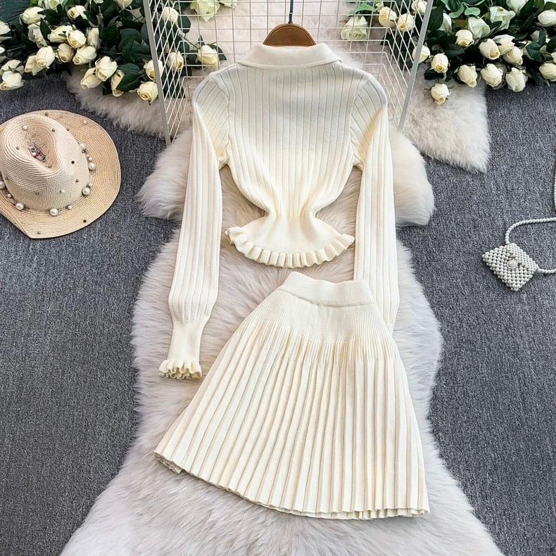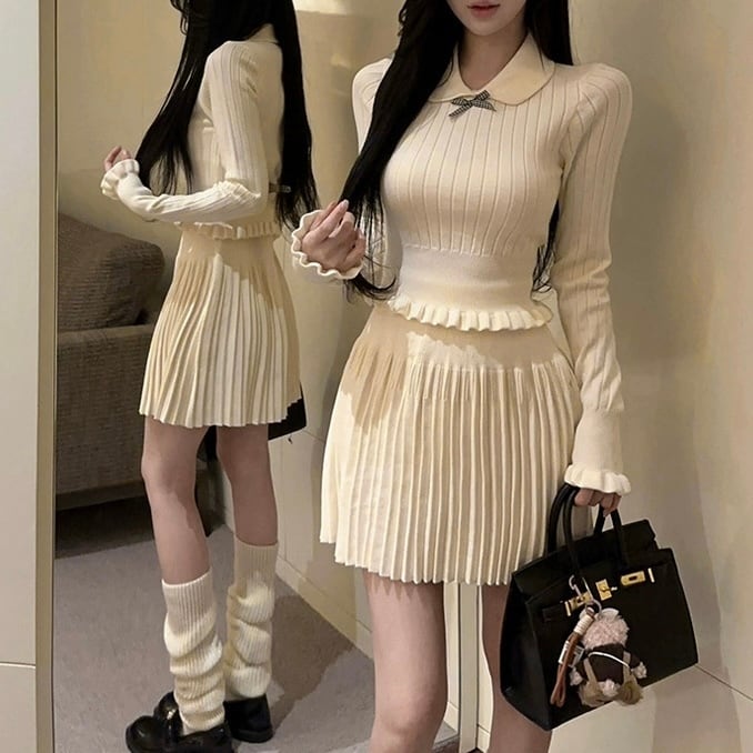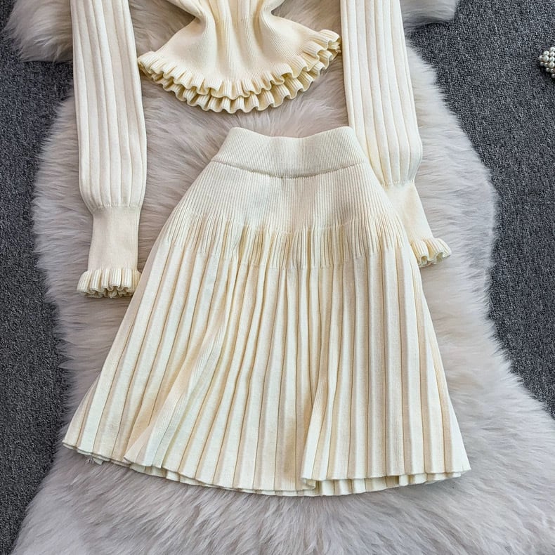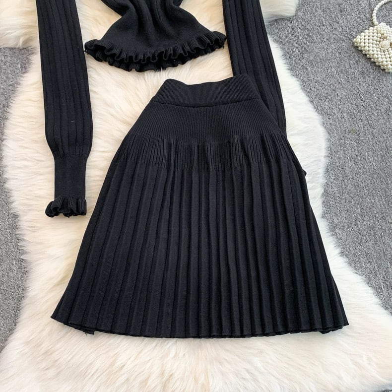 【set】2色ニットフリルトップスxプリーツスカートHB2123