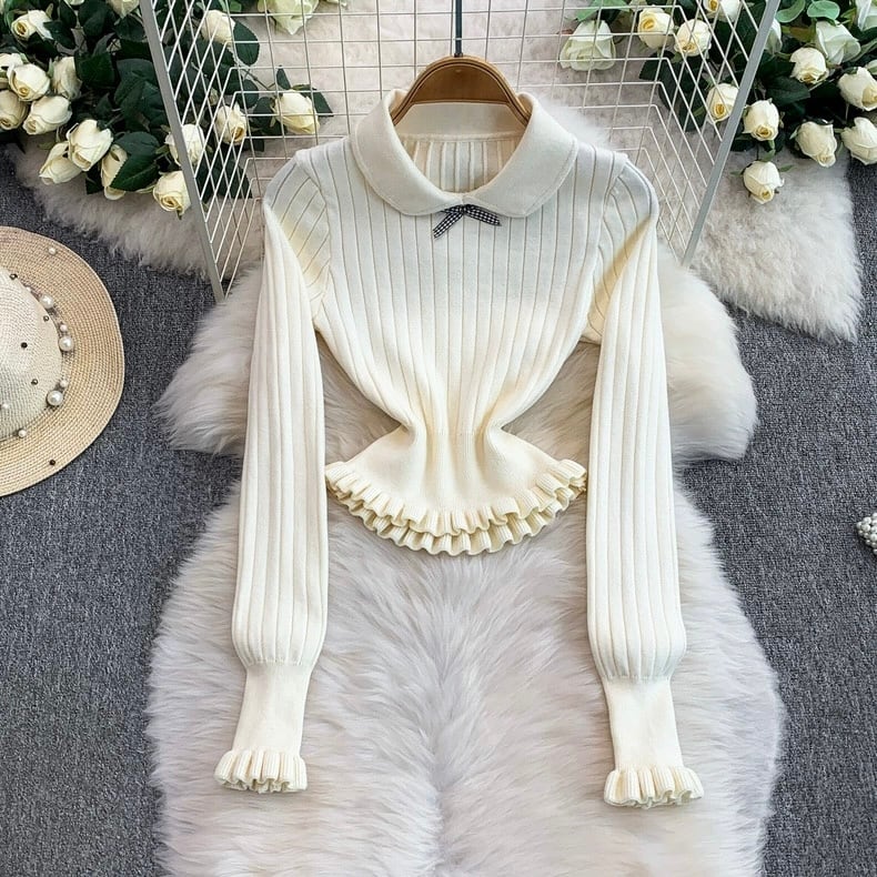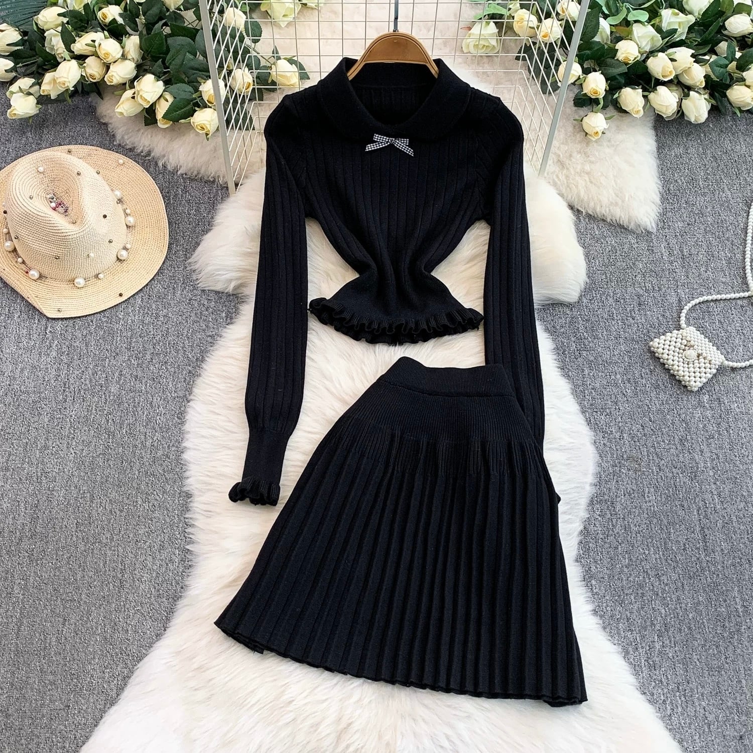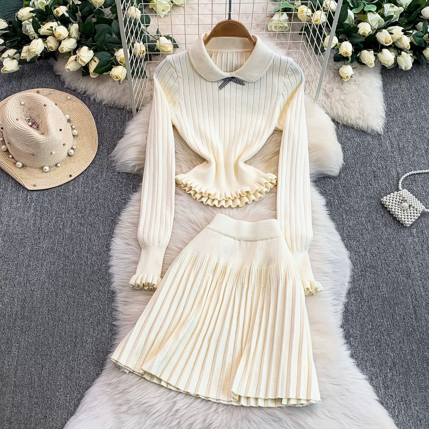 【set】2色ニットフリルトップスxプリーツスカートHB2123
