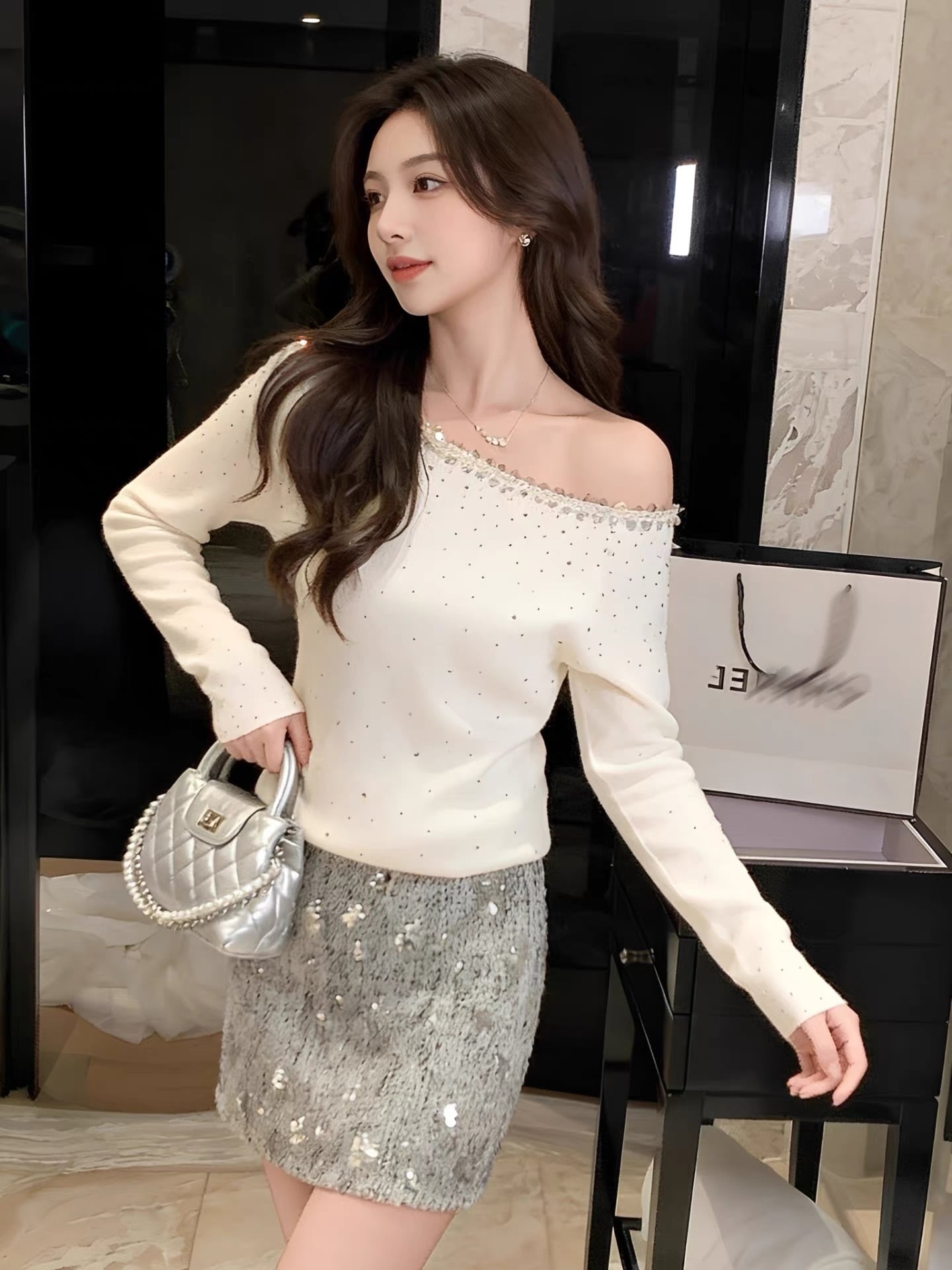 【tops】スパンコール付きクルーネックニットトップス HK0341