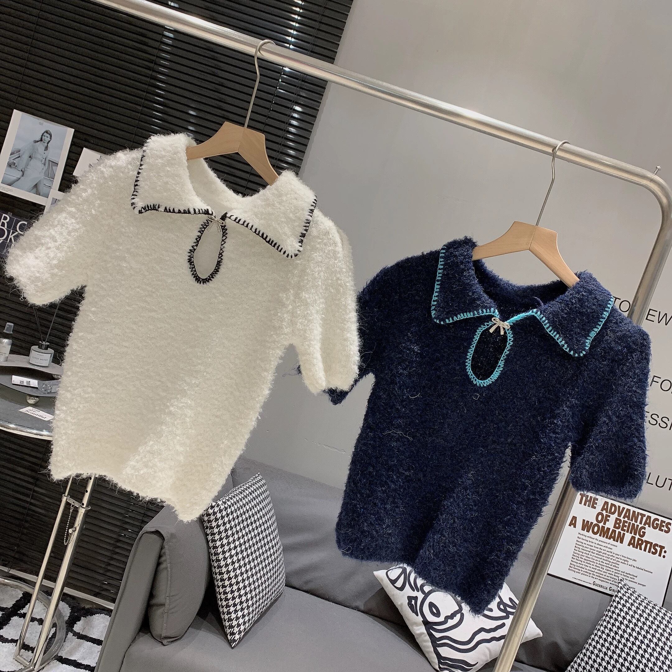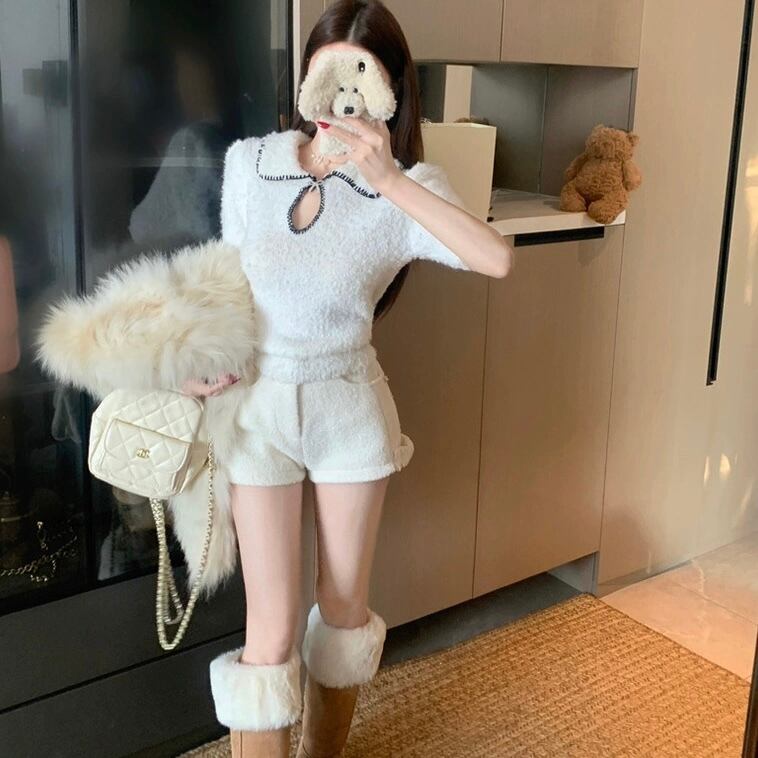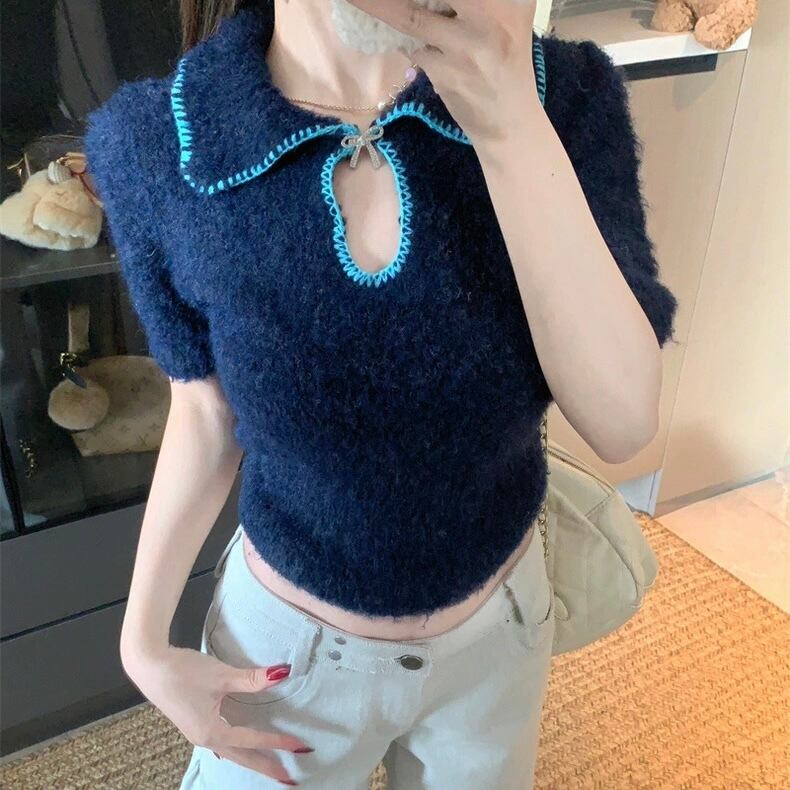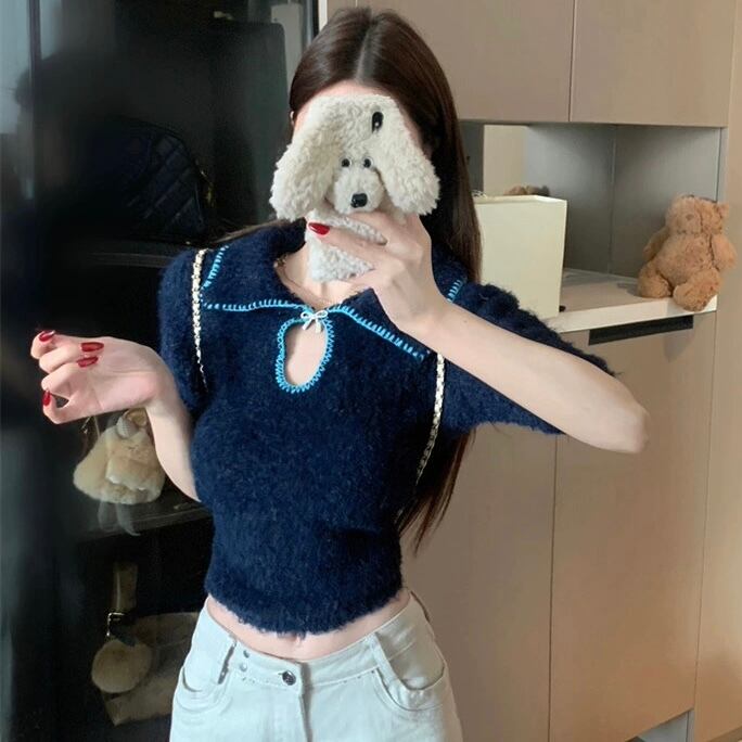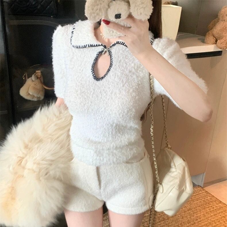 【tops】2色リボンブローチ付きニット半袖トップス RH2880