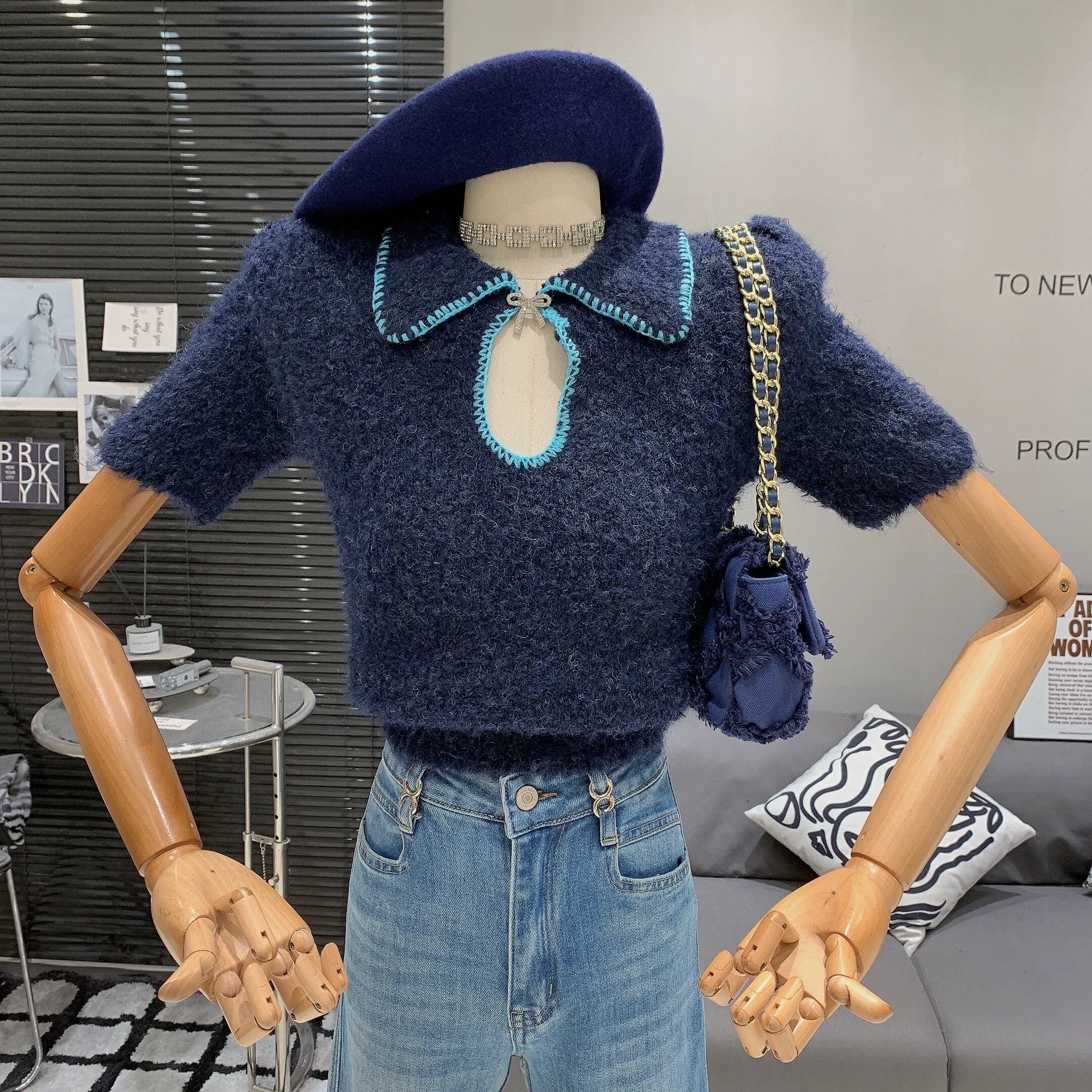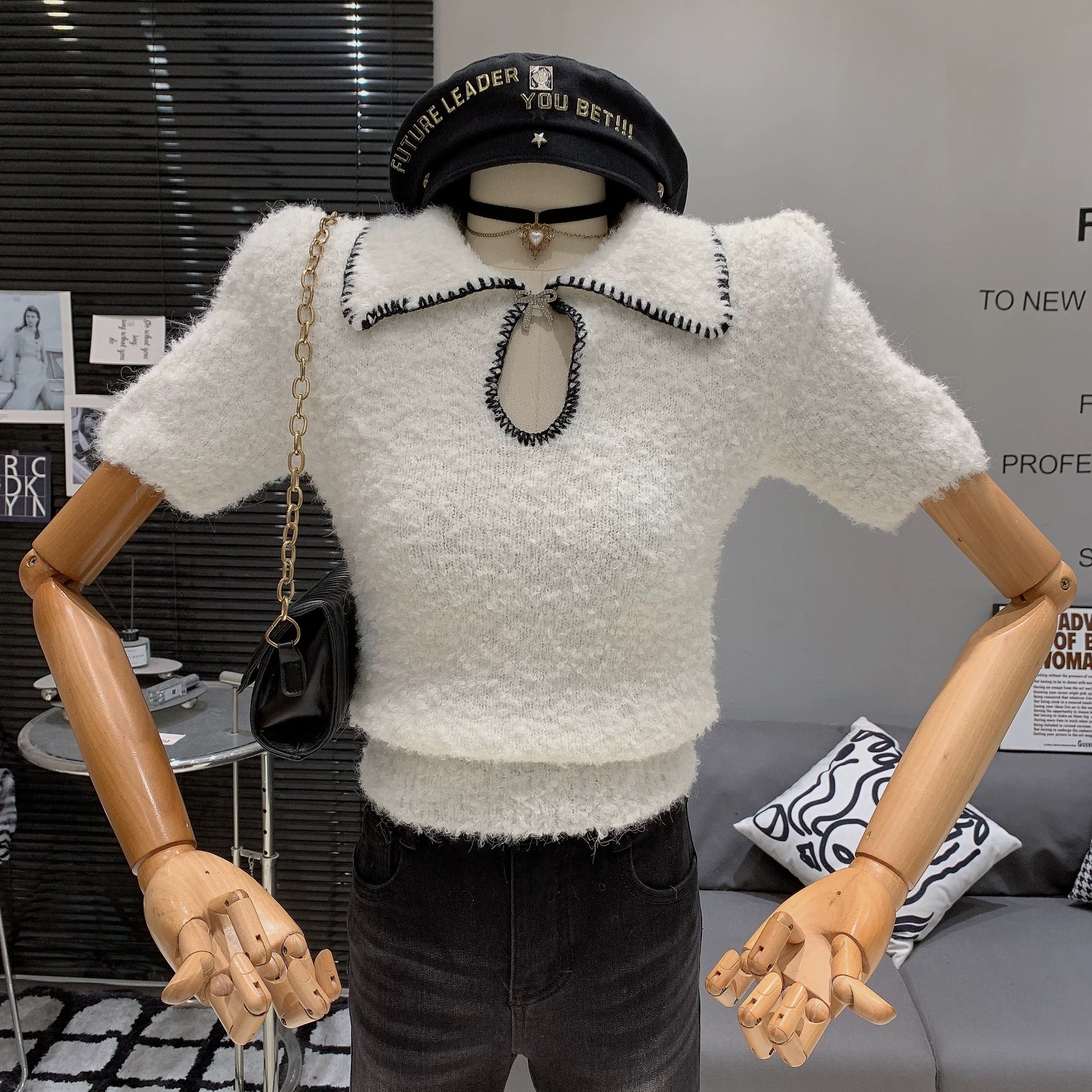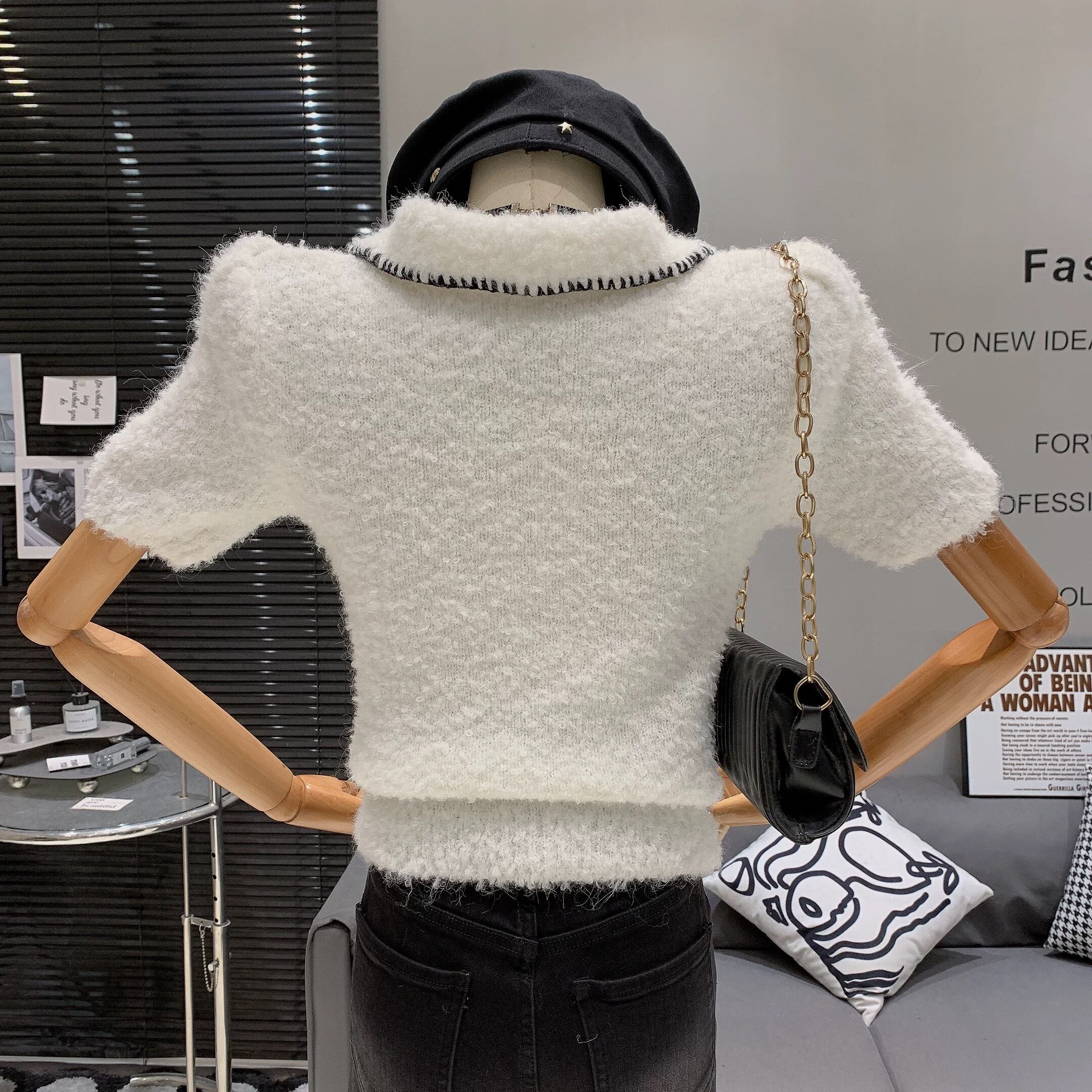 【tops】2色リボンブローチ付きニット半袖トップス RH2880