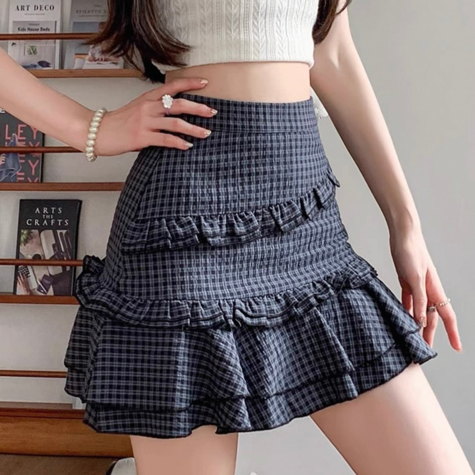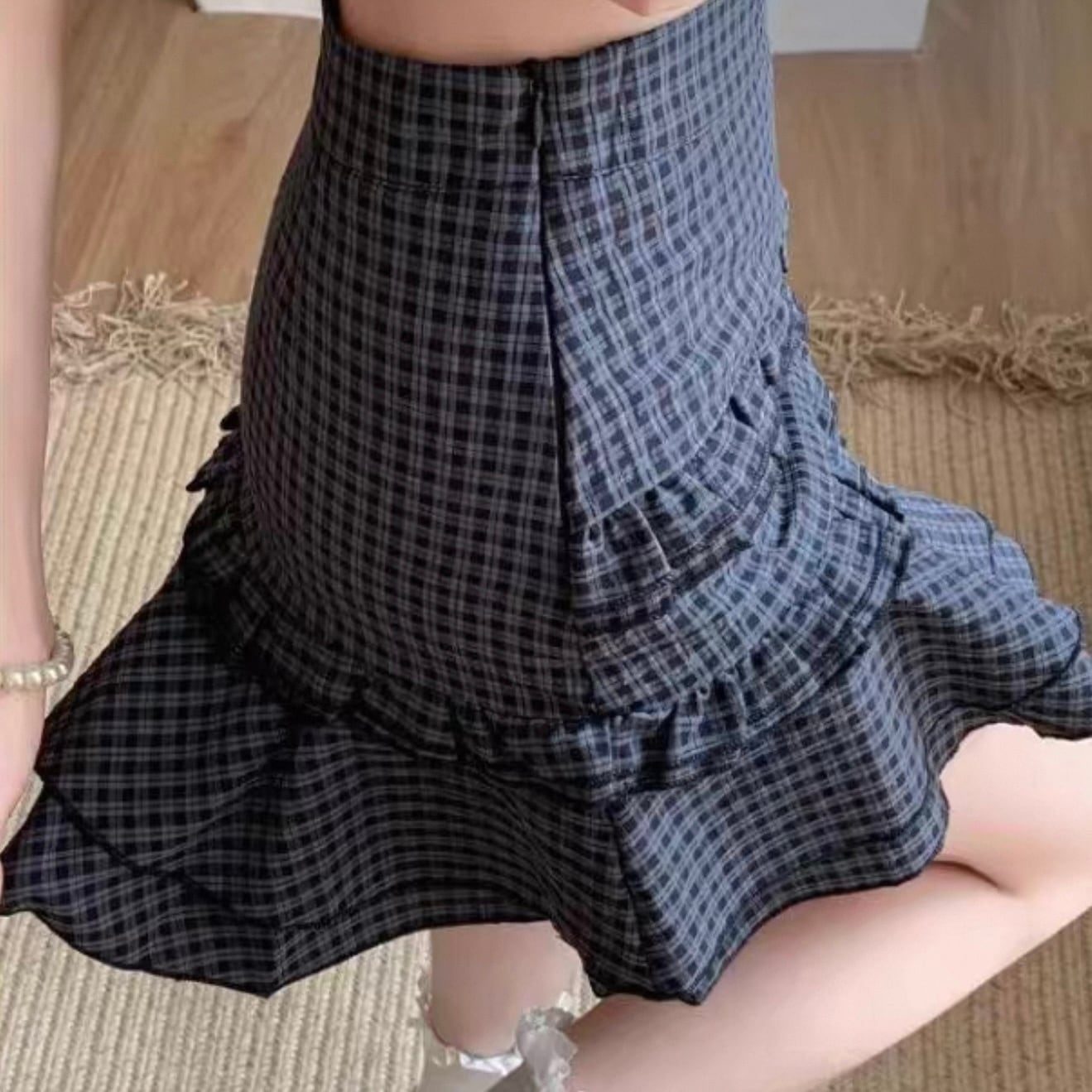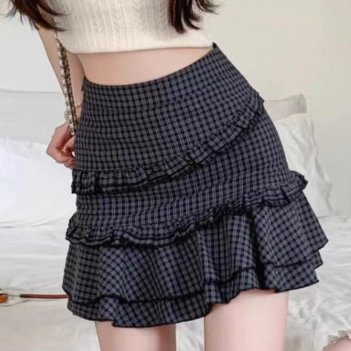 【bottoms】S〜2XLチェック柄フリルAラインスカート HK0352