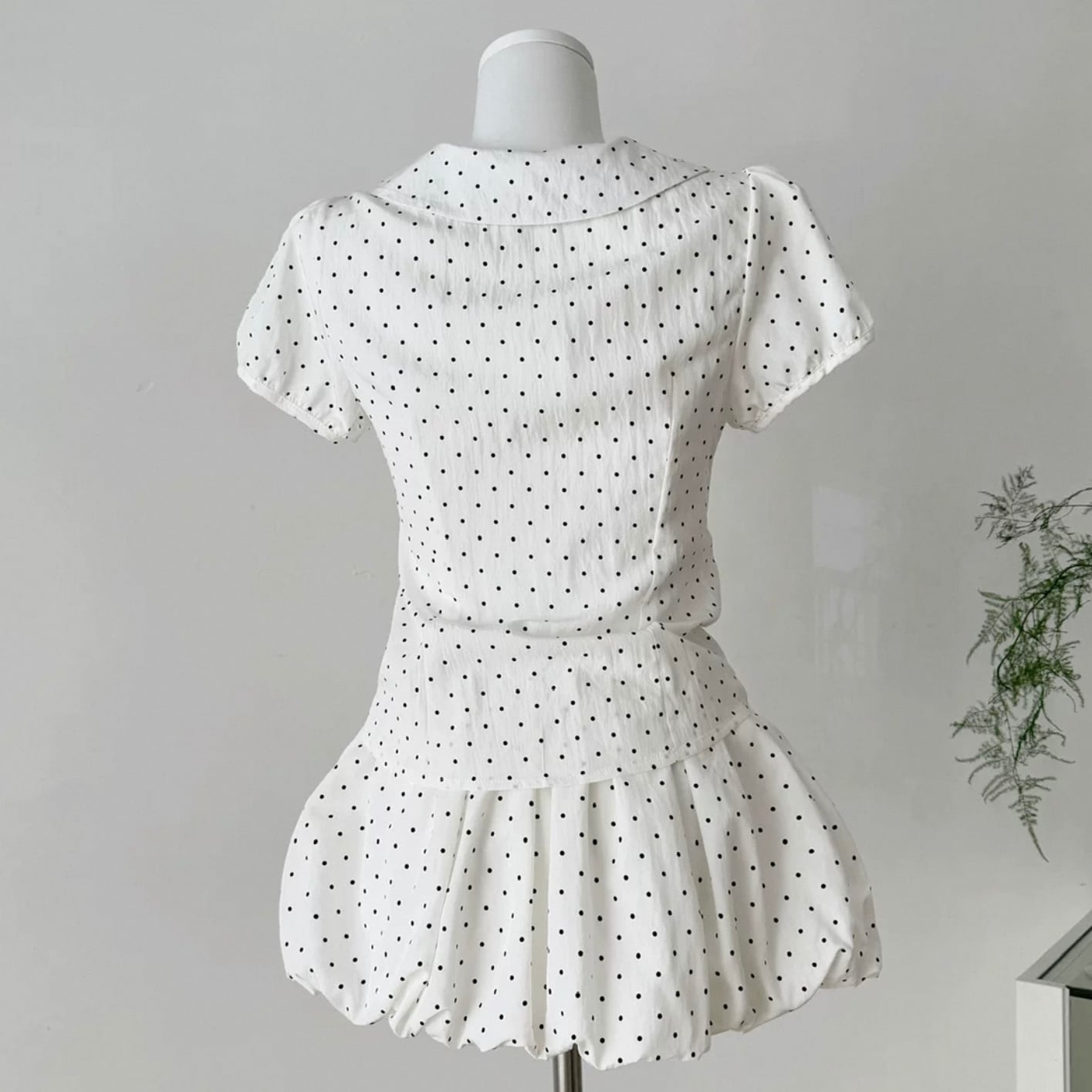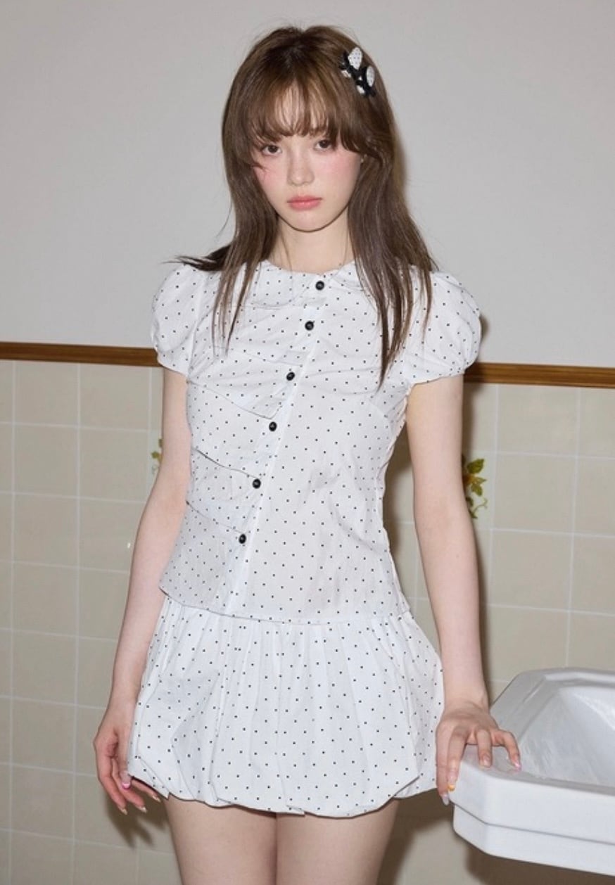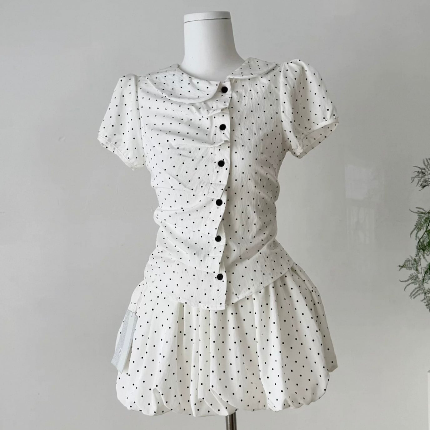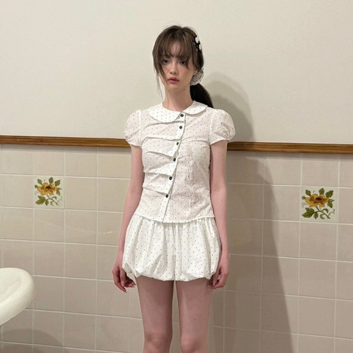 【set】プリーツデザインドット柄半袖ブラウス×インパン付きフリルスカート HK0356